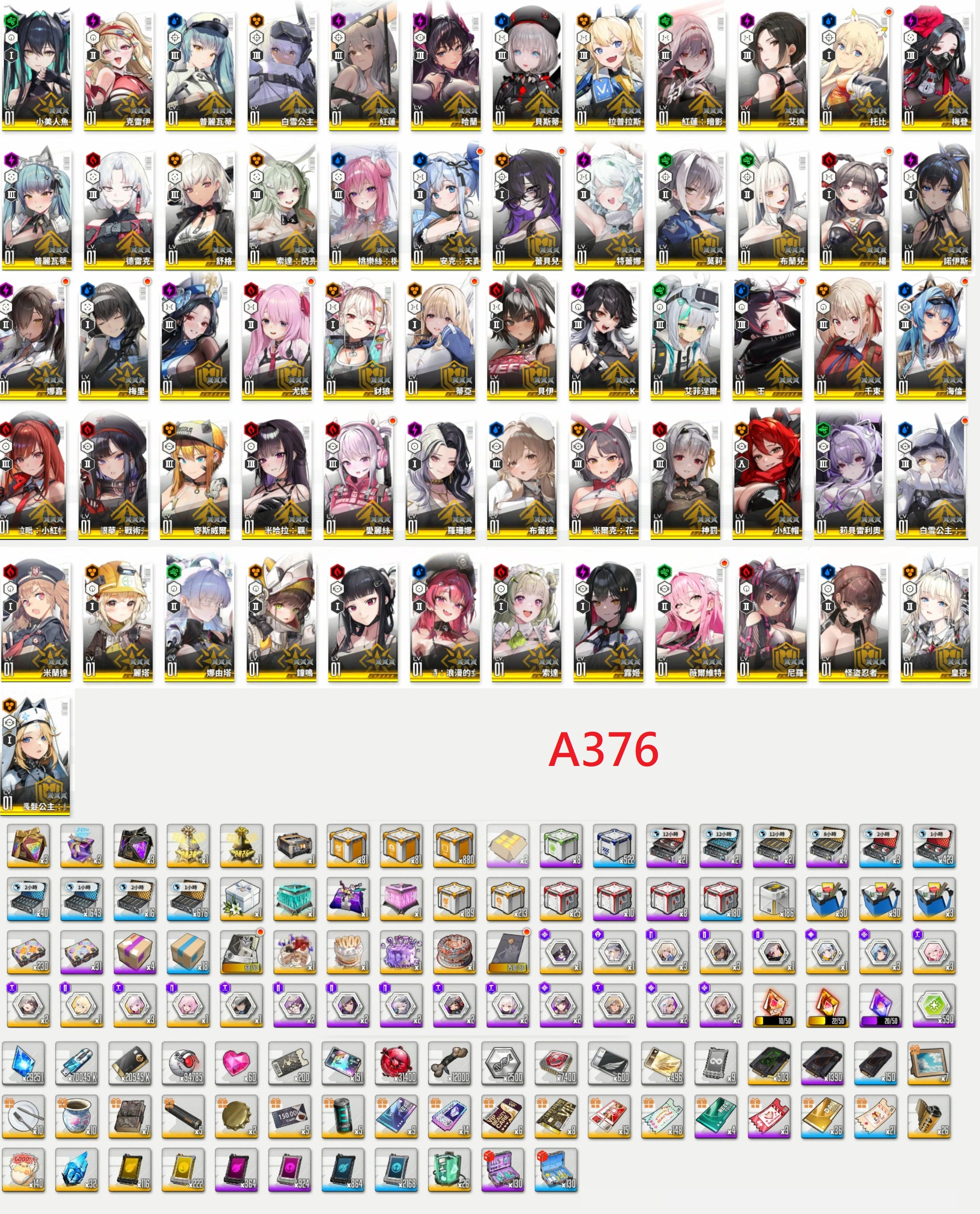 【A376】台港澳【12500元】92SSR【白雪公主(重型武裝)x2+泳裝桃樂絲+娜由塔+莉貝雷利奧+小美人魚+皇冠+拉毗(小紅帽)+小紅帽+暗影紅蓮+米哈拉+神罰+紅蓮+哈蘭+白雪公主+純潔長髮x4(3星)+鐘鳴x4(3星)+莉可麗絲:錦木千束+惡靈古堡:艾達+聖誕梅登+麗塔+蕾貝兒x2+薇爾維特x4(3星)+露姬+殺手妻子D+海倫x4(3星)+愛麗絲x4(3星)+馬斯特(女僕)+安克(女僕)x2+蒂亞(白JK)x4(3星)+娜嘉(黑JK)x4(3星)+布蘭兒(白兔)+普利瓦蒂+拉普拉斯+托比x2+女僕普利瓦蒂+德雷克+兔女郎索達+特蕾娜+女王坎西x2+銀華(戰術升級)+麥斯威爾+布蕾德+兔女郎米爾克+米蘭達+忍者德爾塔+豺狼+索達+尼羅+羅珊娜+貝伊+K+艾菲涅爾+梅里x2+尤妮x2+諾伊斯+舒格+梅登+貝斯蒂+克雷伊+楊x3+莫莉x4(3星)】