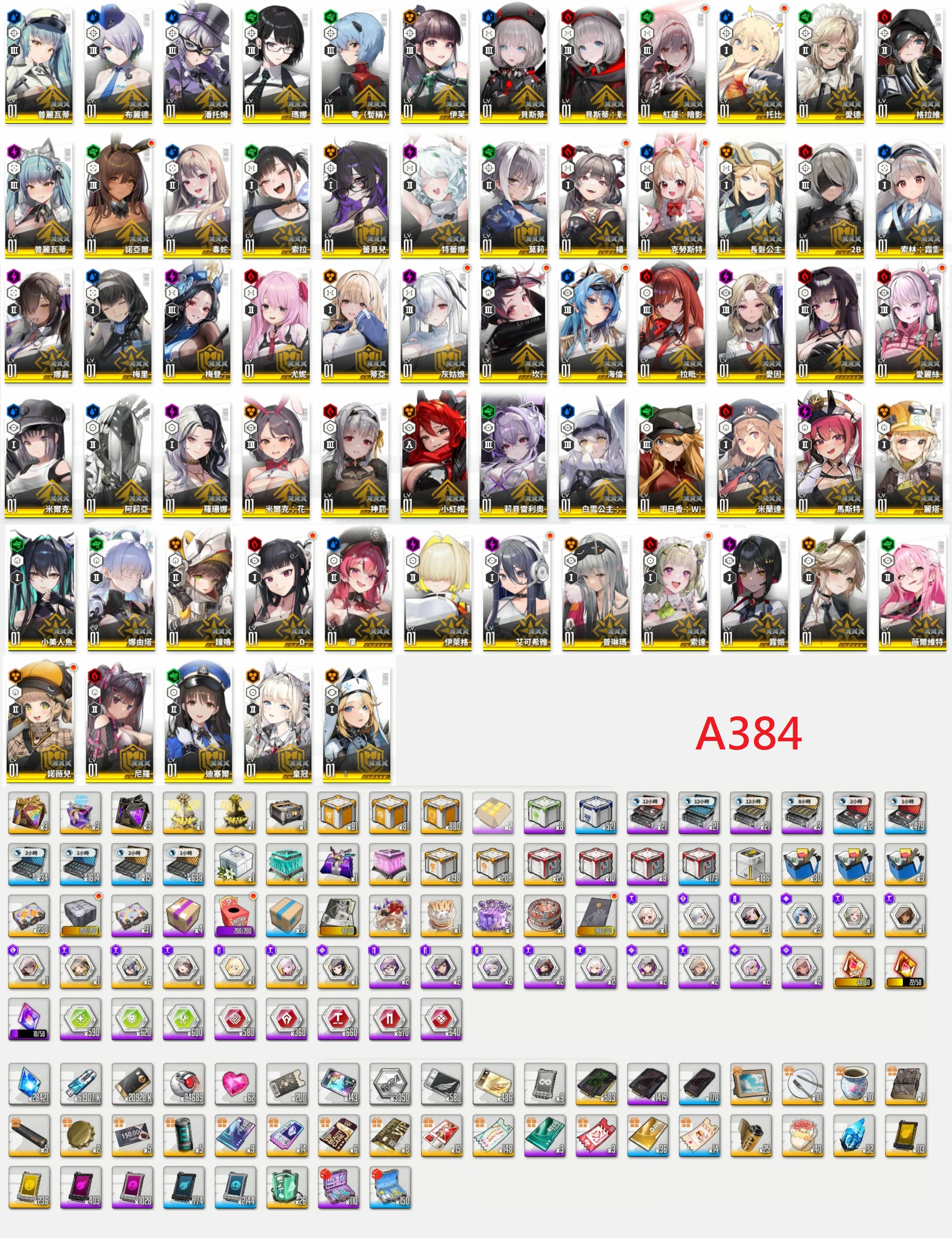 【A384】台港澳【11500元】90SSR【白雪公主(重型武裝)+娜由塔+莉貝雷利奧+小美人魚+皇冠+拉毗(小紅帽)+小紅帽+灰姑娘x2+暗影紅蓮x2+米哈拉+格拉維+神罰+長髮公主+純潔長髮x4(3星)+鐘鳴x4(3星)+劍星:伊芙+Eva:明日香(WILLE)+Eva:零(暫稱)+尼爾:2B+聖誕梅登+麗塔+兔女郎愛德+蕾貝兒+薇爾維特+露姬+殺手妻子Dx2+海倫x4(3星)+愛麗絲x2+馬斯特(女僕)+安克(女僕)+蒂亞(白JK)+娜嘉(黑JK)+諾亞爾(黑兔)x2+托比x2+女王坎西x4(3星)+普利瓦蒂+貝斯蒂(戰術升級)+女僕普利瓦蒂+霜月索琳+兔女郎米爾克+米蘭達+特蕾娜+愛因+馬斯特+伊萊格+艾可希雅x3+普林馬+索達x2+諾薇兒x2+尼羅+迪賽爾+米爾克+阿莉亞+羅珊娜+楊x2+梅里+尤妮+克勞斯特x2+毒蛇+索拉+布麗德+潘托姆+瑪娜+貝斯蒂+愛德+莫莉x4(3星)】