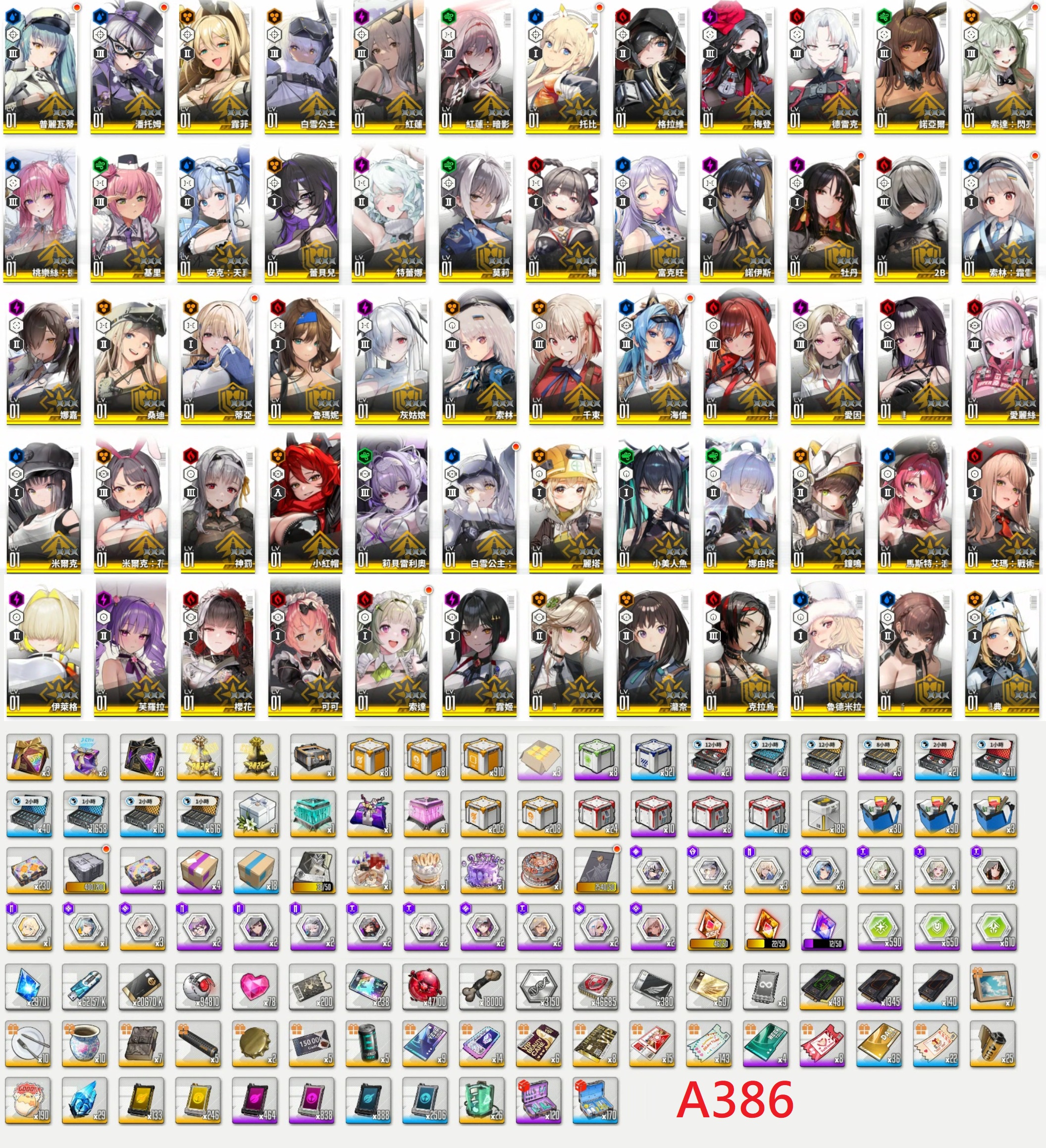 【A386】台港澳【9000元】86SSR【白雪公主(重型武裝)x3+泳裝桃樂絲+娜由塔+莉貝雷利奧+小美人魚+拉毗(小紅帽)+小紅帽+灰姑娘+暗影紅蓮+米哈拉+格拉維+神罰+紅蓮+白雪公主+純潔長髮x4(3星)+鐘鳴x4(3星)+莉可麗絲:錦木千束+莉可麗絲:井之上瀧奈+尼爾:2B+麗塔+兔女郎愛德+蕾貝兒+露姬+海倫x4(3星)+牡丹x4(3星)+愛麗絲+馬斯特(女僕)+安克(女僕)+蒂亞(白JK)x4(3星)+娜嘉(黑JK)+諾亞爾(黑兔)+霜月索琳x4(3星)+托比x2+普利瓦蒂x2+德雷克+兔女郎索達x2+愛因+兔女郎米爾克+特蕾娜+艾瑪(戰術升級)+忍者德爾塔+伊萊格+芙蘿拉+櫻花+可可+索達x2+克拉烏+魯德米拉+楊+富克旺+諾伊斯+桑迪+魯尼瑪+索琳+基里+露菲+潘托姆x2+梅登+米爾克+莫莉x4(3星)】