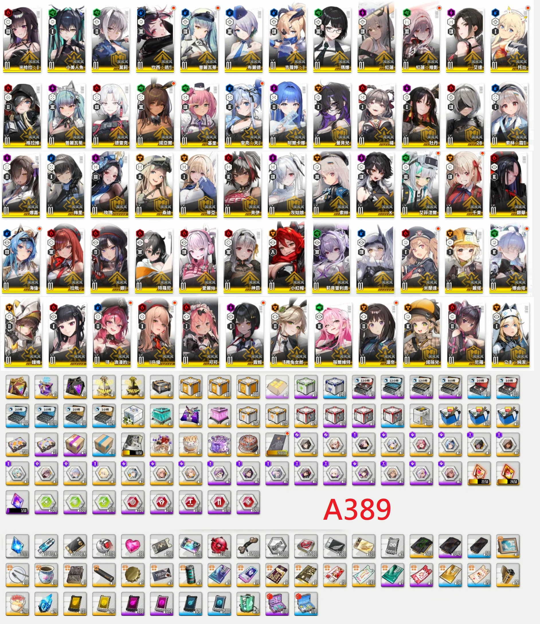 【A389】台港澳【8500元】90SSR【白雪公主(重型武裝)+娜由塔x2+莉貝雷利奧+小美人魚+拉毗(小紅帽)+小紅帽+灰姑娘+暗影紅蓮x2+米哈拉+格拉維+神罰+紅蓮+純潔長髮x4(3星)+鐘鳴x4(3星)+莉可麗絲:錦木千束x2+莉可麗絲:井之上瀧奈x2+惡靈古堡:艾達+尼爾:2B+聖誕梅登+聖誕吉羅婷+麗塔+兔女郎艾德+蕾貝兒+薇爾維特+露姬x2+殺手妻子D+海倫x4(3星)+牡丹+愛麗絲+馬斯特(女僕)x2+安克(女僕)x2+蒂亞(白JK)+娜嘉(黑JK)+諾亞爾(黑兔)x3+普利瓦蒂x4(3星)+托比x2+女王坎西x2+女僕普利瓦蒂+德雷克+阿爾卡娜+霜月索琳+米蘭達x2+銀華(戰術升級)+艾瑪(戰術升級)+可可+諾薇兒+尼羅+特羅尼+梅里+桑迪+貝伊+索琳+K+艾菲涅爾x2+銀華+楊+基里+布麗德+瑪娜+莫莉x4(3星)】