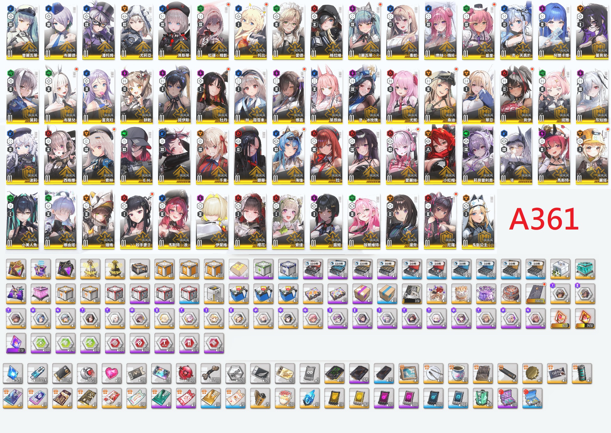【A361】台港澳【7500元】90SSR【白雪公主(重型武裝)+泳裝桃樂絲+娜由塔+莉貝雷利奧+小美人魚+拉毗(小紅帽)+小紅帽+灰姑娘+暗影紅蓮x2+米哈拉+格拉維+諾雅+純潔長髮x4(3星)+鐘鳴x4(3星)+莉可麗絲:錦木千束+莉可麗絲:井之上瀧奈+聖誕梅登+麗塔x2+蕾貝兒+薇爾維特+露姬+牡丹x4(3星)+海倫x4(3星)+殺手妻子Dx2+愛麗絲x2+馬斯特(女僕)+安克(女僕)+蒂亞(白JK)+娜嘉(黑JK)x2+布蘭兒(白兔)x2+托比x3+普利瓦蒂+阿爾卡娜+霜月索琳+女僕普利瓦蒂x2+女王坎西+伊萊格+櫻花+索達+尼羅x2+馬斯特x2+銀華+萊昂娜+尤妮+桑迪x2+貝伊x2+波利+西格娜+索琳x3+E.H+富克旺+餅乾+諾伊斯+毒蛇+基里x2+潘托姆+尤莉亞+貝斯蒂+愛德+布麗德+莫莉x4(3星)】