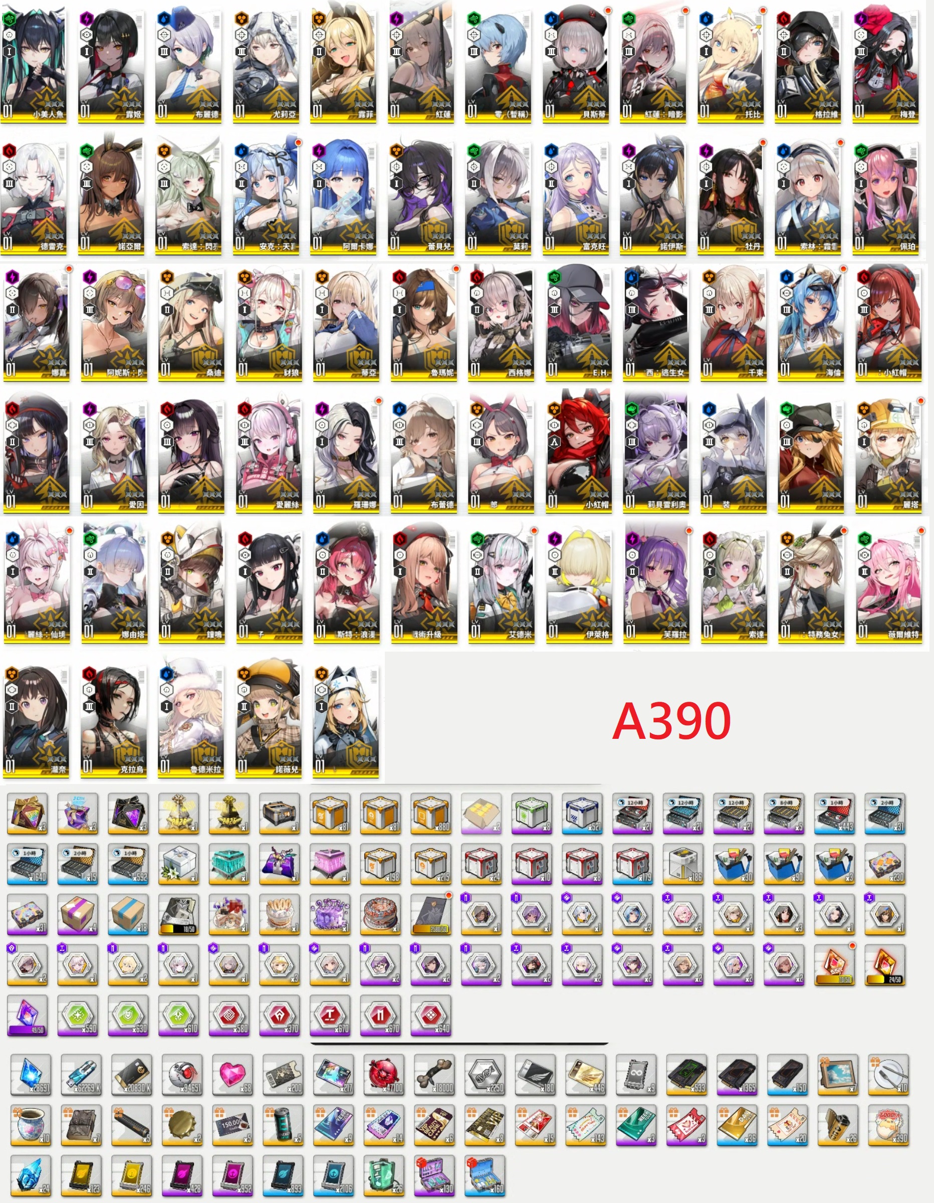 【A390】台港澳【7000元】101SSR【白雪公主(重型武裝)+娜由塔+莉貝雷利奧+小美人魚+拉毗(小紅帽)+小紅帽+暗影紅蓮x3+米哈拉+格拉維+紅蓮+純潔長髮x4(3星)+鐘鳴x4(3星)+莉可麗絲:錦木千束+莉可麗絲:井之上瀧奈+Eva:明日香(WILLE)+Eva:零(暫稱)+泳裝阿妮斯+麗塔x4(3星)+兔女郎愛德x2+蕾貝爾+薇爾維特x4(3星)+露姬+殺手妻子D+海倫x4(3星)+牡丹x4(3星)+馬斯特(女僕)+安克(女僕)x2+蒂亞(白JK)+娜嘉(黑JK)x2+諾亞爾(黑兔)+托比x3+德雷克+兔女郎索達+阿爾卡娜+霜月索琳x2+女王坎西+豺狼+銀華(戰術升級)+艾瑪(戰術升級)+愛因+布蕾德+兔女郎米爾克+兔女郎愛麗絲x2+羅珊娜x2+魯尼瑪x2+西格娜+E.H.+桑迪+佩珀+富克旺+諾伊斯+布麗德+尤莉亞+露菲+貝斯蒂x2+梅登+艾德米x2+伊萊格+芙蘿拉x2+索達+克拉烏+魯德米拉+諾薇兒+莫莉x4(3星)】