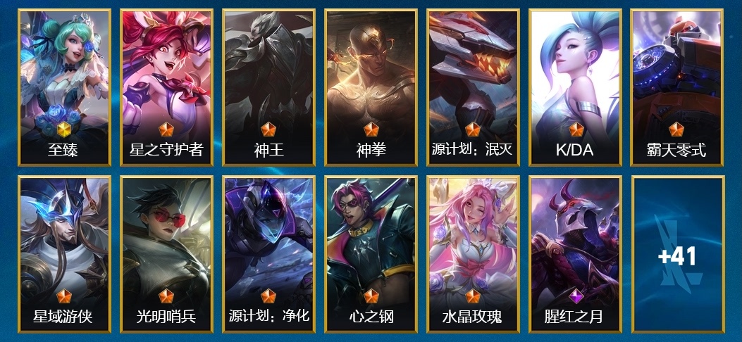 李青-地下拳王,阿卡麗-K/DA ALL OUT,布里茨-擂臺皇帝,燼-西部牛仔,格溫-水晶玫瑰,永恩-心之鋼,墨菲特-無畏號,悠米-戰鬥校長,拉克絲-星之守護者,德萊厄斯-神王,伊澤瑞爾-心之鋼,庫奇-柯基,派克-怨之砂,艾克-探夢奇旅,金克絲-星之守護者,內瑟斯-盜夢者,伊芙琳-探戈靈魂,薇恩-水晶玫瑰,薩勒芬妮-K/DA ALL OUT,泰達米爾-國王,加里奧-霸天戰鷹,卡莎-電玩女神,吉格斯-兔寶寶,艾希-王牌司令,薇恩-光明哨兵,卡茲克-霸天異形,金克絲-光耀之芒,格雷福斯-黑暗騎士,卡特琳娜-戰鬥學院,沃利貝爾-山海繪卷,雷克頓-源計劃:泯滅,燼-腥紅之月,傑斯-水晶玫瑰,薩勒芬妮-水晶玫瑰,雷克頓-鱷霸,潘森-清剿小隊,阿狸-焰尾妖狐,提莫-熊貓,崔斯特-星域遊俠,薇古絲-魅惑女巫,李青-神拳,內瑟斯-創世魔神,瑟提-心之鋼,蔚-女警官,娑娜-繆斯女神,庫奇-電玩上校,賽恩-霸天零式,嘉文四世-王牌上將,易-斬星魔劍,薇恩-源計劃:淨化,格溫-至臻 水晶玫瑰,凱隱-心之鋼,艾希-女皇,艾瑞莉婭-蓮花之令
