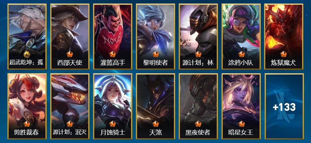 墨菲特-冰川巨獸,賈克斯-光明騎士,慎-腥紅之月 鬼武者,璐璐-寒冬精靈,璐璐-創星之靈,嘉文四世-孤膽英豪,布隆-獵龍勇士,瑟提-龍騰虎躍,艾希-西部天使,奧莉安娜-星之守護者,墨菲特-無畏號,金克絲-塗鴉小隊,賈克斯-武神,索拉卡-冬境仙靈,希瓦娜-冰霜亞龍,格雷福斯-泳池派對,拉克絲-星之守護者,莫甘娜-刀鋒女王,劫-天煞,蓋倫-死亡騎士,內瑟斯-單身貴族,吉格斯-科學狂人,孫悟空-三昧真火,莫甘娜-玉劍傳說 蒼鸞,奧莉安娜-光耀之心,趙信-趙雲 子龍,易-源計劃:林,提莫-靈魂蓮華,卡蜜爾-星域審判官,傑斯-光明之錘,佐伊-煥影迎春,希瓦娜-黯黑魔龍,安妮-銀河魔裝機神,厄運小姐-西部牛仔,阿利斯塔-哞利斯塔,銳雯-電玩勇者,銳雯-黎明使者,璐璐-馴龍女巫,努努和威朗普-喪屍,吉格斯-兔寶寶,阿木木-小小騎士,菲奧娜-皇家守衛,凱爾-靈能特工,凱特琳-鐵血狙擊手,墨菲特-霸天巨獸,艾希-黑暗騎士,艾瑞莉婭-冰霜之刃,雷克頓-鱷霸,格雷福斯-絕命機甲,蓋倫-鋼鐵軍團,娜美-緋金鮫靈,韋魯斯-白色死神,銳雯-玉劍傳說 武劍仙,德萊厄斯-福牛守護者,艾瑞莉婭-玉劍傳說 舞劍仙,錘石-未來戰士,卡蜜爾-原始碼,加里奧-地獄火,黛安娜-烈焰仙子,卡特琳娜-閉月之顏 貂蟬,亞託克斯-腥紅之月,蔚-女警官,蓋倫-神王,金克絲-末路狂花,娜美-鮫妮座人,吉格斯-奧術大師,泰達米爾-關羽 雲長,泰達米爾-光耀之刃,艾克-時之砂,永恩-水晶玫瑰,璐璐-邪惡女巫,趙信-獵龍勇士,迦娜-星之守護者,古拉加斯-碎桶者,阿克尚-戰鬥學院,盧錫安-絕命槍手,布里茨-兔寶寶,崔斯特-王牌艦長,布隆-末路管家,蓋倫-張遼 文遠,雷克頓-枯萎之壤,卡薩丁-掠星魔刃,布里茨-戰場之王,德萊文-破敗軍團,金克絲-神龍烈焰,艾克-塗鴉小隊,燼-滅跡行者,德萊厄斯-西部魔影,卡特琳娜-海賊魅影,阿木木-地獄火,菲奧娜-緋金麗刃,嘉文四世-暗星,崔絲塔娜-歐米伽小隊 魔鬼傘兵,孫悟空-地獄行者,亞索-靈魂蓮華,亞索-黑夜使者,內瑟斯-煉獄魔犬,嘉文四世-呂布 奉先,提莫-大魔王,慎-未來戰士,蓋倫-海上霸主,艾希-御星魔矢,卡特琳娜-抵抗軍玫瑰,蒙多醫生-冰封王子 蒙多,莎彌拉-塗鴉小隊,凱南-超武乾坤:電弧,崔斯特-逍遙賭俠,傑斯-神奇先驅,易-暗影,艾希-王牌司令,卡特琳娜-死亡誓約,趙信-猛虎下山,金克絲-光耀之芒,卡特琳娜-戰鬥學院,凱南-奈落之炎,菲茲-銀河魔裝機神,雷克頓-源計劃:泯滅,菲茲-兔寶寶,布蘭德-靈魂烈焰,薩勒芬妮-悅鼓春生,莎彌拉-靈能特工,庫奇-海牛騎手,阿卡麗-銀色之牙,布隆-聖誕老人,菲奧娜-源計劃:火,德萊文-緋金戰斧,拉克絲-暗星女王,韋魯斯-蒼穹之光,迦娜-玉劍傳說 風仙子,蔚-燎原烈焰,蕾歐娜-月蝕騎士,辛吉德-衝浪高手,德萊厄斯-灌籃高手,娑娜-繆斯女神,格溫-剪勝裁春,嘉文四世-王牌上將,凱爾-末世天使,拉克絲-鋼鐵軍團,蔚-虎痴之拳,瑟提-超武乾坤:孤拳,艾希-女皇,阿木木-驚悚派對,孫悟空-美猴王,加里奧-風執事,金克絲-清剿小隊,銳雯-光明哨兵