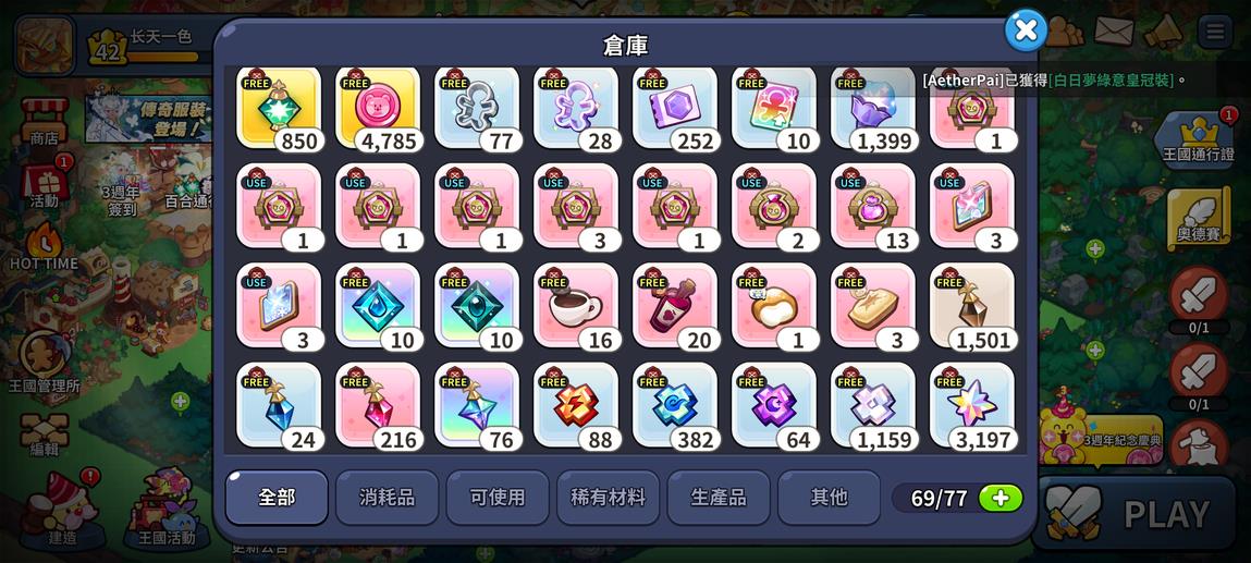 薑餅人王國 國際服,不想玩了,出了回本。聖黴果伺服器。 滿星焦糖布丁,一星黃金起司,版本強力餅乾都在,競技場很好打,體力一萬多,不愁不夠用。 工會排名很高,鑽石抽卡很多,推圖還能有十來萬,生產格子都是滿級,一鍵生產解放雙手。 地標等級高都在,價格實惠,適合遊玩,詳細資源如圖。