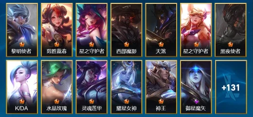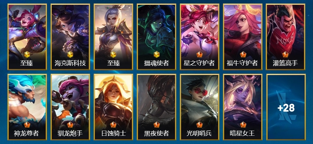 金克絲-至臻 喵喵魅影,崔斯特-逍遙賭俠,吉格斯-兔寶寶,易-暗影,璐璐-寒冬精靈,奧拉夫-鐵哥們兒,洛-甜心之翎,薇恩-光明哨兵,卡茲克-霸天異形,墨菲特-霸天巨獸,賈克斯-武神,卡爾瑪-光明騎士,永恩-靈魂蓮華,索拉卡-星域學者,奧拉夫-黑暗騎士,韋魯斯-覓心射手,易-神龍尊者 馭風嘯龍,厄運小姐-福牛守護者,莫甘娜-魅惑女巫,娜美-玉劍傳說 寒潭夭夭,阿狸-焰尾妖狐,菲奧娜-玉劍傳說 無雙,韋魯斯-蒼穹之光,拉克絲-暗星女王,艾瑞莉婭-玉劍傳說 舞劍仙,崔絲塔娜-馴龍炮手,安妮-海克斯科技,辛吉德-鍊金狂士,卡特琳娜-閉月之顏 貂蟬,亞索-黑夜使者,娑娜-繆斯女神,蕾歐娜-日蝕騎士,德萊厄斯-灌籃高手,銳雯-至臻 玉劍傳說 武劍仙,金克絲-末路狂花,卡莎-神龍尊者 玉境靈龍,金克絲-星之守護者,薇恩-攝魂使者,蓋倫-海上霸主,厄運小姐-西部牛仔,德萊文-德萊德萊