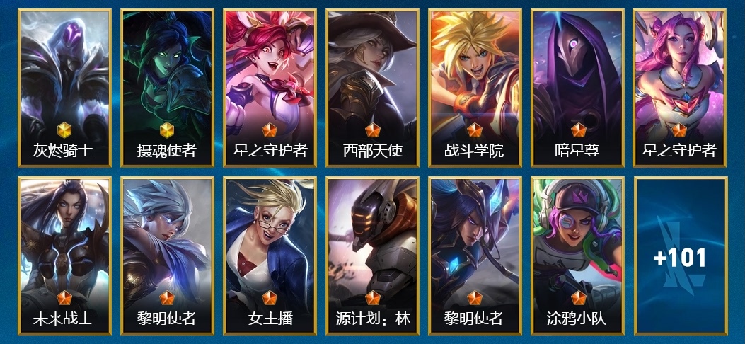 慎-腥紅之月 鬼武者,艾希-西部天使,嘉文四世-福牛守護者,永恩-心之鋼,霞-星之守護者 落,賈克斯-武神,傑斯-天啟騎士,伊澤瑞爾-心之鋼,安妮-福牛守護者,艾希-海之歌,艾瑞莉婭-西部天使,奧莉安娜-光耀之心,派克-灰燼騎士,希瓦娜-破敗軍團,易-靈魂蓮華,卡特琳娜-源計劃:雄心,錘石-盜夢暗影,易-源計劃:林,提莫-靈魂蓮華,洛-星之守護者 隕,金克絲-雙城之戰,阿利斯塔-福牛守護者,安妮-冰霜烈焰,厄運小姐-西部牛仔,艾希-極地女神,薇恩-水晶玫瑰,銳雯-黎明使者,努努和威朗普-喪屍,亞索-西部牛仔,墨菲特-霸天巨獸,艾希-黑暗騎士,崔絲塔娜-遊擊隊員,雷克頓-鱷霸,菲奧娜-泳池派對,悠米-烘焙童謠,德萊厄斯-福牛守護者,阿狸-偶像歌手,提莫-熊貓,崔斯特-星域遊俠,澤麗-源計劃:燃,崔絲塔娜-馴龍炮手,加里奧-地獄火,提莫-小蜜蜂,李青-神拳,娜美-河水之靈,瑟提-心之鋼,蔚-女警官,凱特琳-未來戰士,庫奇-電玩上校,金克絲-末路狂花,卡莎-K/DA ALL OUT,薇恩-攝魂使者,薇恩-源計劃:淨化,永恩-黎明使者,趙信-鬥魂無雙,孫悟空-鬥戰勝佛,伊澤瑞爾-戰鬥學院,凱南-超級英雄,厄運小姐-星之守護者,崔斯特-王牌艦長,薇恩-蒼穹之光,格溫-水晶玫瑰,凱南-腥紅之月,布隆-末路管家,永恩-靈魂蓮華,雷克頓-枯萎之壤,布里茨-戰場之王,維迦-穿著正裝的惡魔,德萊文-破敗軍團,伊澤瑞爾-星之守護者,迦娜-女主播,艾克-探夢奇旅,崔絲塔娜-歐米伽小隊 魔鬼傘兵,燼-暗星尊,嘉文四世-呂布 奉先,金克絲-星之守護者,伊澤瑞爾-光執事,崔斯特-未來戰士,霞-暮星之羽,薇古絲-星域巫靈,蒙多醫生-冰封王子 蒙多,莎彌拉-塗鴉小隊,崔斯特-逍遙賭俠,艾希-王牌司令,易-玉劍傳說 無極,盧錫安-西部魔影,卡薩丁-先驅行者,薇恩-光明哨兵,卡特琳娜-死亡誓約,金克絲-光耀之芒,蔚-雙城之戰,韋魯斯-暗星,傑斯-水晶玫瑰,菲茲-兔寶寶,璐璐-光耀之靈,阿卡麗-銀色之牙,德萊文-緋金戰斧,菲奧娜-源計劃:火,卡莎-星之守護者,韋魯斯-蒼穹之光,卡茲克-死亡綻放,蕾歐娜-月蝕騎士,辛吉德-衝浪高手,盧錫安-源計劃:雷,娑娜-繆斯女神,錘石-靈魂蓮華,趙信-秘密特工,布里茨-蘋果機器人,嘉文四世-王牌上將,賽恩-霸天零式,凱隱-心之鋼,艾希-女皇,加里奧-風執事,易-持胡蘿蔔的雪人