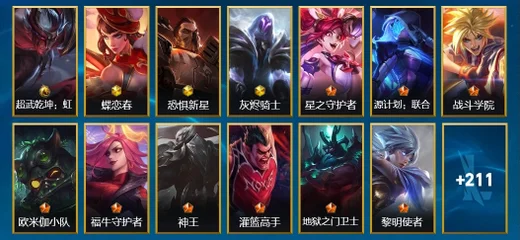 努努和威朗普-髒兮兮,阿卡麗-K/DA ALL OUT,布里茨-擂臺皇帝,阿克尚-戰鬥學院,燼-西部牛仔,奧莉安娜-暗星,崔斯特-王牌艦長,凱南-腥紅之月,嘉文四世-福牛守護者,希瓦娜-冰霜亞龍,雷克頓-枯萎之壤,安妮-福牛守護者,內瑟斯-單身貴族,奧莉安娜-光耀之心,雷恩加爾-暗黑武士,伊芙琳-緋金魅影,李青-泳池派對,菲奧娜-緋金麗刃,亞索-黑夜使者,奧拉夫-王牌勇將,菲奧娜-福牛守護者,卡蜜爾-星域審判官,阿利斯塔-福牛守護者,阿狸-風紀委員,希瓦娜-黯黑魔龍,韋魯斯-迅箭,厄運小姐-西部牛仔,阿利斯塔-哞利斯塔,艾希-極地女神,亞索-西部牛仔,易-暗影,艾希-王牌司令,亞索-鬥魂無雙,蔚-雙城之戰,蔚-源計劃:裁決,金克絲-光耀之芒,亞索-源計劃:風,燼-腥紅之月,蓋倫-鋼鐵軍團,娜美-緋金鮫靈,璐璐-光耀之靈,德萊厄斯-福牛守護者,阿狸-偶像歌手,阿卡麗-銀色之牙,提莫-熊貓,德萊文-緋金戰斧,艾瑞莉婭-玉劍傳說 舞劍仙,提莫-小蜜蜂,李青-神拳,蔚-女警官,嘉文四世-王牌上將,泰達米爾-光耀之刃,永恩-水晶玫瑰,璐璐-邪惡女巫,迦娜-星之守護者