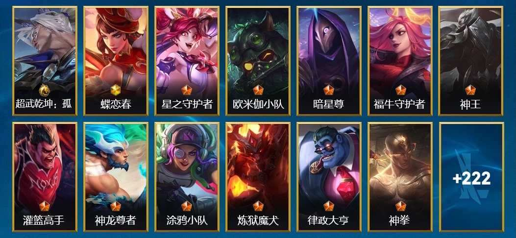 墨菲特-冰川巨獸,慎-腥紅之月 鬼武者,嘉文四世-孤膽英豪,瑟提-龍騰虎躍,加里奧-秘旅探索者,嘉文四世-福牛守護者,內瑟斯-NOVA 天賦覺醒,希瓦娜-冰霜亞龍,古拉加斯-飛車暴走族,亞索-腥紅之月,劫-天煞,蒙多醫生-律政大亨 蒙多,安妮-福牛守護者,蓋倫-死亡騎士,孫悟空-三昧真火,吉格斯-科學狂人,艾瑞莉婭-西部天使,泰達米爾-惡魔之刃,庫奇-柯基,莫甘娜-NOVA 天賦覺醒,提莫-歐米伽小隊 幽靈特工,提莫-靈魂蓮華,菲奧娜-福牛守護者,阿利斯塔-福牛守護者,傑斯-光明之錘,布蘭德-神龍尊者 魔龍,德萊文-靈魂收割者,希瓦娜-黯黑魔龍,索拉卡-原始碼,阿利斯塔-黑暗騎士,阿利斯塔-哞利斯塔,薩勒芬妮-K/DA ALL OUT,銳雯-電玩勇者,努努和威朗普-喪屍,菲奧娜-皇家守衛,阿木木-小小騎士,亞索-西部牛仔,卡茲克-霸天異形,蕾歐娜-泳池派對,墨菲特-霸天巨獸,艾希-黑暗騎士,艾瑞莉婭-冰霜之刃,格雷福斯-絕命機甲,凱特琳-蝶戀春,菲奧娜-泳池派對,韋魯斯-白色死神,銳雯-玉劍傳說 武劍仙,卡蜜爾-裂帛剪春,提莫-熊貓,阿狸-焰尾妖狐,艾瑞莉婭-玉劍傳說 舞劍仙,卡蜜爾-原始碼,加里奧-地獄火,厄運小姐-電玩女神,莉莉婭-靈魂蓮華,雷克頓-泳池派對,娜美-鮫妮座人,提莫-兔寶寶,薇恩-源計劃:淨化,德萊文-鬥魂無雙,薇恩-獵龍勇士,趙信-鬥魂無雙,拉克絲-遊俠法師,奧瑞利安·索爾-灰燼領主,奧拉夫-鐵哥們兒,雷克頓-枯萎之壤,永恩-靈魂蓮華,伊澤瑞爾-星之守護者,賽娜-夢境靈探,燼-滅跡行者,德萊厄斯-西部魔影,厄運小姐-福牛守護者,圖奇-歐米伽小隊 毒針狙擊手,卡特琳娜-海賊魅影,菲奧娜-緋金麗刃,崔絲塔娜-歐米伽小隊 魔鬼傘兵,亞索-靈魂蓮華,孫悟空-地獄行者,燼-暗星尊,內瑟斯-煉獄魔犬,金克絲-星之守護者,盧錫安-未來戰士,霞-暮星之羽,拉莫斯-熔火之心,韋魯斯-迅箭,伊芙琳-探戈靈魂,卡特琳娜-抵抗軍玫瑰,阿卡麗-源計劃:暗影,卡茲克-暗星,卡莎-電玩女神,莎彌拉-塗鴉小隊,凱南-超武乾坤:電弧,艾希-王牌司令,卡特琳娜-死亡誓約,趙信-猛虎下山,薇恩-光明哨兵,伊芙琳-K/DA ALL OUT,凱南-奈落之炎,娑娜-五連搖滾鍵盤手,韋魯斯-暗星,璐璐-光耀之靈,韋魯斯-蒼穹之光,黛安娜-無限烈焰,拉莫斯-制勝金球,辛吉德-鍊金狂士,蕾歐娜-月蝕騎士,辛吉德-衝浪高手,德萊厄斯-灌籃高手,卡蜜爾-魔女,布隆-獅心,阿木木-驚悚派對,艾瑞莉婭-蓮花之令,卡莎-彈幕天使,崔絲塔娜-虎頭虎腦,賈克斯-光明騎士,薩勒芬妮-星之守護者,阿木木-殤之機器人,阿狸-K/DA ALL OUT,布蘭德-蒼穹之光,墨菲特-無畏號,霞-星之守護者 落,奧拉夫-光明哨兵,德萊厄斯-神王,莫甘娜-刀鋒女王,傑斯-天啟騎士,蔚-水晶玫瑰,內瑟斯-單身貴族,李青-NOVA 天賦覺醒,奧莉安娜-光耀之心,趙信-趙雲 子龍,伊芙琳-緋金魅影,賽娜-西部天使,凱特琳-踏春來,蔚-鐵拳執事,卡特琳娜-源計劃:雄心,奧拉夫-王牌勇將,李青-龍的傳人,菲茲-歐米伽小隊 鬼影蛙人,盧錫安-NOVA 天賦覺醒,佐伊-煥影迎春,銳雯-NOVA 天賦覺醒,維迦-我,怒角,奧瑞利安·索爾-霸天龍神,安妮-冰霜烈焰,艾希-極地女神,艾希-神龍尊者 蒼龍,吉格斯-兔寶寶,潘森-獵龍勇士,劫-衝擊之刃,凱爾-靈能特工,凱特琳-鐵血狙擊手,璐璐-泳池派對,雷克頓-鱷霸,娜美-緋金鮫靈,德萊厄斯-福牛守護者,崔斯特-星域遊俠,提莫-小蜜蜂,李青-神拳,黛安娜-烈焰仙子,亞託克斯-腥紅之月,蔚-女警官,蕾歐娜-日蝕騎士,蓋倫-神王,泰達米爾-關羽 雲長,泰達米爾-光耀之刃,卡莎-K/DA ALL OUT,菲茲-絨毛,永恩-水晶玫瑰,璐璐-邪惡女巫,孫悟空-鬥戰勝佛,迦娜-星之守護者,古拉加斯-碎桶者,努努和威朗普-髒兮兮,阿卡麗-K/DA ALL OUT,蔚-煉獄魔女,阿克尚-戰鬥學院,尼菈-鬥魂無雙,迦娜-暴風女神,崔斯特-王牌艦長,布里茨-兔寶寶,薇恩-蒼穹之光,凱南-腥紅之月,布隆-末路管家,拉克絲-睡衣守護者,德萊厄斯-熱血班長,格雷福斯-無情重炮,布里茨-戰場之王,維迦-穿著正裝的惡魔,洛-晨星之翎,奧拉夫-黑暗騎士,提莫-招財進寶,易-神龍尊者 馭風嘯龍,崔斯特-探戈靈魂,賈克斯-宗師級釣魚訓練師,阿狸-電玩女神,崔斯特-腥紅之月,伊澤瑞爾-冰川勇者,嘉文四世-暗星,賽娜-真實傷害,伊澤瑞爾-光執事,斯維因-絕代智將,蒙多醫生-冰封王子 蒙多,卡爾瑪-黎明使者,雷恩加爾-雷喵喵爾,崔斯特-逍遙賭俠,傑斯-神奇先驅,易-暗影,蕾歐娜-燒烤女神,易-玉劍傳說 無極,盧錫安-西部魔影,蔚-雙城之戰,蔚-源計劃:裁決,金克絲-光耀之芒,亞索-源計劃:風,卡特琳娜-戰鬥學院,菲茲-銀河魔裝機神,菲茲-兔寶寶,格雷福斯-末路教父,潘森-清剿小隊,薩勒芬妮-悅鼓春生,庫奇-海牛騎手,格雷福斯-戰鬥教授,德萊文-緋金戰斧,黛安娜-腥紅之月,蔚-燎原烈焰,艾瑞莉婭-鬥魂無雙,格溫-剪勝裁春,錘石-靈魂蓮華,趙信-秘密特工,嘉文四世-王牌上將,凱爾-末世天使,瑟提-超武乾坤:孤拳,艾希-女皇,加里奧-風執事,德萊文-德萊德萊