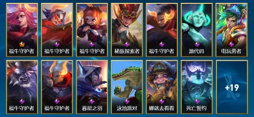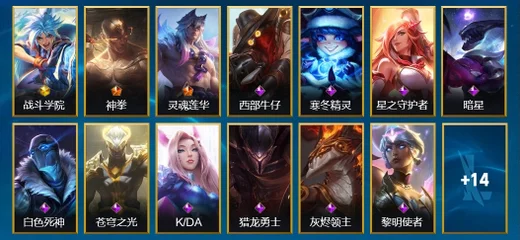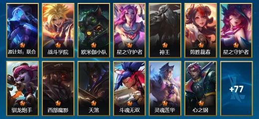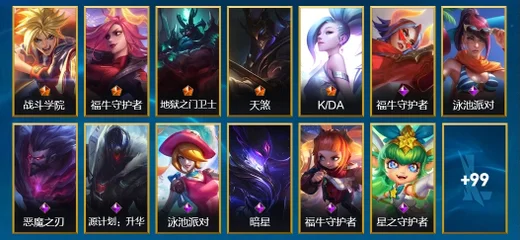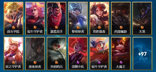 慎-腥紅之月 鬼武者,阿狸-K/DA ALL OUT,布蘭德-蒼穹之光,凱南-腥紅之月,嘉文四世-福牛守護者,雷克頓-枯萎之壤,永恩-靈魂蓮華,格雷福斯-泳池派對,布里茨-戰場之王,奧拉夫-黑暗騎士,古拉加斯-飛車暴走族,德萊文-破敗軍團,易-神龍尊者 馭風嘯龍,厄運小姐-福牛守護者,安妮-福牛守護者,內瑟斯-單身貴族,孫悟空-三昧真火,奧莉安娜-光耀之心,伊芙琳-緋金魅影,賽娜-西部天使,伊澤瑞爾-冰川勇者,菲奧娜-緋金麗刃,孫悟空-地獄行者,亞索-黑夜使者,奧拉夫-王牌勇將,金克絲-雙城之戰,菲奧娜-福牛守護者,阿利斯塔-福牛守護者,傑斯-光明之錘,阿卡麗-源計劃:暗影,厄運小姐-西部牛仔,艾希-極地女神,泰達米爾-國王,菲奧娜-皇家守衛,亞索-西部牛仔,易-暗影,艾希-王牌司令,劫-衝擊之刃,凱特琳-鐵血狙擊手,薇恩-光明哨兵,金克絲-光耀之芒,蔚-雙城之戰,格雷福斯-黑暗騎士,艾瑞莉婭-冰霜之刃,璐璐-泳池派對,格雷福斯-末路教父,娜美-緋金鮫靈,璐璐-光耀之靈,德萊厄斯-福牛守護者,阿卡麗-銀色之牙,德萊文-緋金戰斧,提莫-熊貓,布隆-聖誕老人,黛安娜-無限烈焰,拉莫斯-制勝金球,卡蜜爾-原始碼,李青-神拳,內瑟斯-創世魔神,蔚-女警官,瑟提-靈魂蓮華,奧莉安娜-哥特女僕,嘉文四世-王牌上將,泰達米爾-光耀之刃,索拉卡-蕉泥座人,阿木木-驚悚派對,拉克絲-遊俠法師,李青-至高之拳,艾瑞莉婭-蓮花之令,厄運小姐-抵抗軍戰姬