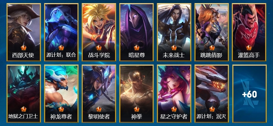 布里茨-擂臺皇帝,伊澤瑞爾-戰鬥學院,凱南-超級英雄,布蘭德-戰場之王,崔斯特-王牌艦長,薇恩-蒼穹之光,艾希-西部天使,永恩-心之鋼,霞-星之守護者 落,永恩-靈魂蓮華,吉格斯-戰場之王,德萊文-破敗軍團,易-神龍尊者 馭風嘯龍,劫-天煞,伊澤瑞爾-心之鋼,吉格斯-科學狂人,沃裡克-古神,艾克-探夢奇旅,希瓦娜-破敗軍團,燼-暗星尊,亞索-黑夜使者,錘石-盜夢暗影,阿狸-幻夢甜心,劫-靈能特工,卡莎-神龍尊者 玉境靈龍,拉莫斯-熔火之心,卡特琳娜-抵抗軍玫瑰,厄運小姐-西部牛仔,銳雯-電玩勇者,雷恩加爾-雷喵喵爾,凱南-超武乾坤:電弧,潘森-獵龍勇士,亞索-西部牛仔,艾希-王牌司令,易-玉劍傳說 無極,盧錫安-西部魔影,薇恩-光明哨兵,亞索-鬥魂無雙,格雷福斯-黑暗騎士,凱南-奈落之炎,艾希-黑暗騎士,雷克頓-源計劃:泯滅,艾瑞莉婭-冰霜之刃,燼-腥紅之月,菲茲-兔寶寶,雷克頓-鱷霸,厄運小姐-跳跳倩影,悠米-烘焙童謠,德萊文-緋金戰斧,阿狸-焰尾妖狐,黛安娜-無限烈焰,崔絲塔娜-馴龍炮手,薇古絲-魅惑女巫,提莫-小蜜蜂,李青-神拳,蔚-女警官,凱特琳-未來戰士,德萊厄斯-灌籃高手,莉莉婭-靈魂蓮華,吉格斯-奧術大師,嘉文四世-王牌上將,卡蜜爾-魔女,奧莉安娜-泳池派對,薇恩-源計劃:淨化,德萊文-鬥魂無雙,索拉卡-蕉泥座人,永恩-黎明使者,金克絲-清剿小隊,艾希-源計劃:聯合,加里奧-地獄之門衛士,艾瑞莉婭-蓮花之令,卡莎-彈幕天使,孫悟空-鬥戰勝佛