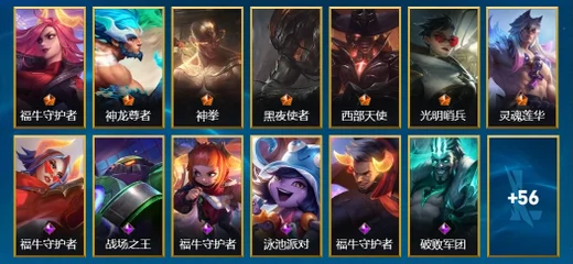 卡爾瑪-黎明使者,燼-西部牛仔,阿狸-K/DA ALL OUT,潘森-獵龍勇士,厄運小姐-星之守護者,璐璐-寒冬精靈,奧瑞利安·索爾-灰燼領主,布蘭德-蒼穹之光,艾希-王牌司令,墨菲特-無畏號,雷克頓-枯萎之壤,希瓦娜-冰霜亞龍,韋魯斯-暗星,亞索-腥紅之月,菲茲-兔寶寶,伊澤瑞爾-戰鬥學院 伊澤瑞爾 白金學長,蒙多醫生-戰爭血統 蒙多,韋魯斯-白色死神,吉格斯-科學狂人,德萊文-金牌主播,韋魯斯-蒼穹之光,李青-神拳,瑟提-靈魂蓮華,娑娜-繆斯女神,趙信-秘密特工,提莫-兔寶寶,阿利斯塔-哞利斯塔