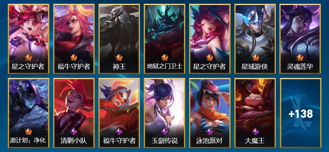 錘石-西部魔影,賈克斯-光明騎士,慎-腥紅之月 鬼武者,阿木木-殤之機器人,嘉文四世-孤膽英豪,加里奧-秘旅探索者,嘉文四世-福牛守護者,拉克絲-戰鬥學院,霞-星之守護者 落,錘石-腥紅之月,希瓦娜-冰霜亞龍,德萊厄斯-神王,古拉加斯-飛車暴走族,亞索-腥紅之月,安妮-福牛守護者,內瑟斯-單身貴族,吉格斯-科學狂人,孫悟空-三昧真火,泰達米爾-惡魔之刃,奧莉安娜-光耀之心,伊芙琳-緋金魅影,李青-泳池派對,希瓦娜-銀河魔裝機神,奧拉夫-王牌勇將,金克絲-雙城之戰,菲奧娜-福牛守護者,阿利斯塔-福牛守護者,凱南-刺客信條,布蘭德-神龍尊者 魔龍,德萊文-靈魂收割者,盧錫安-NOVA 天賦覺醒,凱特琳-泳池派對,索拉卡-原始碼,阿利斯塔-黑暗騎士,安妮-冰霜烈焰,厄運小姐-西部牛仔,阿利斯塔-哞利斯塔,艾希-極地女神,銳雯-電玩勇者,努努和威朗普-喪屍,菲奧娜-皇家守衛,阿木木-小小騎士,亞索-西部牛仔,劫-衝擊之刃,凱特琳-鐵血狙擊手,蕾歐娜-泳池派對,格雷福斯-黑暗騎士,雷克頓-鱷霸,娜美-緋金鮫靈,蓋倫-鋼鐵軍團,菲奧娜-泳池派對,悠米-烘焙童謠,德萊厄斯-福牛守護者,提莫-熊貓,阿狸-焰尾妖狐,崔斯特-星域遊俠,蔚-女警官,厄運小姐-電玩女神,莉莉婭-靈魂蓮華,金克絲-末路狂花,雷克頓-泳池派對,娜美-鮫妮座人,泰達米爾-光耀之刃,提莫-兔寶寶,奧莉安娜-泳池派對,薇恩-源計劃:淨化,德萊文-鬥魂無雙,薇恩-獵龍勇士,凱隱-攝魂獵手,璐璐-邪惡女巫,迦娜-星之守護者,古拉加斯-碎桶者,努努和威朗普-髒兮兮,布里茨-擂臺皇帝,李青-地下拳王,盧錫安-絕命槍手,凱南-超級英雄,迦娜-暴風女神,崔斯特-王牌艦長,布里茨-兔寶寶,奧拉夫-鐵哥們兒,凱南-腥紅之月,德萊厄斯-熱血班長,雷克頓-枯萎之壤,格雷福斯-無情重炮,永恩-靈魂蓮華,布里茨-戰場之王,維迦-穿著正裝的惡魔,德萊文-破敗軍團,德萊厄斯-西部魔影,厄運小姐-福牛守護者,賈克斯-宗師級釣魚訓練師,雷恩加爾-暗黑武士,卡特琳娜-海賊魅影,崔斯特-腥紅之月,安妮-小紅帽,艾克-探夢奇旅,伊澤瑞爾-冰川勇者,菲奧娜-緋金麗刃,亞索-靈魂蓮華,阿狸-幻夢甜心,賽娜-星之守護者,提莫-大魔王,金克絲-星之守護者,盧錫安-未來戰士,厄運小姐-破敗軍團,拉莫斯-熔火之心,韋魯斯-迅箭,卡茲克-暗星,布蘭德-黑暗騎士,崔斯特-逍遙賭俠,易-暗影,艾希-王牌司令,蕾歐娜-燒烤女神,金克絲-光耀之芒,蔚-雙城之戰,卡特琳娜-戰鬥學院,娑娜-五連搖滾鍵盤手,布蘭德-靈魂烈焰,菲茲-兔寶寶,韋魯斯-覓心射手,潘森-清剿小隊,黛安娜-暗黑女武神,莎彌拉-靈能特工,璐璐-光耀之靈,娜美-玉劍傳說 寒潭夭夭,格雷福斯-戰鬥教授,阿卡麗-銀色之牙,德萊文-金牌主播,德萊文-緋金戰斧,璐璐-星之守護者,菲奧娜-玉劍傳說 無雙,韋魯斯-蒼穹之光,劫-死亡誓約,迦娜-玉劍傳說 風仙子,內瑟斯-創世魔神,蔚-燎原烈焰,錘石-靈魂蓮華,趙信-秘密特工,嘉文四世-王牌上將,凱爾-末世天使,蕾歐娜-源計劃:山,艾希-女皇,布隆-獅心,加里奧-風執事,索拉卡-蕉泥座人,金克絲-清剿小隊,加里奧-地獄之門衛士,李青-至高之拳,卡莎-彈幕天使,德萊文-德萊德萊