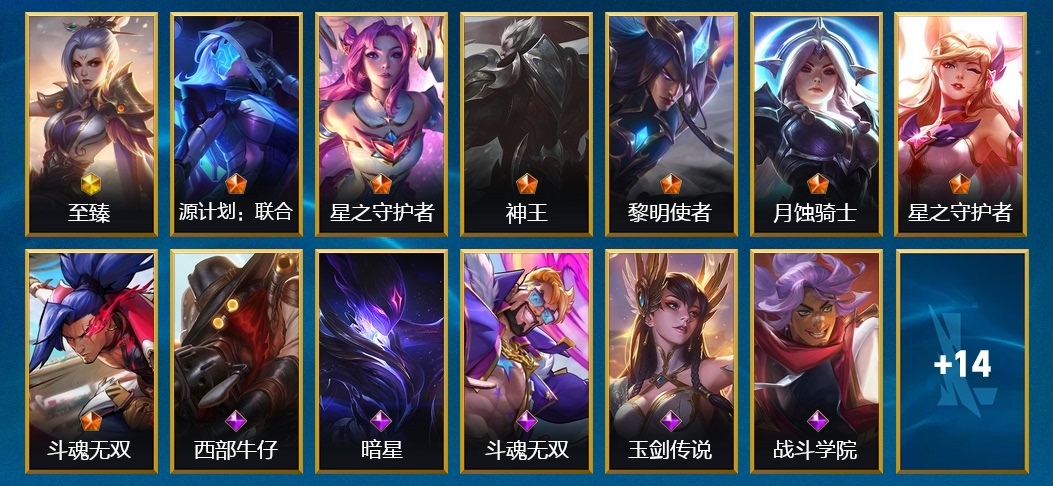 努努和威朗普-髒兮兮,阿克尚-戰鬥學院,燼-西部牛仔,亞索-西部牛仔,奧莉安娜-暗星,艾希-王牌司令,布隆-獵龍勇士,亞索-鬥魂無雙,伊芙琳-K/DA ALL OUT,阿狸-星之守護者,德萊厄斯-神王,悠米-烘焙童謠,卡莎-星之守護者,潘森-鋼鐵意志,艾瑞莉婭-玉劍傳說 舞劍仙,內瑟斯-創世魔神,蕾歐娜-月蝕騎士,蔚-女警官,銳雯-至臻 玉劍傳說 武劍仙,嘉文四世-呂布 奉先,嘉文四世-王牌上將,盧錫安-未來戰士,德萊文-鬥魂無雙,蓋倫-海上霸主,永恩-黎明使者,艾希-源計劃:聯合,厄運小姐-西部牛仔