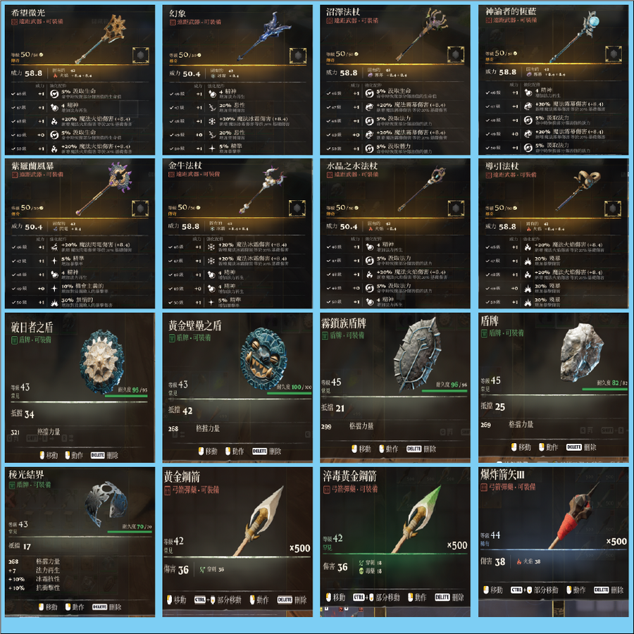 全部傳說魔杖&法杖+兩種盾+大背包+鐵造十字鎬+鐵斧+改良抓勾+幽魂滑翔翼+