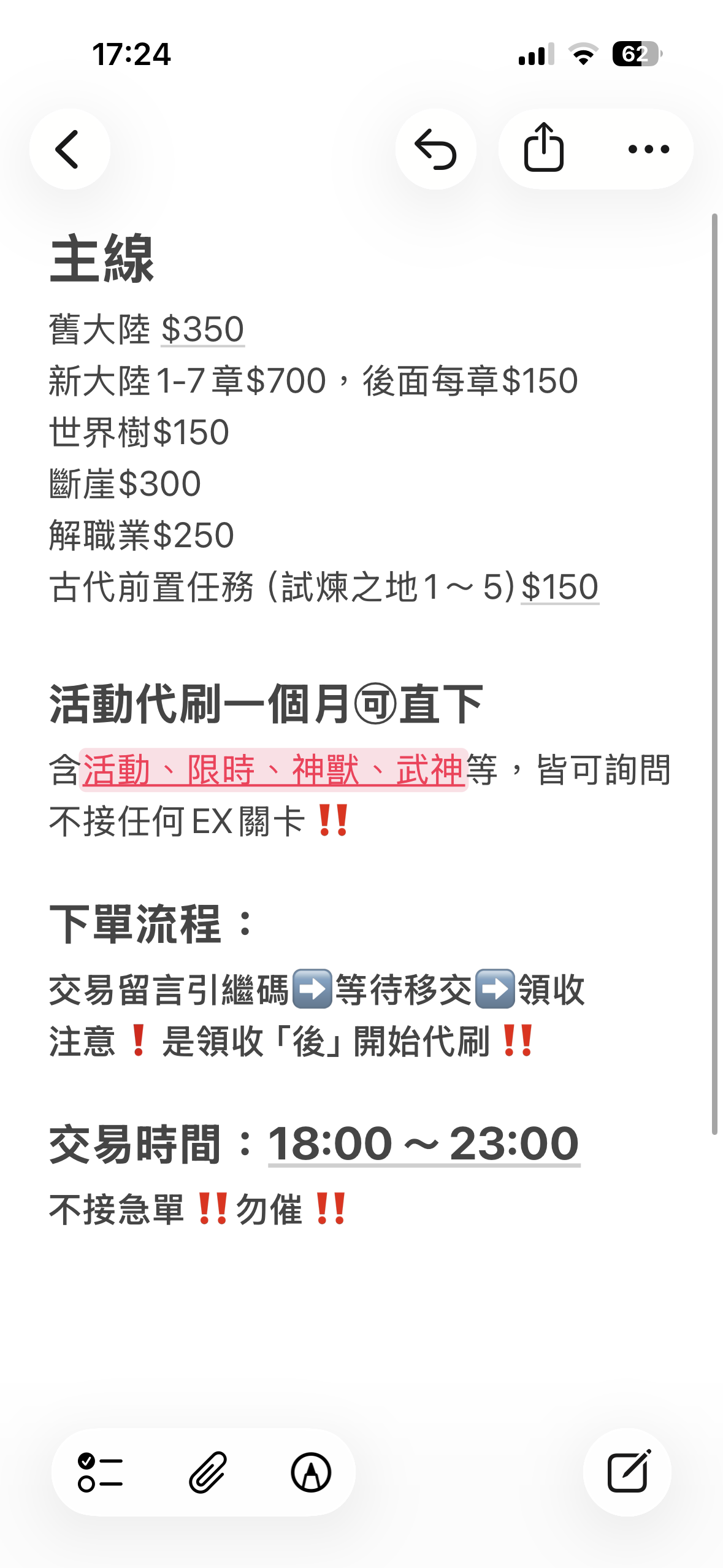 流程: 下單⭢留言引繼碼⭢等待移交⭢領收完才開始刷