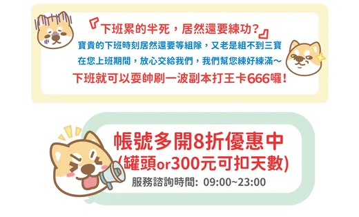 注意事項1.代練(代開您的帳號練功)無須準備裝備,全程不會使用到您的角色打怪