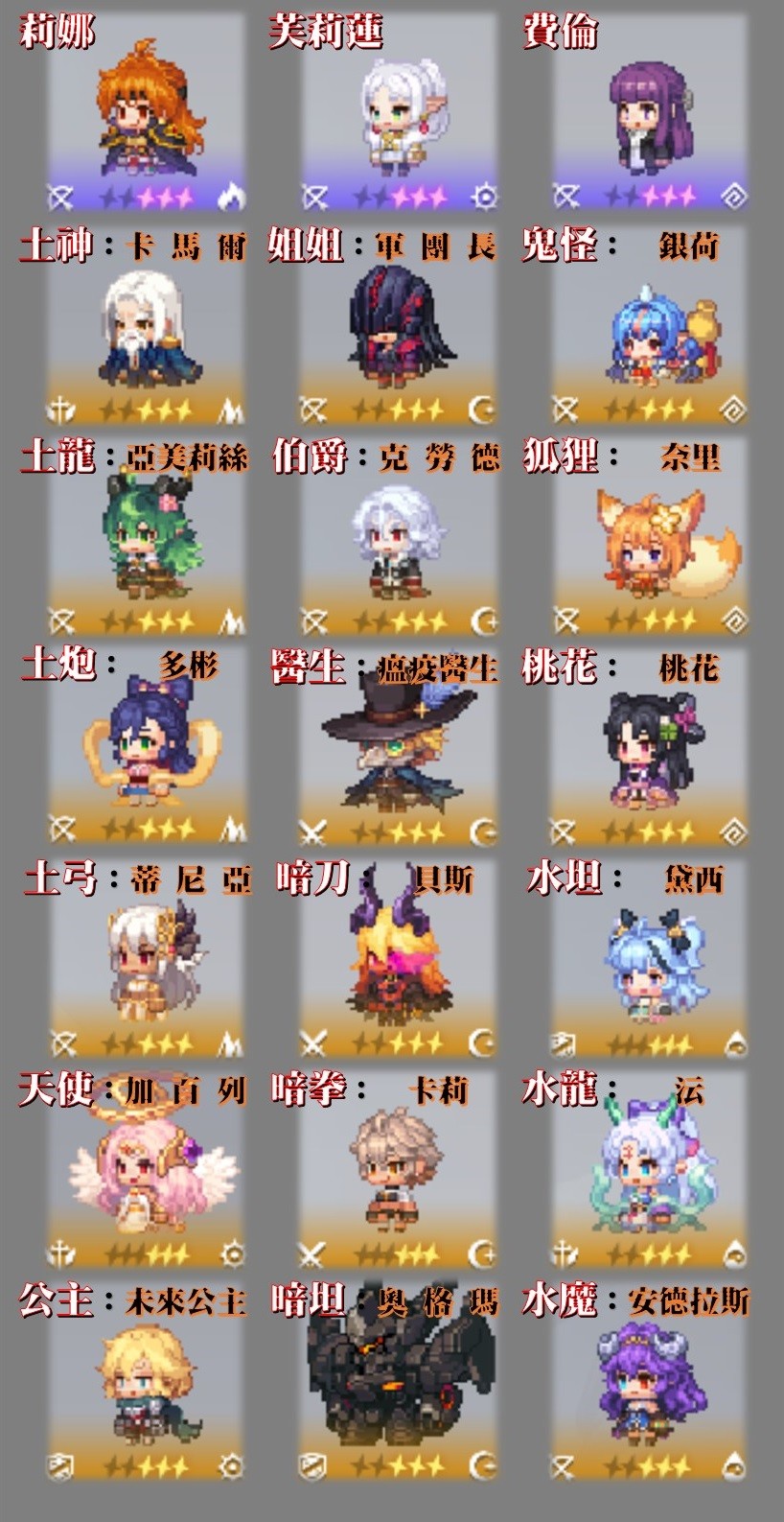 『芙莉蓮連專/費倫連專/莉娜連專/鬼怪連專/土神連專/土龍連專/土炮連專/姐姐連專/伯爵連專/醫生連專/暗刀連專/暗坦B連/暗拳連專/水坦連專/水龍連專/水魔連專/狐狸連專/光天連專/土弓連專/獵人連專/機娘連專/光希連專/暗爪連專/鳳凰連專/水狐B連/章魚連專/主教連專/白雪連專/偶像連專/火補連專/高里連專/朱菜連專/瑪姆連專/修塔爾克連專』