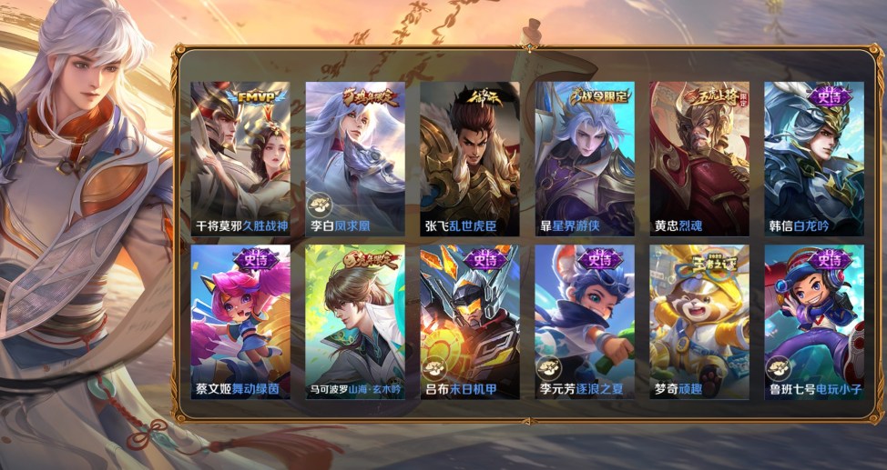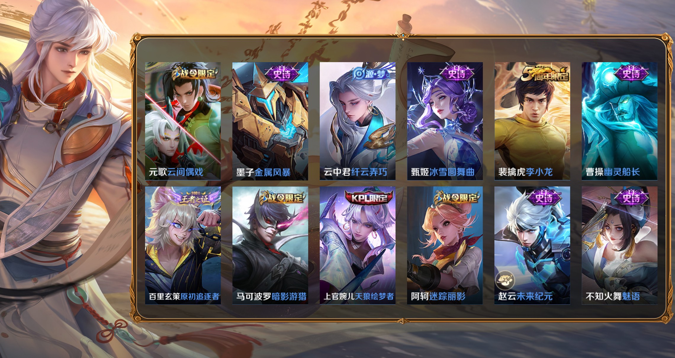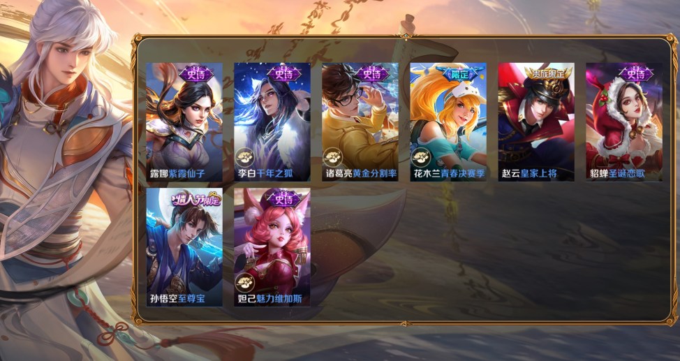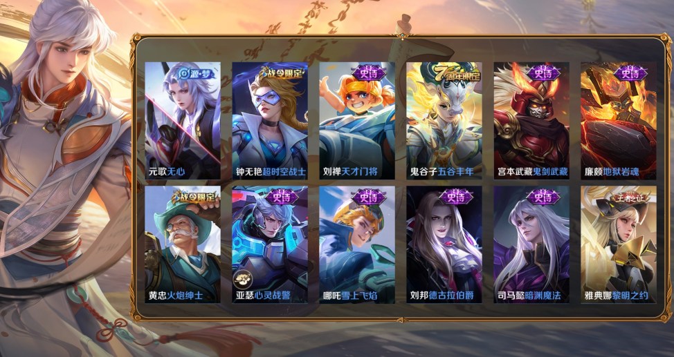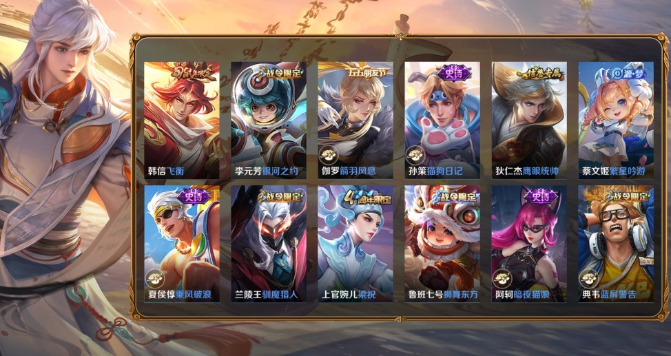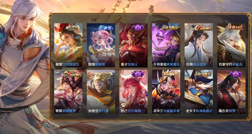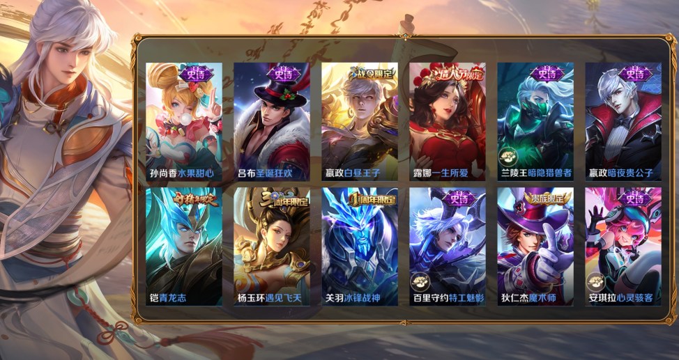 桑啟-畫中遊,百里守約-絕影神槍,百里玄策-威尼斯狂歡,蔡文姬-薔薇王座,曹操-超能戰警,曹操-死神來了,成吉思汗-維京掠奪者,程咬金-華爾街大亨,大喬-伊勢巫女,狄仁傑-錦衣衛,貂蟬-異域舞娘,盾山-極冰防禦線,伽羅-花見巫女,干將莫邪-第七人偶,公孫離-花間舞,關羽-天啟騎士,鬼谷子-阿摩司公爵,后羿-精靈王,花木蘭-劍舞者,黃忠-芝加哥教父,鏡-冰刃幻境,瀾-孤獵,老夫子-潮流仙人,李白-範海辛,李信-灼熱之刃,李元芳-特種部隊,劉邦-聖殿之光,露娜-緋紅之刃,魯班七號-福祿兄弟,馬可波羅-激情綠茵,蒙犽-歸虛夢演,夢奇-美夢成真,哪吒-三太子,女媧-尼羅河女神,盤古-創世神祝,裴擒虎-街頭旋風,沈夢溪-棒球奇才,司空震-啟蟄,司馬懿-魘語軍師,蘇烈-愛與和平,孫臏-未來旅行,孫悟空-西部大鏢客,王昭君-精靈公主,夏侯惇-戰爭騎士,項羽-帝國元帥,雅典娜-戰爭女神,楊戩-埃及法老,楊玉環-霓裳曲,曜-歸虛夢演,弈星-踏雪尋梅,虞姬-加勒比小姐,元歌-午夜歌劇院,雲纓-赤焰之纓,鍾馗-地府判官