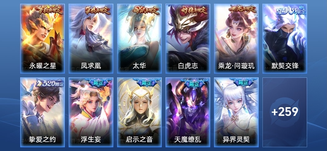 花木蘭-瑞麟志,鍾無豔-王者之錘,蒙恬-榮光聖徽,王昭君-鳳凰于飛,甄姬-遊園驚夢,貂蟬-逐夢之音,花木蘭-默契交鋒,蘭陵王-馴魔獵人,狄仁傑-魔術師,百里玄策-原初追逐者,孫悟空-至尊寶,楊玉環-遇見飛天,花木蘭-青春決賽季,甄姬-幽恆,百里守約-朱雀志,關羽-冰鋒戰神,后羿-輝光之辰,趙雲-引擎之心,鬼谷子-五穀豐年,馬可波羅-暗影遊獵,裴擒虎-天狼狩獵者,韓信-逐夢之影,羋月-白晶晶,安琪拉-乘龍·聚寶船,夢奇-頑趣,馬超-神威,馬可波羅-山海·玄木吟,蔡文姬-繁星吟遊,干將莫邪-冰霜戀舞曲,元歌-無心,上官婉兒-梁祝,趙雲-皇家上將,李元芳-銀河之約,嬴政-白晝王子,魯班七號-獅舞東方