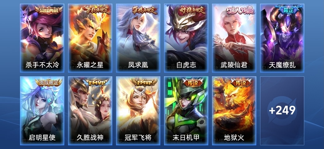 蘭陵王-隱刃,花木蘭-劍舞者,女媧-尼羅河女神,豬八戒-潮玩探月行,明世隱-虹雲星官,王昭君-幻想奇妙夜,劉邦-德古拉伯爵,夢奇-美夢成真,張良-幽蘭居士,沈夢溪-棒球奇才,哪吒-三太子,關羽-天啟騎士,李信-灼熱之刃,楊玉環-霓裳曲,大喬-守護之力,裴擒虎-街頭旋風,瑤-遇見神鹿,海月-幻泉霧影,牛魔-西部大鏢客,高漸離-金屬狂潮,豬八戒-年年有餘,孫尚香-火炮千金,狄仁傑-錦衣衛,鍾無豔-生化警戒,鏡-冰刃幻境,老夫子-潮流仙人,程咬金-星際陸戰隊,曹操-幽靈船長,亞瑟-死亡騎士,蔡文姬-舞動綠茵,老夫子-功夫老勺,亞瑟-心靈戰警,宮本武藏-永珍初新,安琪拉-如懿,雲中君-荷魯斯之眼,張良-天堂福音,瀾-孤獵,程咬金-功夫廚神,趙雲-未來紀元,諸葛亮-星航指揮官,娜可露露-晚螢,鬼谷子-阿摩司公爵,魯班大師-乓乓大師,甄姬-冰雪圓舞曲,露娜-緋紅之刃,韓信-街頭霸王,阿軻-致命風華,花木蘭-水晶獵龍者,曜-歸虛夢演,墨子-龍騎士,白起-星夜王子,孫臏-歸虛夢演,伽羅-花見巫女,劉禪-紳士熊喵,蘭陵王-暗隱獵獸者,百里守約-絕影神槍,李元芳-黑貓愛糖果,盾山-圓桌騎士,不知火舞-魅語,孫尚香-水果甜心,曹操-死神來了,甄姬-花好人間,狄仁傑-鷹眼統帥,沈夢溪-鯊炮海盜貓,花木蘭-兔女郎,米萊狄-精準探案法,魯班七號-黑桃隊長,劉備-漢昭烈帝,周瑜-海軍大將,雅典娜-冰冠公主,姜子牙-時尚教父,嬴政-搖滾巨星,劉禪-秘密基地,李白-範海辛,弈星-踏雪尋梅,明世隱-占星師,黃忠-芝加哥教父,阿軻-節奏熱浪,蘇烈-堅韌之力,露娜-瓷語鑑心,李元芳-逐浪之夏,扁鵲-化身博士,蘇烈-愛與和平,牛魔-制霸全明星,趙雲-忍·炎影,百里玄策-威尼斯狂歡,西施-歸虛夢演,雲纓-赤焰之纓,王昭君-精靈公主,妲己-少女阿狸,劉禪-喚靈魔甲,司馬懿-魘語軍師,后羿-精靈王,公孫離-花間舞,魯班大師-歸虛夢演,貂蟬-聖誕戀歌,嫦娥-露花倒影,小喬-繽紛獨角獸,馬超-倖存者,宮本武藏-霸王丸,露娜-紫霞仙子,達摩-大發明家,程咬金-無雙福將,上官婉兒-修竹墨客,項羽-科學大爆炸,金蟬-前塵,裴擒虎-梅西,張飛-五福同心,墨子-進擊墨子號,大喬-貓狗日記,盤古-創世神祝,鬼谷子-幻樂之宴,孫策-貓狗日記,小喬-青蛇,蒙犽-歸虛夢演,安琪拉-心靈駭客,虞姬-加勒比小姐,劉禪-天才門將,關羽-龍騰萬里,韓信-教廷特使,馬可波羅-潮玩牛仔,莊周-奇妙博物學,露娜-哥特玫瑰,劉備-紐約教父,張良-一千零一夜,楊戩-次元傲視,劉備-萬事如意,孫臏-天使之翼,干將莫邪-第七人偶,王昭君-偶像歌手,貂蟬-異域舞娘,蔡文姬-薔薇王座,哪吒-次元突破,馬可波羅-激情綠茵,妲己-魅力維加斯,盤古-重灌意志,雅典娜-戰爭女神,張良-繽紛繪卷,張良-古海尋蹤,達摩-拳王,元歌-午夜歌劇院,楊戩-埃及法老,孫尚香-沉穩之力,夏侯惇-乘風破浪,鍾馗-地府判官,宮本武藏-鬼劍武藏,妲己-仙境愛麗絲,瑤-森,成吉思汗-維京掠奪者,夏侯惇-戰爭騎士,廉頗-無盡征程,鍾無豔-海灘麗影,狂鐵-特工戰影,伽羅-箭羽風息,安琪拉-玩偶對對碰,大喬-伊勢巫女,小喬-丁香結,呂布-聖誕狂歡,鎧-龍域領主,妲己-女僕咖啡,太乙真人-圓桌騎士,東皇太一-東海龍王