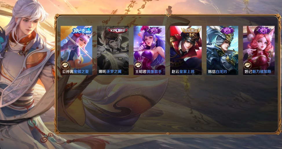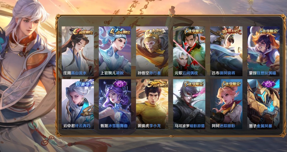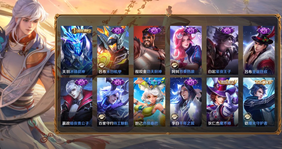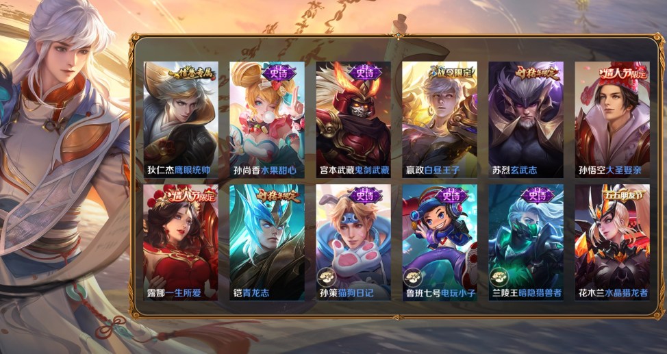 百里守約-絕影神槍,百里玄策-威尼斯狂歡,蔡文姬-薔薇王座,曹操-超能戰警,曹操-死神來了,大喬-伊勢巫女,貂蟬-異域舞娘,盾山-極冰防禦線,伽羅-花見巫女,干將莫邪-第七人偶,高漸離-金屬狂潮,公孫離-花間舞,關羽-天啟騎士,后羿-精靈王,黃忠-芝加哥教父,金蟬-前塵,鏡-冰刃幻境,鎧-龍域領主,蘭陵王-隱刃,瀾-孤獵,老夫子-潮流仙人,李白-範海辛,李信-灼熱之刃,李元芳-特種部隊,劉邦-聖殿之光,劉禪-英喵野望,魯班大師-歸虛夢演,馬可波羅-激情綠茵,蒙恬-秩序獵龍將,蒙犽-歸虛夢演,夢奇-美夢成真,米萊狄-精準探案法,盤古-創世神祝,裴擒虎-街頭旋風,上官婉兒-修竹墨客,司空震-啟蟄,司馬懿-魘語軍師,蘇烈-愛與和平,孫臏-未來旅行,孫悟空-西部大鏢客,夏侯惇-戰爭騎士,項羽-帝國元帥,小喬-萬聖前夜,雅典娜-戰爭女神,楊玉環-霓裳曲,瑤-森,曜-歸虛夢演,弈星-踏雪尋梅,虞姬-加勒比小姐,元歌-午夜歌劇院,雲纓-赤焰之纓,鍾馗-地府判官,鍾無豔-生化警戒,諸葛亮-星航指揮官