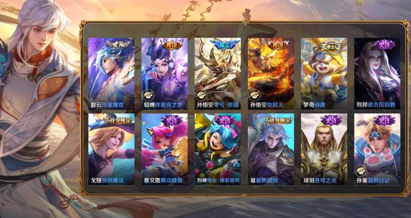 孫策-貓狗日記,項羽-蒼穹之光,李元芳-銀河之約,百里玄策-原初追逐者,雲中君-纖雲弄巧,妲己-女僕咖啡,狄仁傑-鷹眼統帥,黃忠-火炮紳士,呂布-聖誕狂歡,瑤-山海·碧波行,鬼谷子-五穀豐年,趙雲-未來紀元,張良-千籌問戰,明世隱-吟遊魔法,公孫離-玉兔公主,夏洛特-永晝,阿軻-暗夜貓娘,阿軻-節奏熱浪,阿軻-迷蹤麗影,安琪拉-時之奇旅,百里守約-朱雀志,不知火舞-魅語,蔡文姬-舞動綠茵,曹操-幽靈船長,蔡文姬-繁星吟遊,嫦娥-拒霜思,程咬金-功夫廚神,妲己-魅力維加斯,狄仁傑-魔術師,貂蟬-聖誕戀歌,伽羅-箭羽風息,伽羅-天狼溯光者,干將莫邪-真愛魔法,公孫離-無限星賞官,宮本武藏-鬼劍武藏,關羽-冰鋒戰神,韓信-逐夢之影,花木蘭-水晶獵龍者,花木蘭-默契交鋒,黃忠-烈魂,鎧-曙光守護者,蘭陵王-暗隱獵獸者,老夫子-航海奇遇記,李白-千年之狐,李元芳-逐浪之夏,廉頗-地獄巖魂,劉邦-德古拉伯爵,劉禪-天才門將,露娜-紫霞仙子,魯班七號-電玩小子,呂布-末日機甲,馬超-神威,馬可波羅-暗影遊獵,蒙犽-狂想玩偶喵,米萊狄-胡桃異想國,墨子-金屬風暴,娜可露露-晚螢,上官婉兒-梁祝,裴擒虎-李小龍,上官婉兒-天狼繪夢者,司馬懿-暗淵魔法,孫尚香-水果甜心,孫尚香-薔薇戀人,孫悟空-至尊寶,孫悟空-孫行者,夏侯惇-乘風破浪,小喬-繽紛獨角獸,小喬-青蛇,雅典娜-冰冠公主,雅典娜-黎明之約,楊戩-天秀·啟明,楊玉環-寅虎·心曲,嬴政-搖滾巨星,元歌-雲間偶戲,張飛-亂世虎臣,趙雲-皇家上將,甄姬-遊園驚夢,鍾無豔-王者之錘,諸葛亮-黃金分割率,莊周-高山流水,劉禪-電玩·爆裂旋風