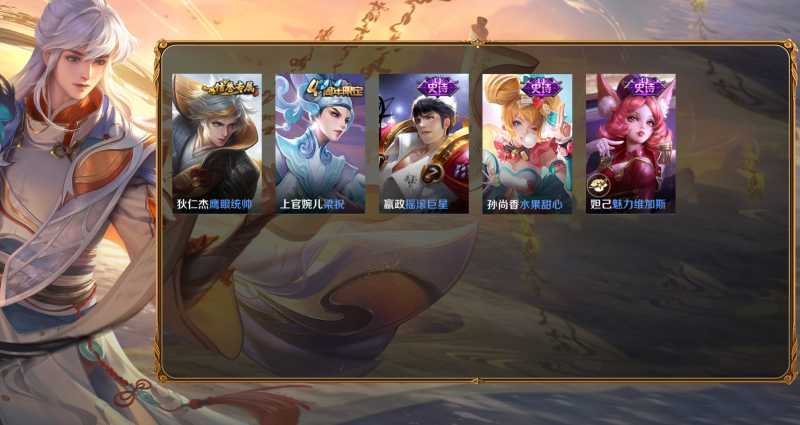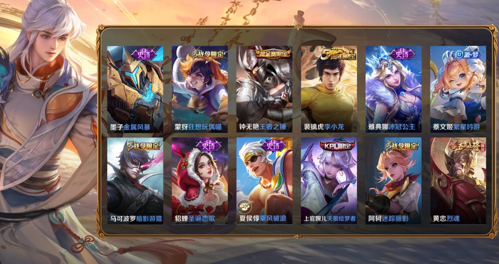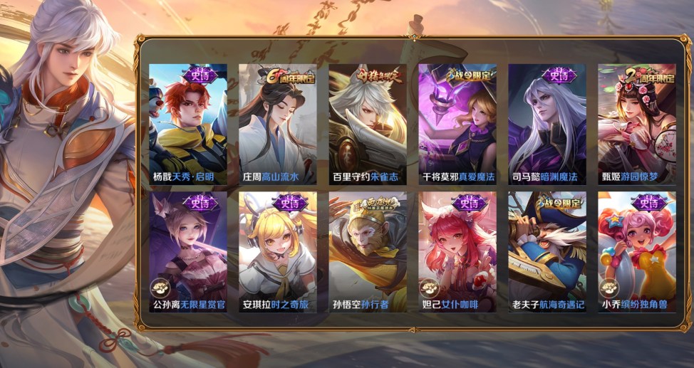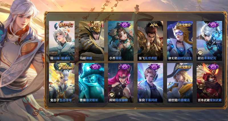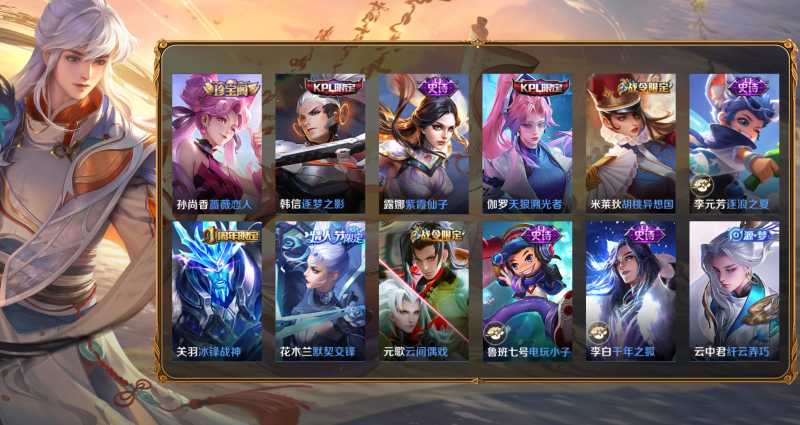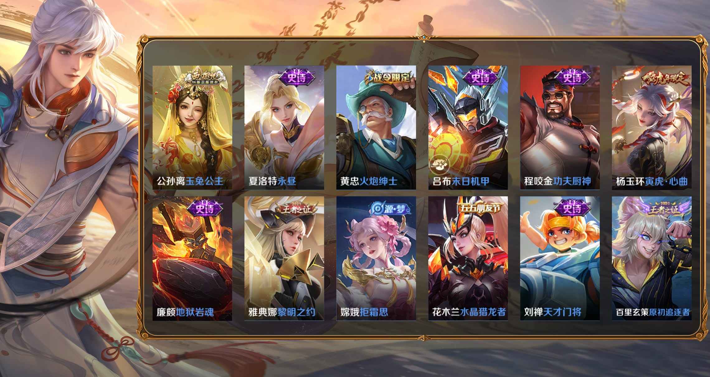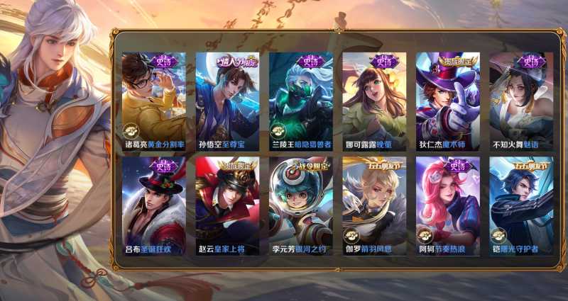 桑啟-畫中遊,阿古朵-熊喵少女,百里守約-絕影神槍,百里玄策-威尼斯狂歡,蔡文姬-薔薇王座,曹操-超能戰警,曹操-死神來了,嫦娥-露花倒影,成吉思汗-維京掠奪者,大喬-伊勢巫女,狄仁傑-錦衣衛,貂蟬-異域舞娘,東皇太一-東海龍王,盾山-極冰防禦線,暃-碧珀緋影,伽羅-花見巫女,干將莫邪-第七人偶,高漸離-金屬狂潮,公孫離-花間舞,關羽-天啟騎士,鬼谷子-阿摩司公爵,后羿-精靈王,花木蘭-劍舞者,黃忠-芝加哥教父,金蟬-前塵,鏡-冰刃幻境,鎧-龍域領主,蘭陵王-隱刃,瀾-孤獵,老夫子-潮流仙人,李白-範海辛,李信-灼熱之刃,李元芳-特種部隊,劉邦-聖殿之光,劉禪-英喵野望,露娜-緋紅之刃,魯班大師-歸虛夢演,魯班七號-木偶奇遇記,魯班七號-福祿兄弟,馬超-倖存者,馬可波羅-激情綠茵,蒙恬-秩序獵龍將,蒙犽-歸虛夢演,夢奇-美夢成真,米萊狄-精準探案法,明世隱-占星師,女媧-尼羅河女神,盤古-創世神祝,裴擒虎-街頭旋風,上官婉兒-修竹墨客,沈夢溪-棒球奇才,司空震-啟蟄,司馬懿-魘語軍師,蘇烈-愛與和平,孫臏-未來旅行,孫策-海之征途,孫悟空-西部大鏢客,太乙真人-圓桌騎士,王昭君-精靈公主,西施-歸虛夢演,夏侯惇-戰爭騎士,項羽-帝國元帥,小喬-萬聖前夜,雅典娜-戰爭女神,楊戩-埃及法老,楊玉環-霓裳曲,瑤-森,曜-歸虛夢演,弈星-踏雪尋梅,虞姬-加勒比小姐,元歌-午夜歌劇院,雲纓-赤焰之纓,雲中君-荷魯斯之眼,張良-一千零一夜,鍾馗-地府判官,鍾無豔-生化警戒,周瑜-海軍大將,諸葛亮-星航指揮官,豬八戒-年年有餘