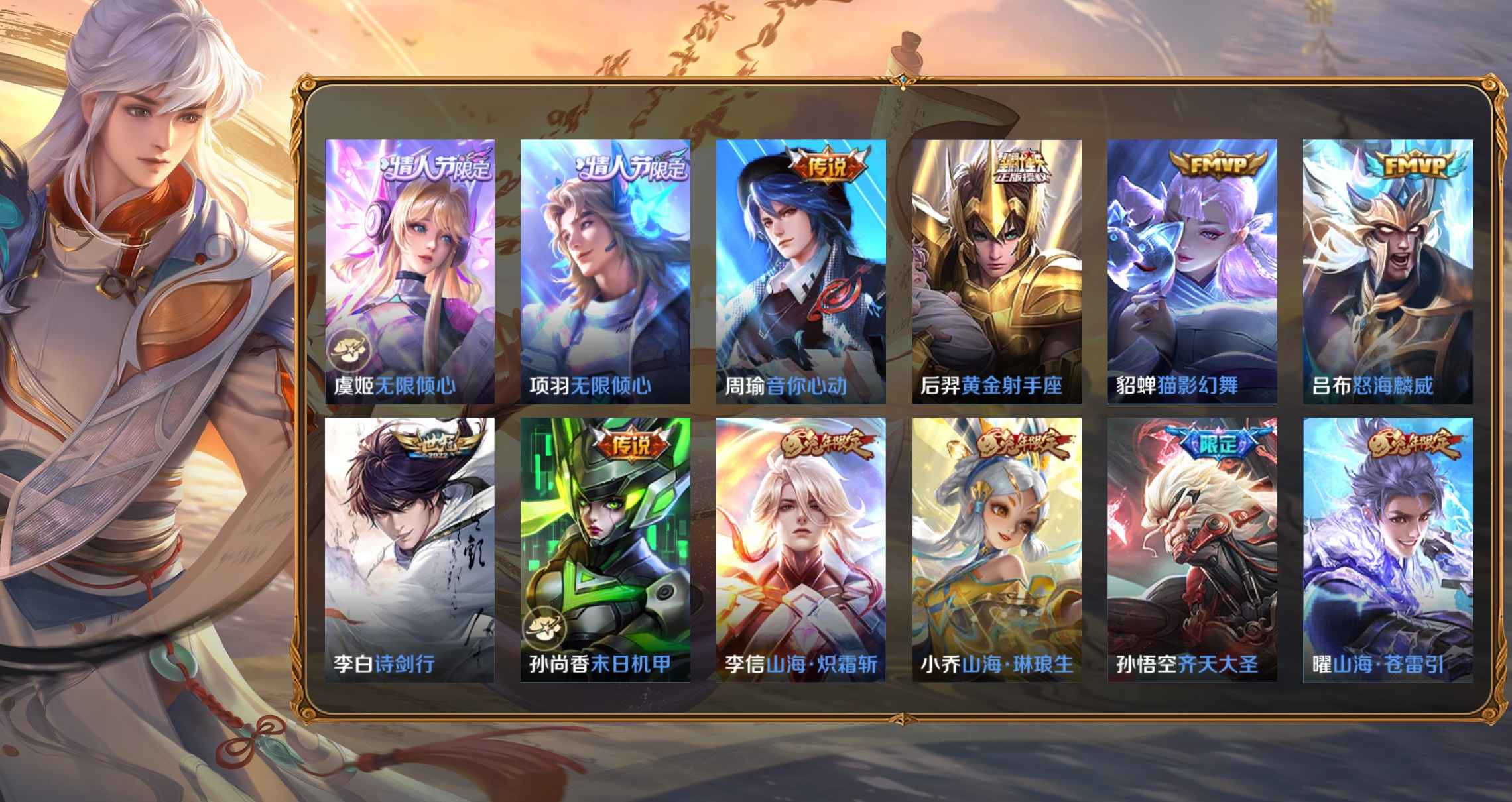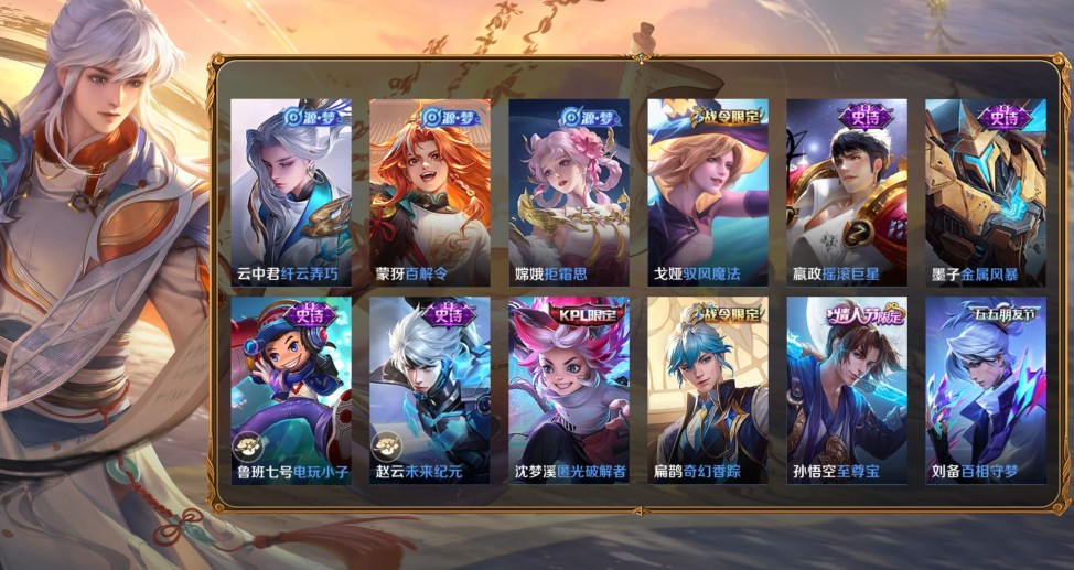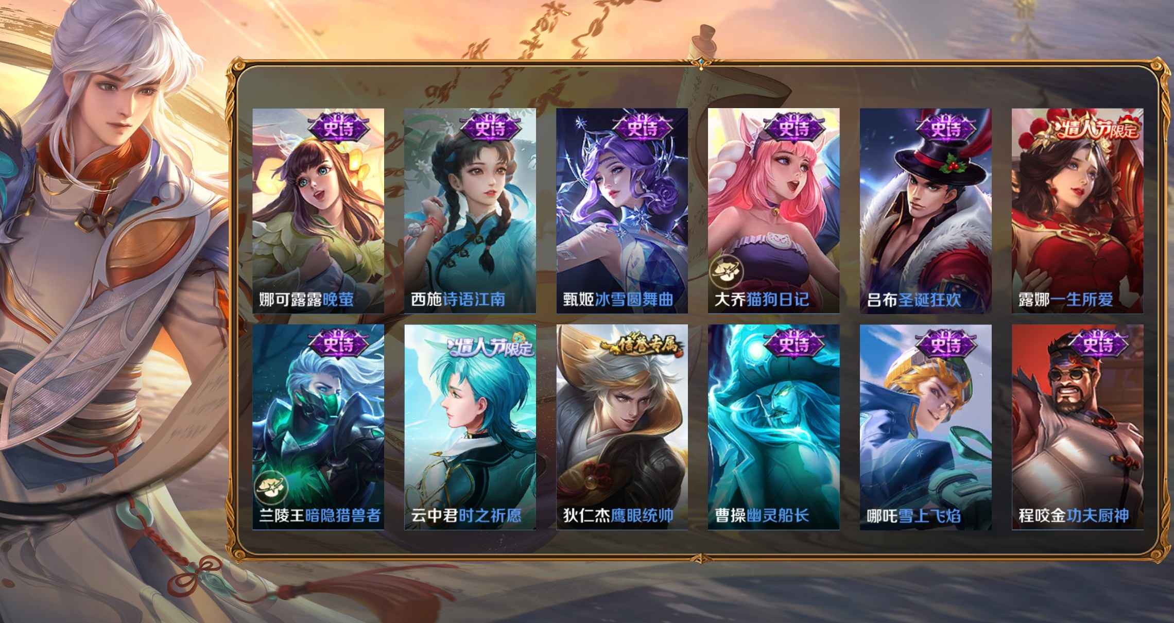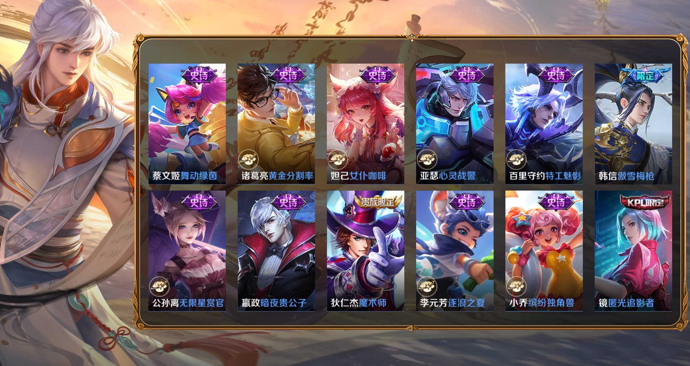 孫策-貓狗日記,項羽-蒼穹之光,瀾-賞金獵手,海月-浮夢羅煙,雲中君-纖雲弄巧,妲己-女僕咖啡,狄仁傑-鷹眼統帥,韓信-傲雪梅槍,黃忠-火炮紳士,劉禪-紳士熊喵,呂布-聖誕狂歡,扁鵲-奇幻香蹤,楊玉環-銀翎春語,盤古-冰霜神祇,馬可波羅-山海·玄木吟,墨子-降魔,元歌-無心,上官婉兒-神器·永珍筆,弈星-滕王閣序,趙雲-未來紀元,張良-千籌問戰,高漸離-天秀·音浪,貂蟬-喚靈魅影,艾琳-奇遇舞章,明世隱-吟遊魔法,公孫離-玉兔公主,夏洛特-永晝,阿軻-節奏熱浪,安琪拉-心靈駭客,亞瑟-心靈戰警,白起-星夜王子,百里守約-特工魅影,百里玄策-熱力迴旋,不知火舞-魅語,蔡文姬-舞動綠茵,曹操-幽靈船長,嫦娥-如夢令,嫦娥-拒霜思,程咬金-功夫廚神,妲己-魅力維加斯,大喬-貓狗日記,狄仁傑-魔術師,貂蟬-聖誕戀歌,伽羅-箭羽風息,公孫離-無限星賞官,宮本武藏-鬼劍武藏,后羿-如夢令,花木蘭-水晶獵龍者,黃忠-烈魂,橘右京-修羅,鏡-匿光追影者,蘭陵王-暗隱獵獸者,李白-千年之狐,李元芳-逐浪之夏,廉頗-地獄巖魂,廉頗-寅虎·御盾,劉邦-德古拉伯爵,劉禪-天才門將,露娜-紫霞仙子,露娜-一生所愛,魯班七號-電玩小子,呂布-末日機甲,墨子-金屬風暴,墨子-龍騎士,娜可露露-晚螢,哪吒-雪上飛焰,司馬懿-暗淵魔法,孫尚香-水果甜心,孫尚香-時之戀人,孫悟空-至尊寶,王昭君-偶像歌手,西施-詩語江南,夏侯惇-乘風破浪,小喬-繽紛獨角獸,楊戩-天秀·啟明,嬴政-搖滾巨星,嬴政-暗夜貴公子,雲中君-時之祈願,張飛-亂世虎臣,趙雲-皇家上將,趙雲-龍膽,甄姬-冰雪圓舞曲,甄姬-女兒國國王,鍾馗-樂園奇幻夜,諸葛亮-黃金分割率,莊周-雲端築夢師,夏侯惇-匿光決鋒者,關羽-百相守夢,劉備-百相守夢,沈夢溪-匿光破解者