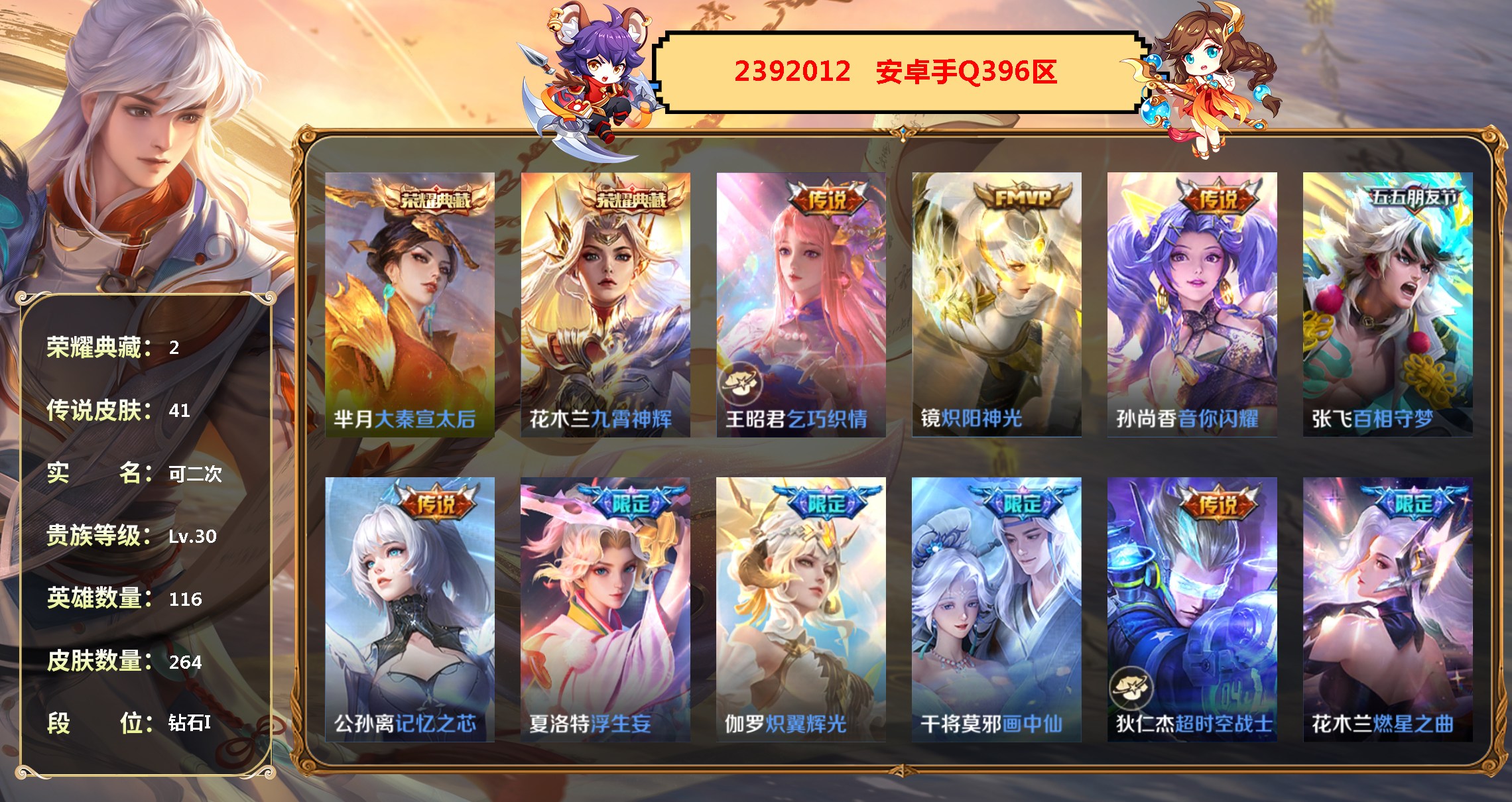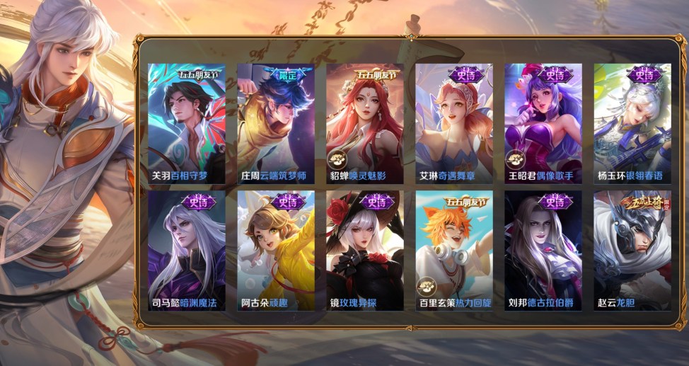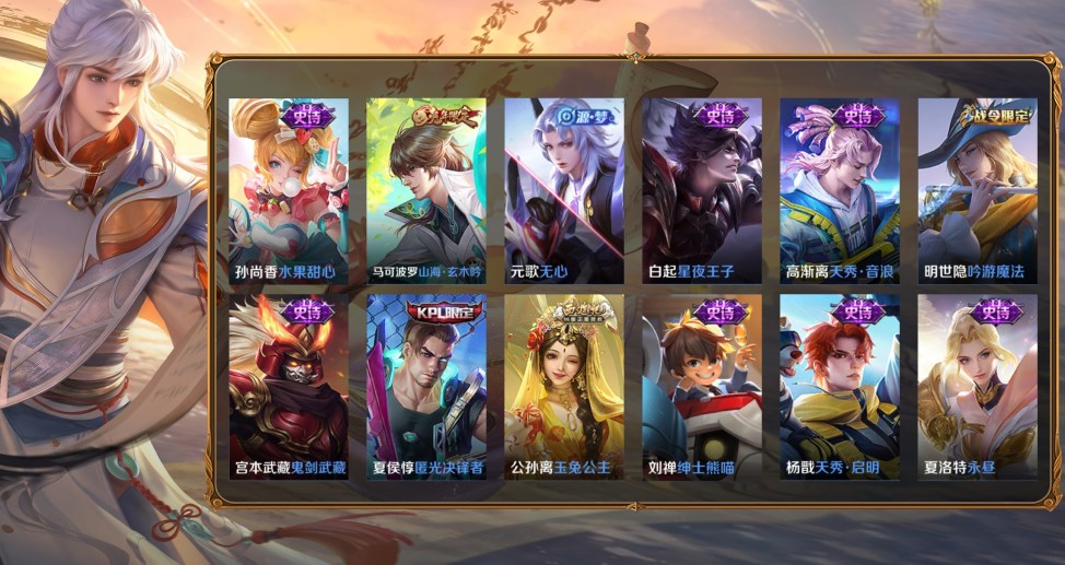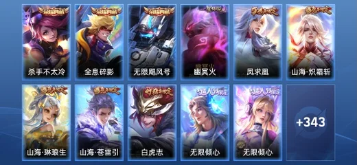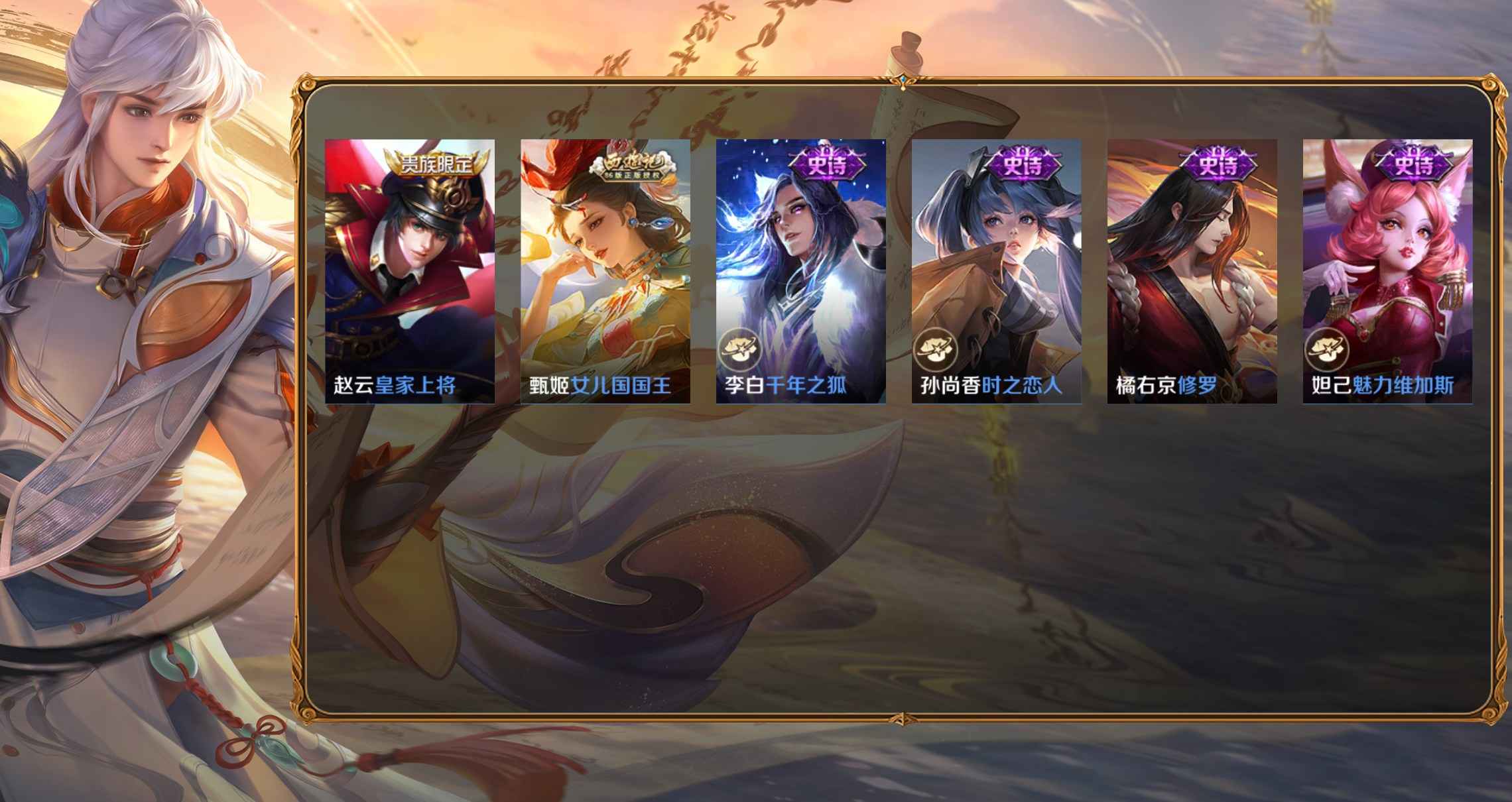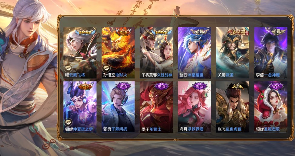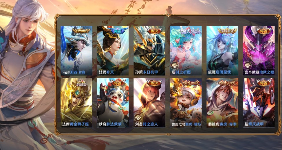 孫策-貓狗日記,項羽-蒼穹之光,瀾-賞金獵手,海月-浮夢羅煙,雲中君-纖雲弄巧,妲己-女僕咖啡,狄仁傑-鷹眼統帥,韓信-傲雪梅槍,黃忠-火炮紳士,劉禪-紳士熊喵,呂布-聖誕狂歡,扁鵲-奇幻香蹤,楊玉環-銀翎春語,盤古-冰霜神祇,馬可波羅-山海·玄木吟,墨子-降魔,元歌-無心,上官婉兒-神器·永珍筆,弈星-滕王閣序,趙雲-未來紀元,張良-千籌問戰,高漸離-天秀·音浪,貂蟬-喚靈魅影,艾琳-奇遇舞章,明世隱-吟遊魔法,公孫離-玉兔公主,夏洛特-永晝,阿軻-節奏熱浪,安琪拉-心靈駭客,亞瑟-心靈戰警,白起-星夜王子,百里守約-特工魅影,百里玄策-熱力迴旋,不知火舞-魅語,蔡文姬-舞動綠茵,曹操-幽靈船長,嫦娥-如夢令,嫦娥-拒霜思,程咬金-功夫廚神,妲己-魅力維加斯,大喬-貓狗日記,狄仁傑-魔術師,貂蟬-聖誕戀歌,伽羅-箭羽風息,公孫離-無限星賞官,宮本武藏-鬼劍武藏,后羿-如夢令,花木蘭-水晶獵龍者,黃忠-烈魂,橘右京-修羅,鏡-匿光追影者,蘭陵王-暗隱獵獸者,李白-千年之狐,李元芳-逐浪之夏,廉頗-地獄巖魂,廉頗-寅虎·御盾,劉邦-德古拉伯爵,劉禪-天才門將,露娜-紫霞仙子,露娜-一生所愛,魯班七號-電玩小子,呂布-末日機甲,墨子-金屬風暴,墨子-龍騎士,娜可露露-晚螢,哪吒-雪上飛焰,司馬懿-暗淵魔法,孫尚香-水果甜心,孫尚香-時之戀人,孫悟空-至尊寶,王昭君-偶像歌手,西施-詩語江南,夏侯惇-乘風破浪,小喬-繽紛獨角獸,楊戩-天秀·啟明,嬴政-搖滾巨星,嬴政-暗夜貴公子,雲中君-時之祈願,張飛-亂世虎臣,趙雲-皇家上將,趙雲-龍膽,甄姬-冰雪圓舞曲,甄姬-女兒國國王,鍾馗-樂園奇幻夜,諸葛亮-黃金分割率,莊周-雲端築夢師,夏侯惇-匿光決鋒者,關羽-百相守夢,劉備-百相守夢,沈夢溪-匿光破解者
