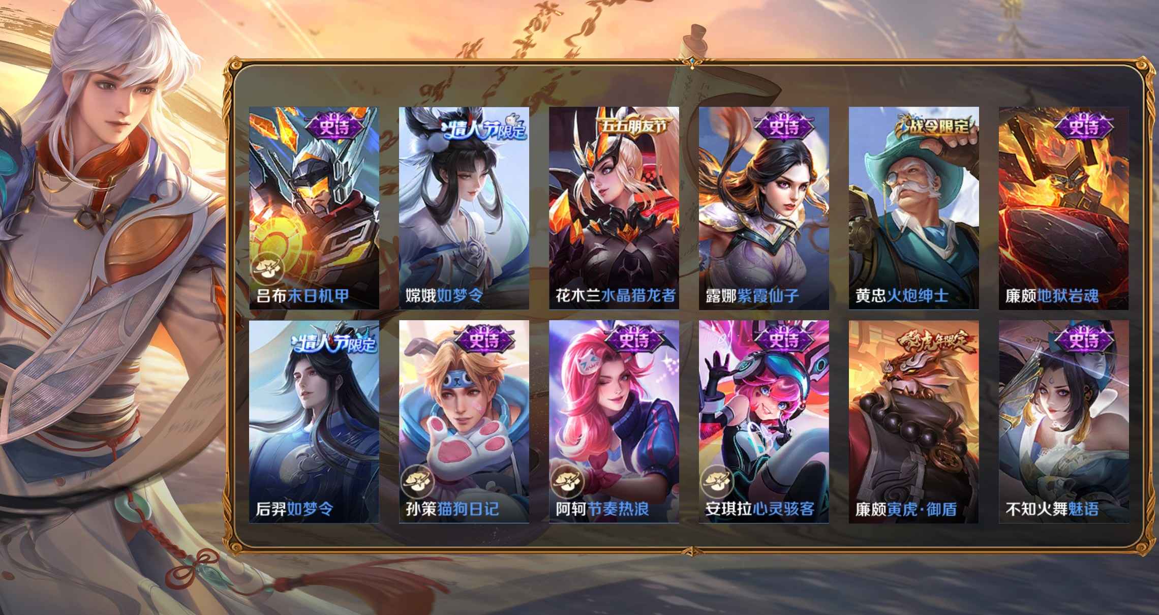 夢奇-胖達榮榮,達摩-黃金獅子座,后羿-黃金射手座,李白-詩劍行,李信-一念神魔,狄仁傑-超時空戰士,趙雲-淬星耀世,貂蟬-仲夏夜之夢,公孫離-記憶之芯,宮本武藏-地獄之眼,孫尚香-音你閃耀,周瑜-音你心動,鎧-絳天戰甲,劉備-時之戀人,貂蟬-貓影幻舞,干將莫邪-久勝戰神,鏡-熾陽神光,呂布-怒海麟威,孫策-末日機甲,孫尚香-末日機甲,馬超-無雙飛將,孫悟空-地獄火,曜-雲鷹飛將,王昭君-乞巧織情