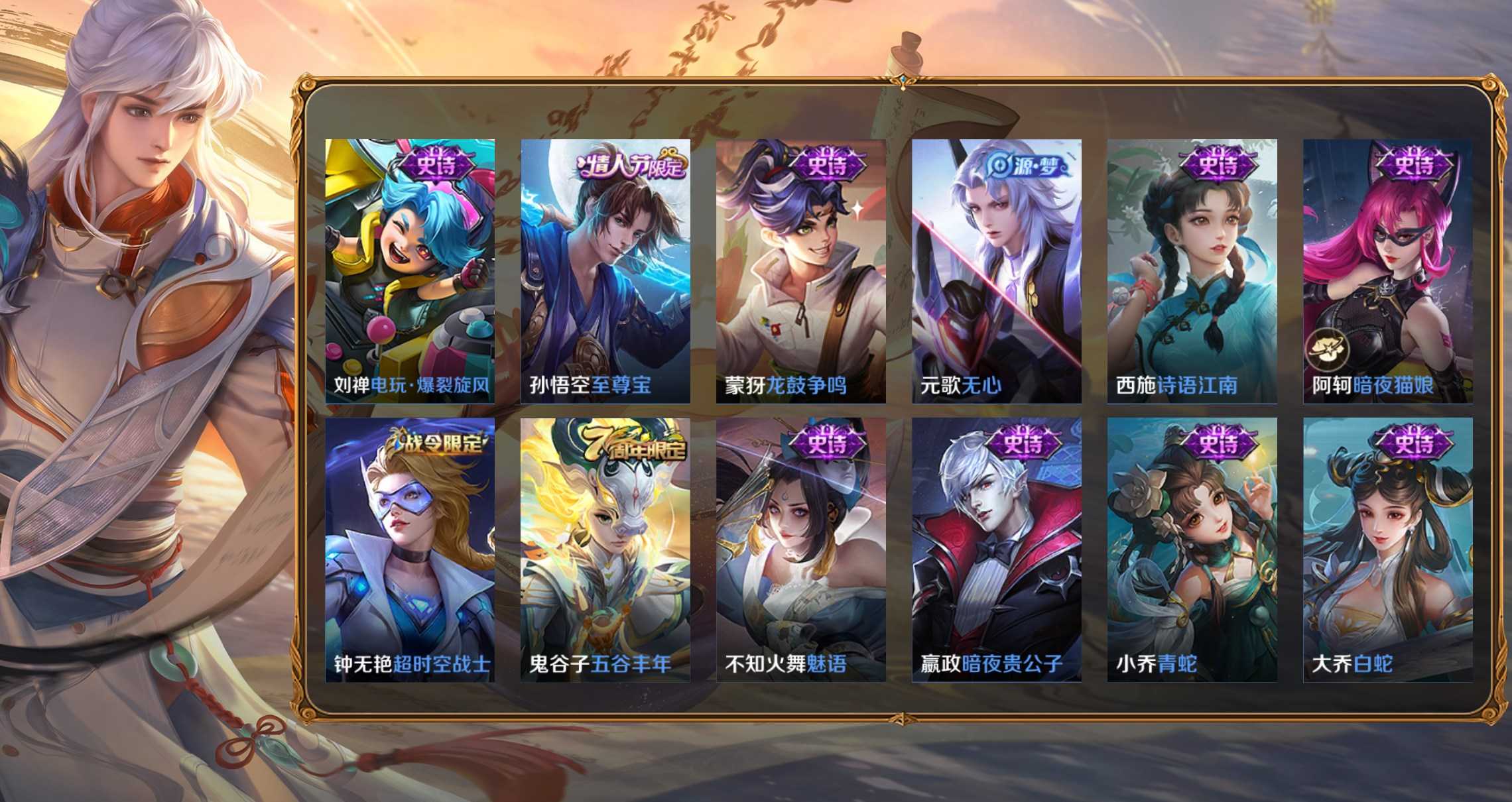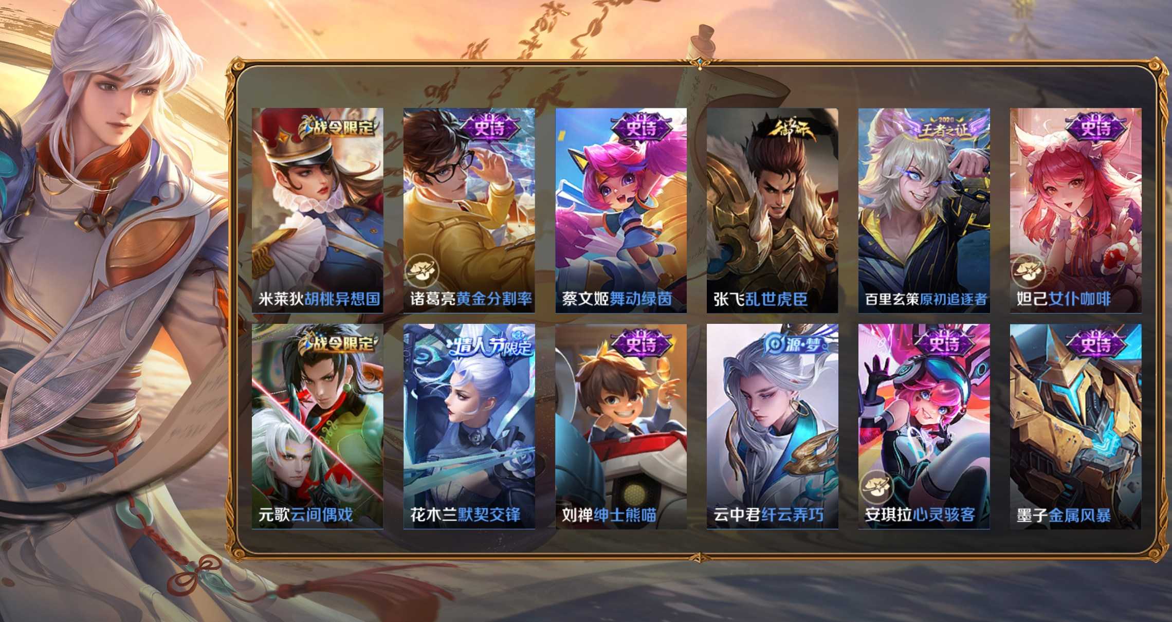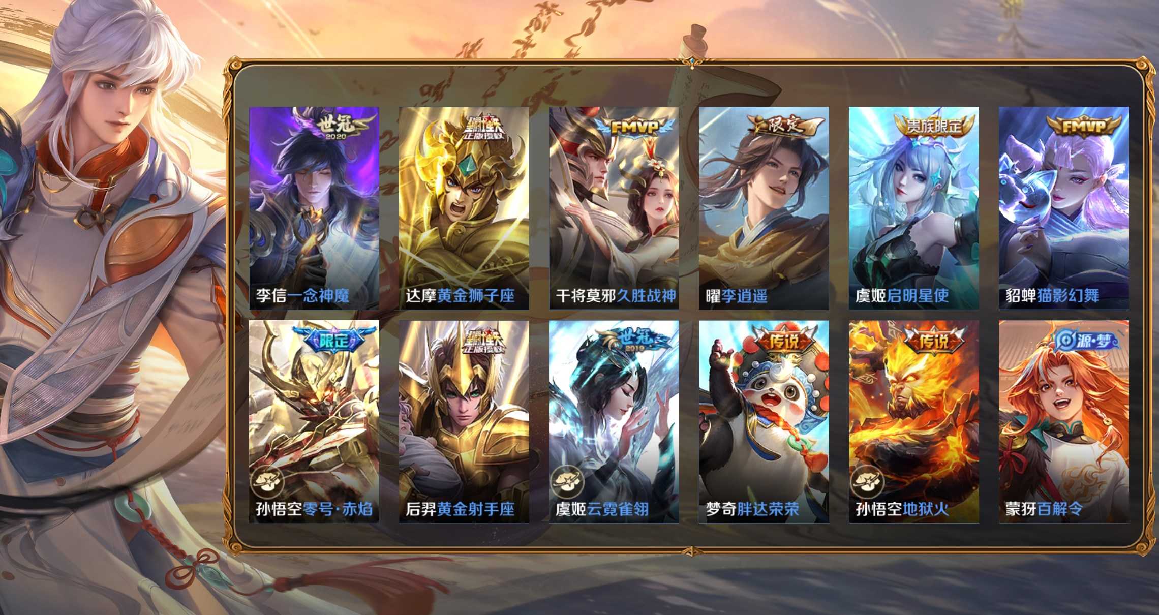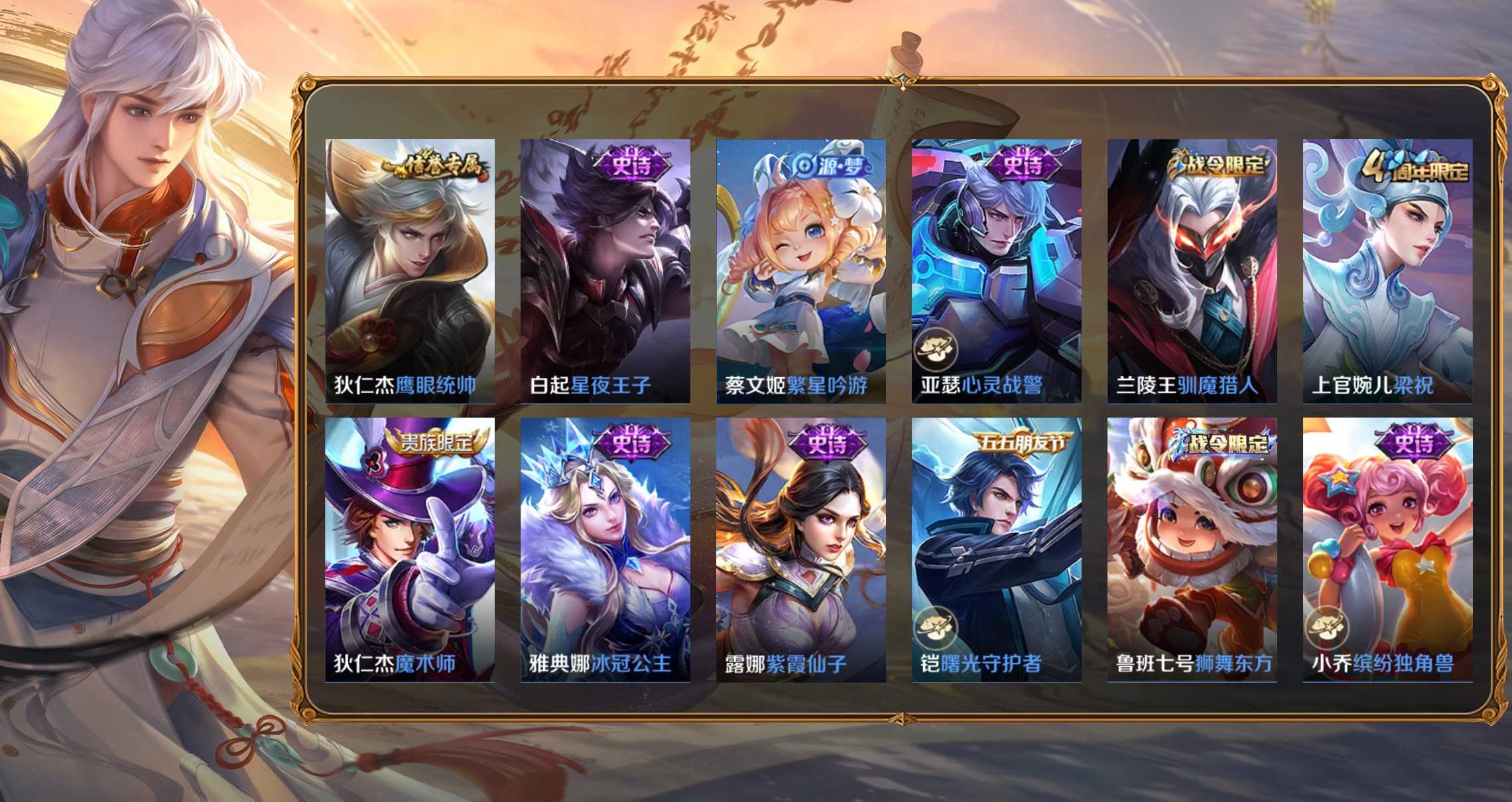 孫策-貓狗日記,項羽-蒼穹之光,李元芳-銀河之約,百里玄策-原初追逐者,雲中君-纖雲弄巧,大喬-白蛇,妲己-女僕咖啡,狄仁傑-鷹眼統帥,韓信-傲雪梅槍,黃忠-火炮紳士,劉禪-紳士熊喵,呂布-聖誕狂歡,元歌-無心,鬼谷子-五穀豐年,趙雲-未來紀元,明世隱-吟遊魔法,阿軻-暗夜貓娘,阿軻-節奏熱浪,阿軻-迷蹤麗影,安琪拉-心靈駭客,安琪拉-時之奇旅,亞瑟-心靈戰警,白起-星夜王子,百里守約-特工魅影,不知火舞-魅語,蔡文姬-舞動綠茵,曹操-幽靈船長,蔡文姬-繁星吟遊,嫦娥-拒霜思,程咬金-功夫廚神,妲己-魅力維加斯,大喬-貓狗日記,狄仁傑-魔術師,典韋-藍色畫面警告,貂蟬-聖誕戀歌,伽羅-箭羽風息,干將莫邪-真愛魔法,公孫離-無限星賞官,宮本武藏-鬼劍武藏,后羿-輝光之辰,花木蘭-水晶獵龍者,花木蘭-默契交鋒,橘右京-修羅,鎧-曙光守護者,蘭陵王-暗隱獵獸者,蘭陵王-馴魔獵人,老夫子-航海奇遇記,李白-千年之狐,李元芳-逐浪之夏,廉頗-地獄巖魂,劉邦-德古拉伯爵,劉禪-天才門將,露娜-紫霞仙子,魯班七號-電玩小子,魯班七號-獅舞東方,呂布-末日機甲,馬可波羅-暗影遊獵,蒙犽-狂想玩偶喵,蒙犽-龍鼓爭鳴,米萊狄-胡桃異想國,墨子-金屬風暴,墨子-龍騎士,娜可露露-晚螢,上官婉兒-梁祝,裴擒虎-李小龍,司馬懿-暗淵魔法,孫尚香-水果甜心,孫悟空-大聖娶親,孫尚香-時之戀人,孫悟空-至尊寶,王昭君-偶像歌手,西施-詩語江南,夏侯惇-乘風破浪,小喬-繽紛獨角獸,小喬-青蛇,雅典娜-冰冠公主,雅典娜-黎明之約,楊玉環-遇見飛天,楊戩-天秀·啟明,嬴政-搖滾巨星,嬴政-暗夜貴公子,嬴政-優雅戀人,嬴政-白晝王子,元歌-雲間偶戲,張飛-亂世虎臣,趙雲-皇家上將,甄姬-冰雪圓舞曲,甄姬-遊園驚夢,諸葛亮-黃金分割率,莊周-高山流水,劉禪-電玩·爆裂旋風