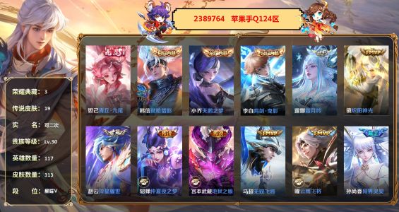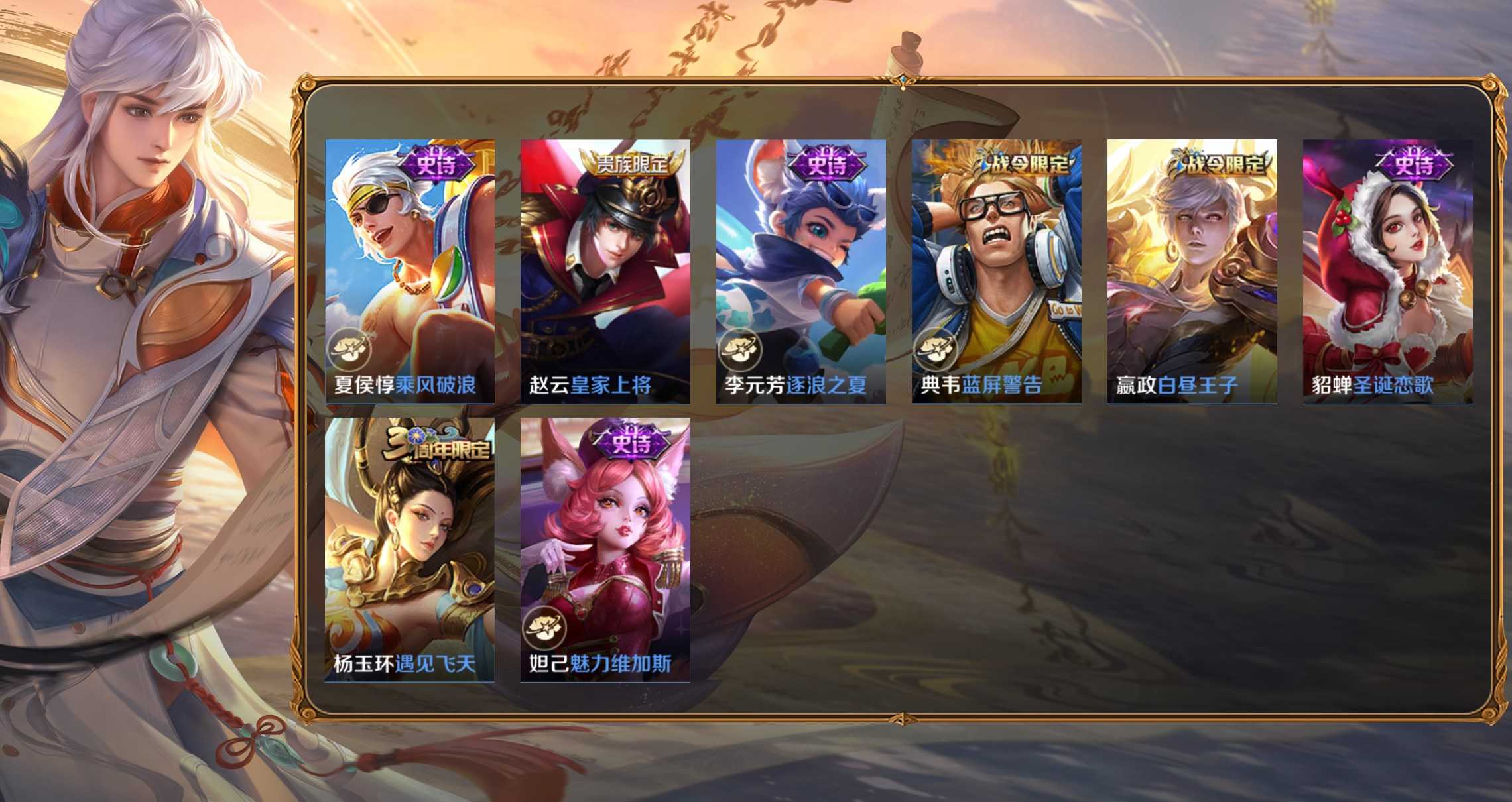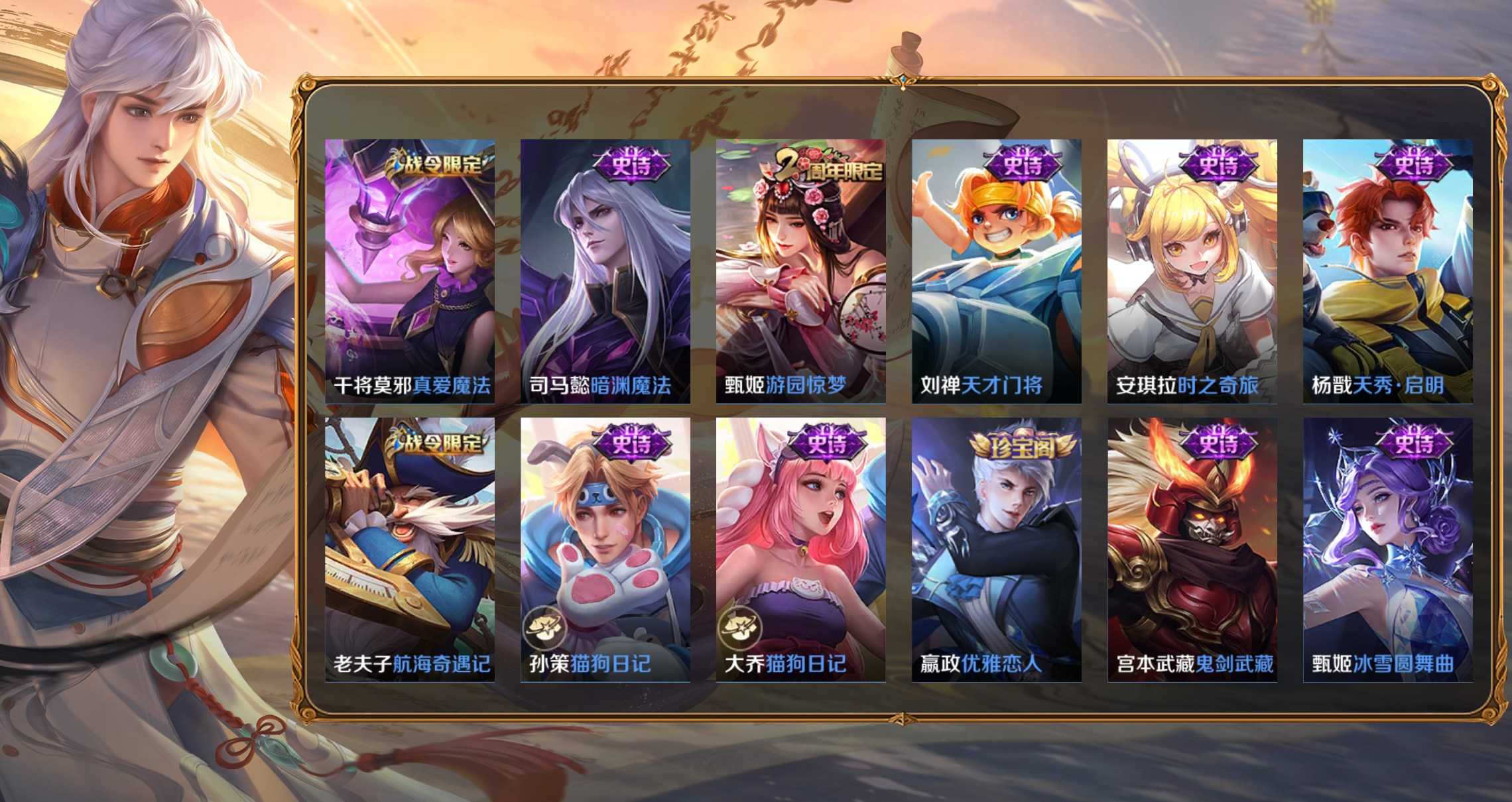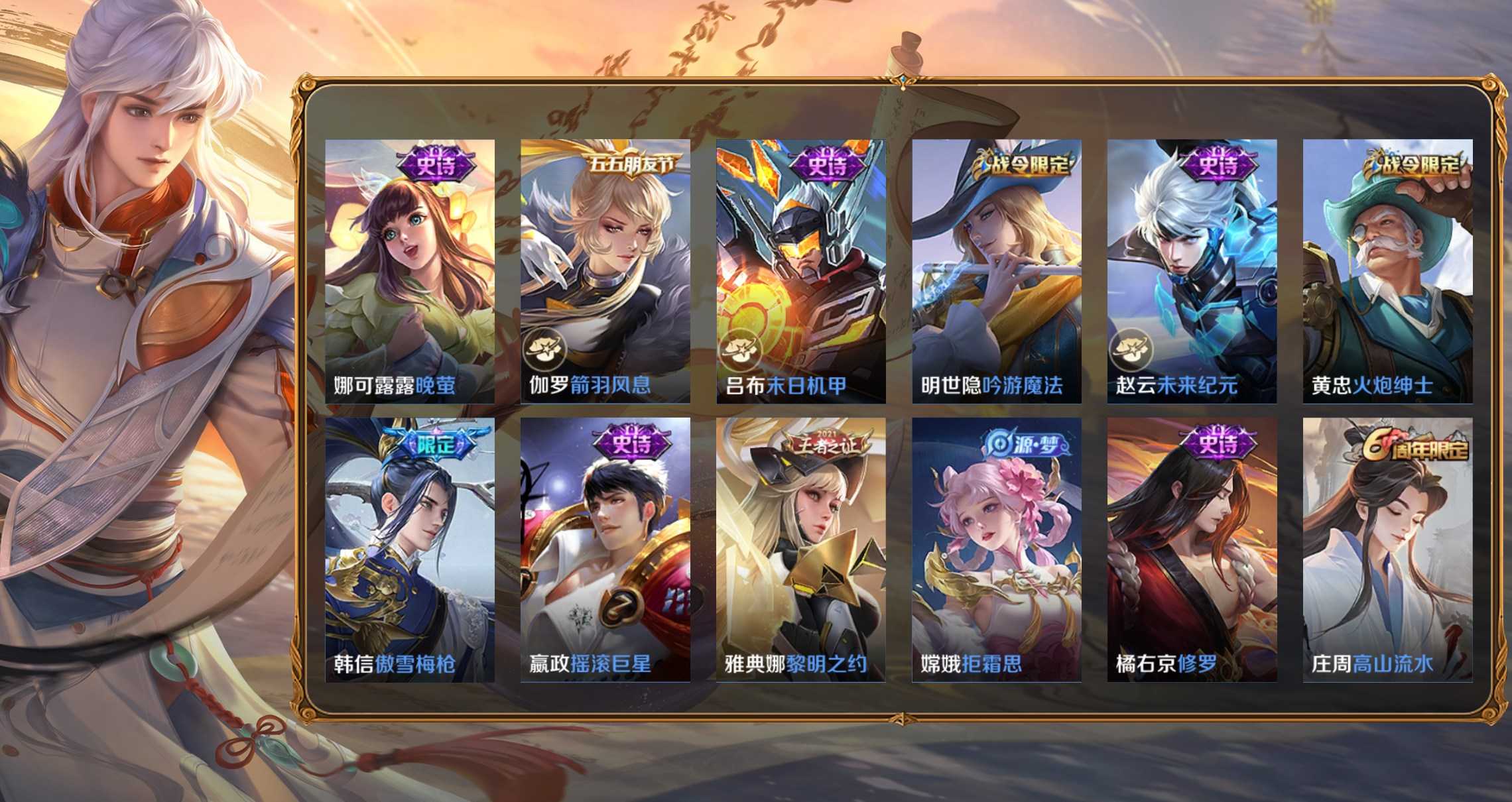 孫策-貓狗日記,項羽-蒼穹之光,李元芳-銀河之約,百里玄策-原初追逐者,雲中君-纖雲弄巧,大喬-白蛇,妲己-女僕咖啡,狄仁傑-鷹眼統帥,韓信-傲雪梅槍,黃忠-火炮紳士,劉禪-紳士熊喵,呂布-聖誕狂歡,元歌-無心,鬼谷子-五穀豐年,趙雲-未來紀元,明世隱-吟遊魔法,阿軻-暗夜貓娘,阿軻-節奏熱浪,阿軻-迷蹤麗影,安琪拉-心靈駭客,安琪拉-時之奇旅,亞瑟-心靈戰警,白起-星夜王子,百里守約-特工魅影,不知火舞-魅語,蔡文姬-舞動綠茵,曹操-幽靈船長,蔡文姬-繁星吟遊,嫦娥-拒霜思,程咬金-功夫廚神,妲己-魅力維加斯,大喬-貓狗日記,狄仁傑-魔術師,典韋-藍色畫面警告,貂蟬-聖誕戀歌,伽羅-箭羽風息,干將莫邪-真愛魔法,公孫離-無限星賞官,宮本武藏-鬼劍武藏,后羿-輝光之辰,花木蘭-水晶獵龍者,花木蘭-默契交鋒,橘右京-修羅,鎧-曙光守護者,蘭陵王-暗隱獵獸者,蘭陵王-馴魔獵人,老夫子-航海奇遇記,李白-千年之狐,李元芳-逐浪之夏,廉頗-地獄巖魂,劉邦-德古拉伯爵,劉禪-天才門將,露娜-紫霞仙子,魯班七號-電玩小子,魯班七號-獅舞東方,呂布-末日機甲,馬可波羅-暗影遊獵,蒙犽-狂想玩偶喵,蒙犽-龍鼓爭鳴,米萊狄-胡桃異想國,墨子-金屬風暴,墨子-龍騎士,娜可露露-晚螢,上官婉兒-梁祝,裴擒虎-李小龍,司馬懿-暗淵魔法,孫尚香-水果甜心,孫悟空-大聖娶親,孫尚香-時之戀人,孫悟空-至尊寶,王昭君-偶像歌手,西施-詩語江南,夏侯惇-乘風破浪,小喬-繽紛獨角獸,小喬-青蛇,雅典娜-冰冠公主,雅典娜-黎明之約,楊玉環-遇見飛天,楊戩-天秀·啟明,嬴政-搖滾巨星,嬴政-暗夜貴公子,嬴政-優雅戀人,嬴政-白晝王子,元歌-雲間偶戲,張飛-亂世虎臣,趙雲-皇家上將,甄姬-冰雪圓舞曲,甄姬-遊園驚夢,諸葛亮-黃金分割率,莊周-高山流水,劉禪-電玩·爆裂旋風