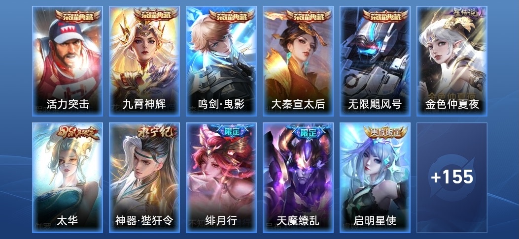 蘭陵王-隱刃,張飛-亂世虎臣,明世隱-虹雲星官,劉邦-德古拉伯爵,王昭君-幻想奇妙夜,沈夢溪-棒球奇才,妲己-紫羅蘭之誓,李信-灼熱之刃,楊玉環-霓裳曲,海月-幻泉霧影,牛魔-西部大鏢客,高漸離-金屬狂潮,姜子牙-熾熱元素使,鏡-冰刃幻境,曹操-幽靈船長,亞瑟-死亡騎士,孫悟空-西部大鏢客,墨子-金屬風暴,瀾-孤獵,諸葛亮-星航指揮官,娜可露露-晚螢,鬼谷子-阿摩司公爵,露娜-緋紅之刃,韓信-街頭霸王,趙雲-白執事,花木蘭-水晶獵龍者,白起-星夜王子,伽羅-花見巫女,蘭陵王-暗隱獵獸者,百里守約-絕影神槍,孫尚香-水果甜心,曹操-死神來了,呂布-末日機甲,狄仁傑-鷹眼統帥,劉邦-聖殿之光,米萊狄-精準探案法,劉備-漢昭烈帝,雅典娜-冰冠公主,姜子牙-時尚教父,諸葛亮-黃金分割率,司馬懿-暗淵魔法,弈星-踏雪尋梅,扁鵲-化身博士,趙雲-忍·炎影,王昭君-精靈公主,雲纓-赤焰之纓,妲己-少女阿狸,司馬懿-魘語軍師,白起-白色死神,后羿-精靈王,魯班大師-歸虛夢演,阿軻-暗夜貓娘,小喬-繽紛獨角獸,馬超-倖存者,宮本武藏-霸王丸,露娜-紫霞仙子,白起-樂園追獵者,盾山-極冰防禦線,項羽-科學大爆炸,裴擒虎-梅西,張飛-五福同心,墨子-進擊墨子號,鬼谷子-幻樂之宴,孫策-貓狗日記,安琪拉-心靈駭客,橘右京-修羅,虞姬-加勒比小姐,劉禪-天才門將,韓信-教廷特使,關羽-龍騰萬里,李白-千年之狐,蒙恬-秩序獵龍將,狂鐵-命運角鬥場,項羽-蒼穹之光,張良-一千零一夜,魯班七號-電玩小子,安琪拉-時之奇旅,孫臏-天使之翼,干將莫邪-第七人偶,貂蟬-異域舞娘,馬可波羅-激情綠茵,妲己-魅力維加斯,雅典娜-戰爭女神,張良-古海尋蹤,達摩-拳王,楊戩-埃及法老,夏侯惇-乘風破浪,鍾馗-地府判官,程咬金-愛與正義,嬴政-暗夜貴公子,瑤-森,夏侯惇-戰爭騎士,成吉思汗-維京掠奪者,典韋-鐵甲之心,大喬-伊勢巫女,呂布-聖誕狂歡,鎧-龍域領主,妲己-女僕咖啡,東皇太一-東海龍王