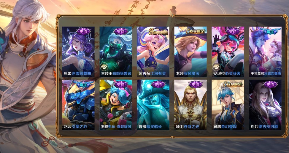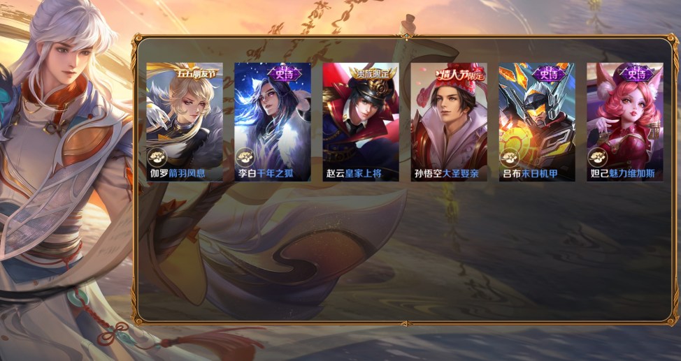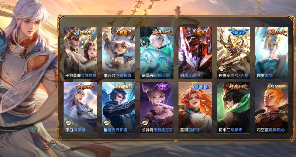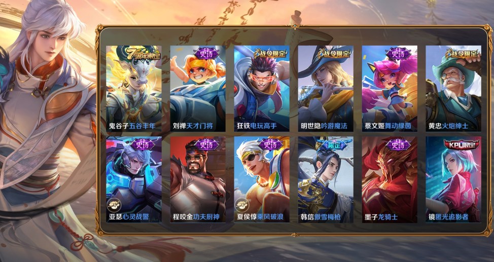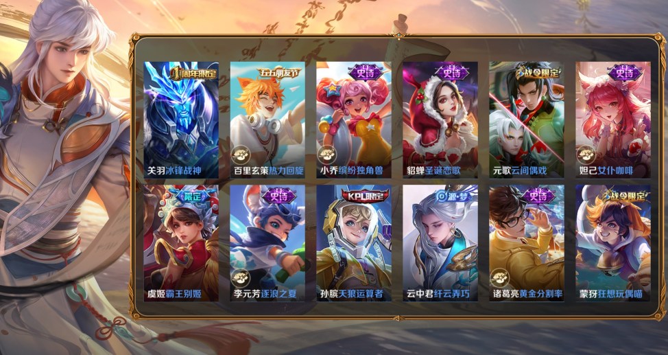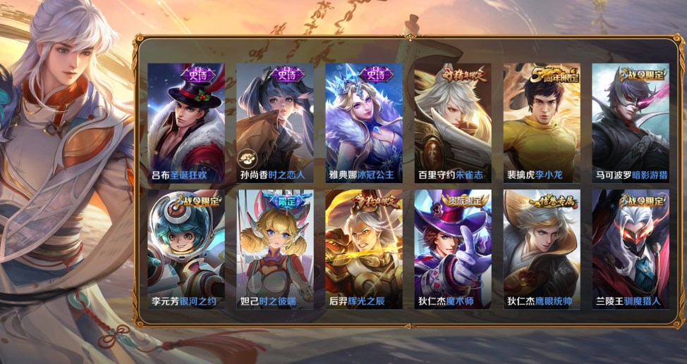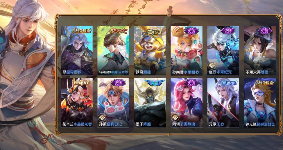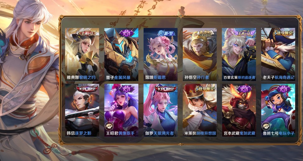 桑啟-畫中遊,阿古朵-熊喵少女,百里守約-絕影神槍,蔡文姬-薔薇王座,曹操-超能戰警,曹操-死神來了,成吉思汗-維京掠奪者,大喬-伊勢巫女,狄仁傑-錦衣衛,貂蟬-異域舞娘,盾山-極冰防禦線,伽羅-花見巫女,干將莫邪-第七人偶,高漸離-金屬狂潮,公孫離-花間舞,關羽-天啟騎士,后羿-精靈王,花木蘭-劍舞者,黃忠-芝加哥教父,金蟬-前塵,鏡-冰刃幻境,鎧-龍域領主,瀾-孤獵,李白-範海辛,李信-灼熱之刃,李元芳-特種部隊,露娜-緋紅之刃,魯班大師-歸虛夢演,魯班七號-木偶奇遇記,魯班七號-福祿兄弟,馬超-倖存者,馬可波羅-激情綠茵,蒙恬-秩序獵龍將,蒙犽-歸虛夢演,夢奇-美夢成真,米萊狄-精準探案法,明世隱-占星師,哪吒-三太子,女媧-尼羅河女神,盤古-創世神祝,上官婉兒-修竹墨客,沈夢溪-棒球奇才,司空震-啟蟄,司馬懿-魘語軍師,蘇烈-愛與和平,孫策-海之征途,孫悟空-西部大鏢客,太乙真人-圓桌騎士,王昭君-精靈公主,項羽-帝國元帥,雅典娜-戰爭女神,楊戩-埃及法老,瑤-森,曜-歸虛夢演,虞姬-加勒比小姐,元歌-午夜歌劇院,雲纓-赤焰之纓,張良-一千零一夜,鍾馗-地府判官,鍾無豔-生化警戒,諸葛亮-星航指揮官,豬八戒-年年有餘