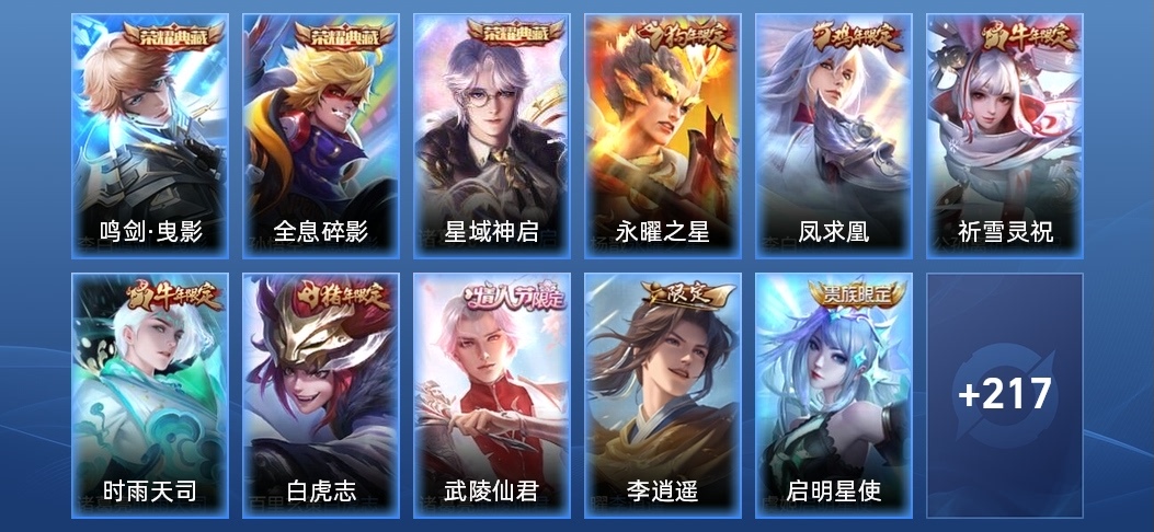 蘭陵王-隱刃,孫尚香-時之戀人,張飛-亂世虎臣,李元芳-特種部隊,花木蘭-劍舞者,女媧-尼羅河女神,豬八戒-潮玩探月行,明世隱-虹雲星官,夢奇-美夢成真,王昭君-幻想奇妙夜,劉邦-德古拉伯爵,沈夢溪-棒球奇才,張良-幽蘭居士,李信-灼熱之刃,楊玉環-霓裳曲,裴擒虎-街頭旋風,呂布-野性能量,狄仁傑-錦衣衛,鏡-冰刃幻境,程咬金-星際陸戰隊,曹操-幽靈船長,亞瑟-死亡騎士,蔡文姬-舞動綠茵,老夫子-功夫老勺,亞瑟-心靈戰警,宮本武藏-永珍初新,雲中君-荷魯斯之眼,墨子-金屬風暴,瀾-孤獵,百里守約-特工魅影,程咬金-功夫廚神,趙雲-未來紀元,諸葛亮-星航指揮官,露娜-緋紅之刃,韓信-街頭霸王,阿軻-致命風華,孫策-海之征途,花木蘭-水晶獵龍者,韓信-白龍吟,曜-歸虛夢演,白起-星夜王子,伽羅-花見巫女,百里守約-絕影神槍,蘭陵王-暗隱獵獸者,盾山-圓桌騎士,曹操-死神來了,呂布-末日機甲,甄姬-花好人間,狄仁傑-鷹眼統帥,花木蘭-兔女郎,沈夢溪-鯊炮海盜貓,周瑜-海軍大將,劉備-漢昭烈帝,諸葛亮-掌控之力,雅典娜-冰冠公主,諸葛亮-黃金分割率,劉禪-英喵野望,嬴政-搖滾巨星,劉禪-秘密基地,弈星-踏雪尋梅,黃忠-芝加哥教父,李白-範海辛,蘇烈-堅韌之力,小喬-萬聖前夜,李元芳-逐浪之夏,扁鵲-化身博士,趙雲-忍·炎影,西施-歸虛夢演,阿古朵-熊喵少女,雲纓-赤焰之纓,妲己-少女阿狸,司馬懿-魘語軍師,白起-白色死神,公孫離-花間舞,鎧-曙光守護者,桑啟-畫中遊,貂蟬-聖誕戀歌,嫦娥-露花倒影,小喬-繽紛獨角獸,馬超-倖存者,宮本武藏-未來紀元,廉頗-地獄巖魂,孫臏-未來旅行,露娜-紫霞仙子,盾山-極冰防禦線,程咬金-無雙福將,上官婉兒-修竹墨客,裴擒虎-梅西,張飛-五福同心,司空震-啟蟄,盤古-創世神祝,蒙犽-歸虛夢演,姬小滿-零食大作戰,安琪拉-心靈駭客,橘右京-修羅,虞姬-加勒比小姐,韓信-教廷特使,關羽-龍騰萬里,李白-千年之狐,蒙恬-秩序獵龍將,露娜-哥特玫瑰,劉備-紐約教父,魯班七號-電玩小子,劉備-萬事如意,干將莫邪-第七人偶,孫臏-天使之翼,王昭君-偶像歌手,貂蟬-異域舞娘,蔡文姬-薔薇王座,哪吒-次元突破,馬可波羅-激情綠茵,李白-敏銳之力,妲己-魅力維加斯,雅典娜-戰爭女神,張良-繽紛繪卷,達摩-拳王,元歌-午夜歌劇院,孫尚香-沉穩之力,夏侯惇-乘風破浪,鍾馗-地府判官,嬴政-暗夜貴公子,宮本武藏-鬼劍武藏,瑤-森,成吉思汗-維京掠奪者,夏侯惇-戰爭騎士,鍾無豔-海灘麗影,項羽-帝國元帥,大喬-伊勢巫女,小喬-丁香結,呂布-聖誕狂歡,鎧-龍域領主,東皇太一-東海龍王