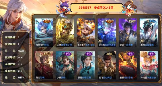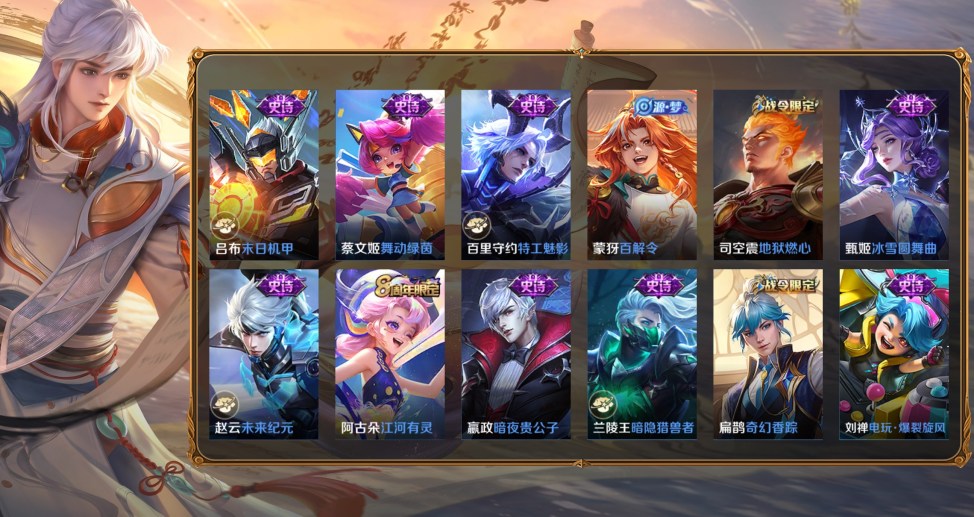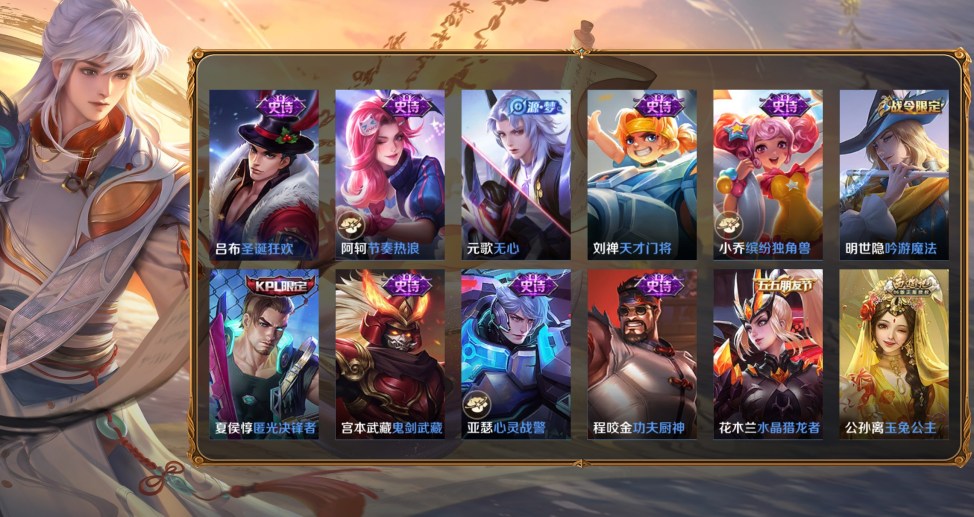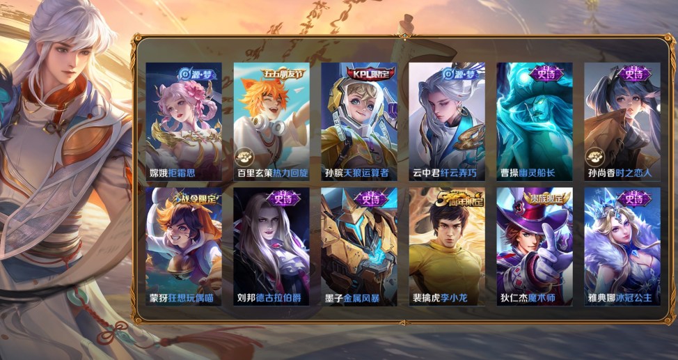 羋月-紅桃皇后,亞連-破局者,鍾無豔-聚星閃耀,海月-王牌新星,張良-古海尋蹤,艾琳-流音漫舞,明世隱-疑決卦,李元芳-妄想特派,劉備-潮玩造夢師,安琪拉-玩偶對對碰,姜子牙-熾熱元素使,墨子-進擊墨子號,孫臏-歸虛夢演,項羽-海灘派對,亞瑟-死亡騎士,魯班大師-探海日誌,楊戩-潮玩騎兵,裴擒虎-擒濤扼浪,沈夢溪-大漠名商,米萊狄-契約魔法,劉禪-喚靈魔甲,白起-夜都怪俠,白起-白色死神,扁鵲-化身博士,程咬金-愛與正義,程咬金-無雙福將,達摩-大發明家,達摩-拳王,達摩-沙漠行僧,妲己-少女阿狸,大喬-守護之力,狄仁傑-陰陽師,狄仁傑-萬華元夜,典韋-黃金武士,典韋-鐵甲之心,典韋-窮奇,盾山-御鑾,盾山-圓桌騎士,高漸離-玩趣惡龍,宮本武藏-霸王丸,鬼谷子-幻樂之宴,鬼谷子-原初探秘者,韓信-教廷特使,后羿-阿爾法小隊,花木蘭-兔女郎,狂鐵-御獅,狂鐵-特工戰影,老夫子-功夫老勺,老夫子-醍醐杖,李白-敏銳之力,廉頗-無盡征程,劉邦-虎嘯劍宗,劉備-萬事如意,劉備-紐約教父,劉備-漢昭烈帝,劉禪-秘密基地,露娜-哥特玫瑰,露娜-瓷語鑑心,魯班大師-乓乓大師,魯班七號-黑桃隊長,呂布-野性能量,米萊狄-御霄,羋月-幻夜卜夢,明世隱-虹雲星官,哪吒-次元突破,牛魔-西部大鏢客,牛魔-御旌,沈夢溪-鯊炮海盜貓,蘇烈-堅韌之力,蘇烈-千軍破陣,孫尚香-沉穩之力,項羽-科學大爆炸,雅典娜-單詞大作戰,楊戩-次元傲視,弈星-混沌棋,甄姬-花好人間,鍾馗-驅儺正儀,鍾無豔-海灘麗影,諸葛亮-掌控之力,莊周-奇妙博物學,太乙真人-勁辣紅鍋,姜子牙-時尚教父