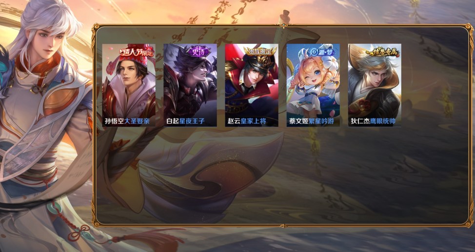 達摩-黃金獅子座,百里守約-碎雲,李信-一念神魔,狄仁傑-超時空戰士,虞姬-雲霓雀翎