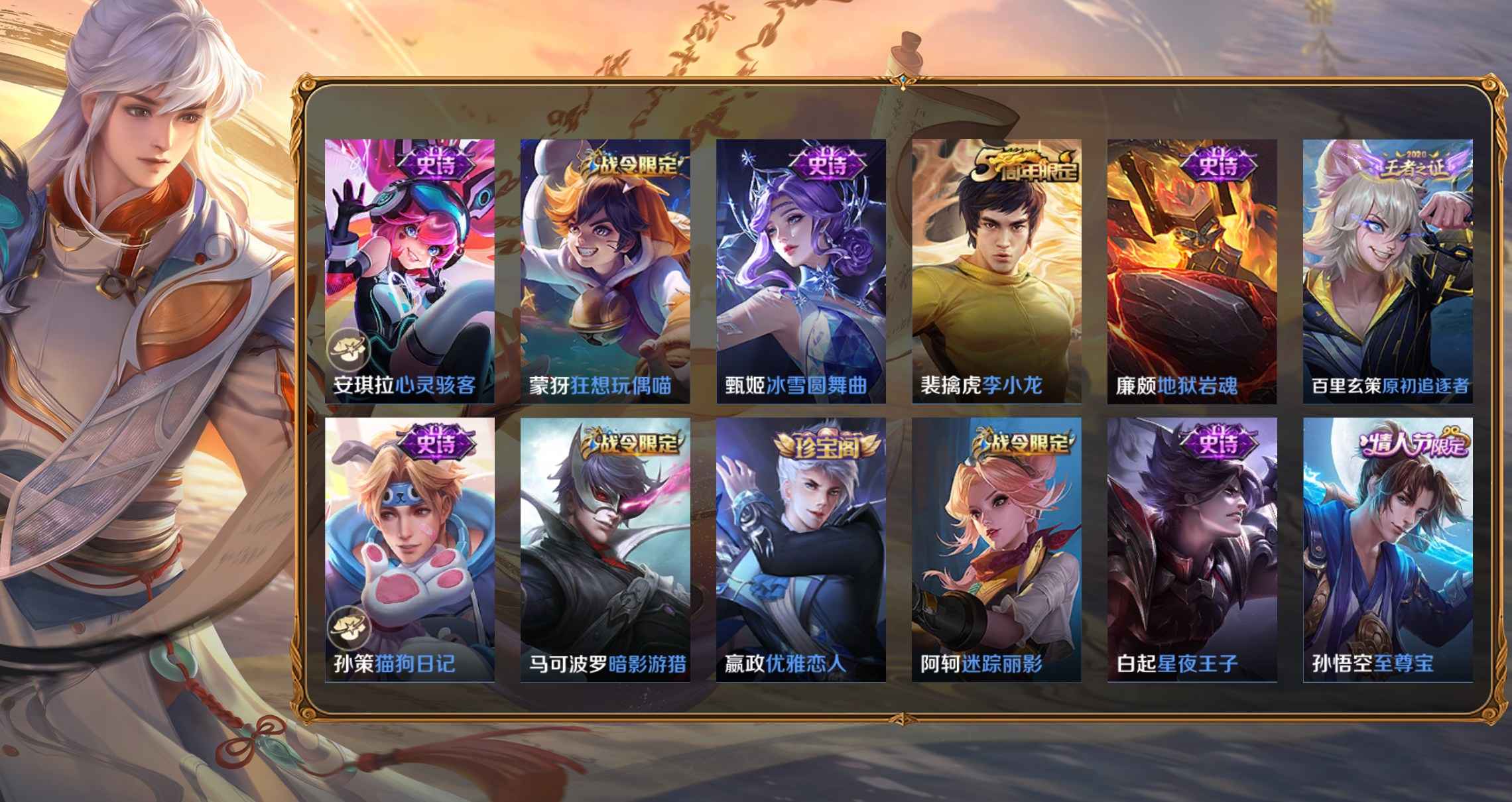 阿古朵-熊喵少女,百里守約-絕影神槍,百里玄策-威尼斯狂歡,曹操-死神來了,嫦娥-露花倒影,成吉思汗-維京掠奪者,大喬-伊勢巫女,狄仁傑-錦衣衛,貂蟬-異域舞娘,東皇太一-東海龍王,干將莫邪-第七人偶,高漸離-金屬狂潮,公孫離-花間舞,關羽-天啟騎士,花木蘭-劍舞者,黃忠-芝加哥教父,鏡-冰刃幻境,鎧-龍域領主,蘭陵王-隱刃,老夫子-潮流仙人,李白-範海辛,李元芳-特種部隊,劉邦-聖殿之光,魯班七號-木偶奇遇記,魯班七號-福祿兄弟,馬超-倖存者,馬可波羅-激情綠茵,蒙恬-秩序獵龍將,蒙犽-歸虛夢演,明世隱-占星師,上官婉兒-修竹墨客,沈夢溪-棒球奇才,司馬懿-魘語軍師,蘇烈-愛與和平,孫悟空-西部大鏢客,王昭君-精靈公主,夏侯惇-戰爭騎士,項羽-帝國元帥,楊戩-埃及法老,曜-歸虛夢演,虞姬-加勒比小姐,元歌-午夜歌劇院,雲中君-荷魯斯之眼