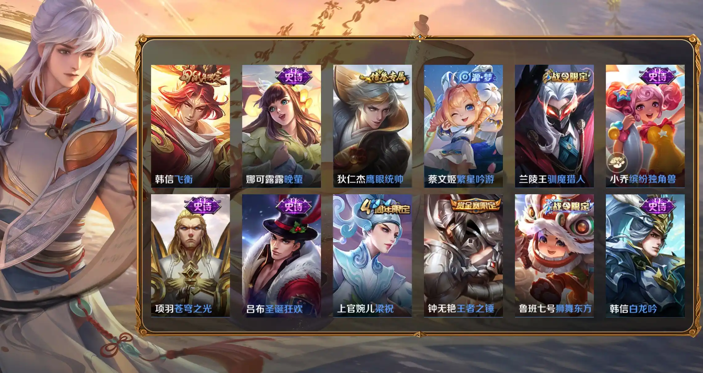 韓信-飛衡,孫策-貓狗日記,項羽-蒼穹之光,李元芳-銀河之約,百里玄策-原初追逐者,雲中君-纖雲弄巧,狄仁傑-鷹眼統帥,呂布-聖誕狂歡,趙雲-未來紀元,阿軻-迷蹤麗影,安琪拉-心靈駭客,白起-星夜王子,不知火舞-魅語,曹操-幽靈船長,蔡文姬-繁星吟遊,嫦娥-如夢令,程咬金-功夫廚神,妲己-魅力維加斯,妲己-時之彼端,狄仁傑-魔術師,典韋-藍色畫面警告,典韋-岱宗,貂蟬-聖誕戀歌,韓信-白龍吟,后羿-如夢令,花木蘭-水晶獵龍者,橘右京-修羅,蘭陵王-馴魔獵人,李白-千年之狐,廉頗-地獄巖魂,劉邦-德古拉伯爵,露娜-紫霞仙子,魯班七號-電玩小子,魯班七號-獅舞東方,馬可波羅-暗影遊獵,蒙犽-狂想玩偶喵,娜可露露-晚螢,上官婉兒-梁祝,裴擒虎-李小龍,孫尚香-水果甜心,孫悟空-至尊寶,王昭君-偶像歌手,夏侯惇-乘風破浪,小喬-繽紛獨角獸,楊玉環-遇見飛天,嬴政-優雅戀人,嬴政-白晝王子,元歌-雲間偶戲,趙雲-皇家上將,甄姬-冰雪圓舞曲,鍾無豔-王者之錘,諸葛亮-黃金分割率