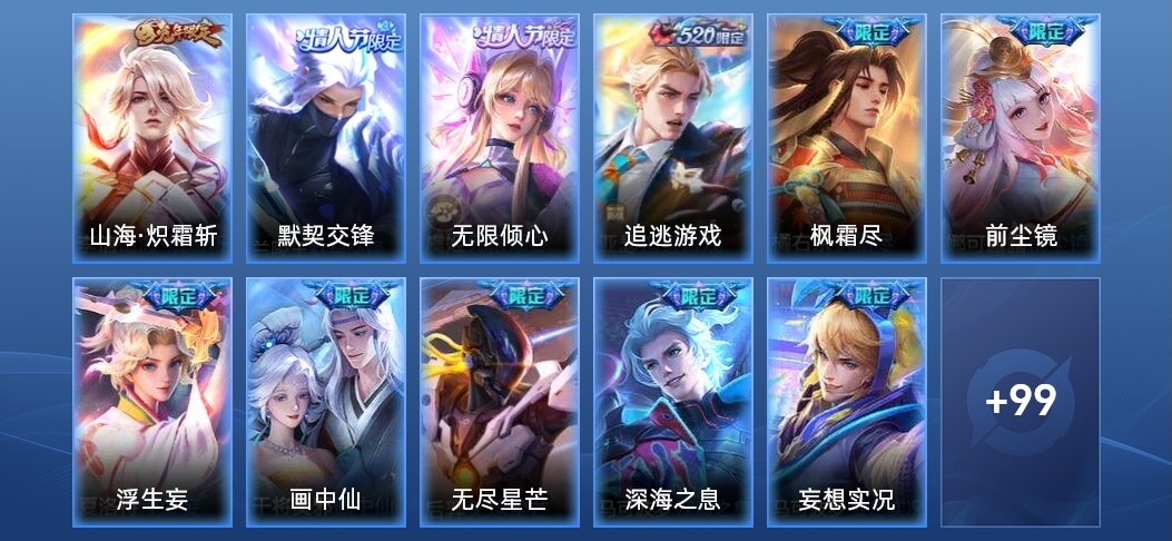 馬可波羅-妄想實況,虞姬-無限傾心,干將莫邪-畫中仙,娜可露露-前塵鏡,亞瑟-追逃遊戲,橘右京-楓霜盡,夏洛特-浮生妄,馬可波羅-深海之息,后羿-無盡星芒,孫悟空-齊天大聖,李信-山海·熾霜斬,曜-李逍遙,蘭陵王-默契交鋒