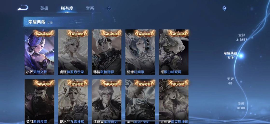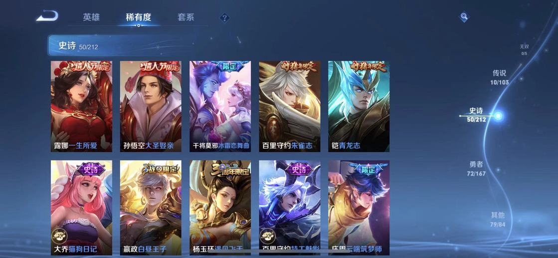 蘭陵王-隱刃,張飛-亂世虎臣,花木蘭-劍舞者,李元芳-特種部隊,女媧-尼羅河女神,明世隱-虹雲星官,王昭君-幻想奇妙夜,劉邦-德古拉伯爵,夢奇-美夢成真,張良-幽蘭居士,沈夢溪-棒球奇才,哪吒-三太子,關羽-天啟騎士,李信-灼熱之刃,楊玉環-霓裳曲,大喬-守護之力,裴擒虎-街頭旋風,牛魔-西部大鏢客,高漸離-金屬狂潮,豬八戒-年年有餘,孫尚香-火炮千金,姜子牙-熾熱元素使,狄仁傑-錦衣衛,鍾無豔-生化警戒,鏡-冰刃幻境,老夫子-潮流仙人,曹操-超能戰警,程咬金-星際陸戰隊,曹操-幽靈船長,亞瑟-死亡騎士,老夫子-功夫老勺,宮本武藏-永珍初新,孫悟空-西部大鏢客,安琪拉-如懿,雲中君-荷魯斯之眼,張良-天堂福音,墨子-金屬風暴,瀾-孤獵,百里守約-特工魅影,趙雲-未來紀元,諸葛亮-星航指揮官,娜可露露-晚螢,鬼谷子-阿摩司公爵,甄姬-冰雪圓舞曲,露娜-緋紅之刃,扁鵲-救世之瞳,韓信-街頭霸王,阿軻-致命風華,趙雲-白執事,孫策-海之征途,韓信-白龍吟,花木蘭-水晶獵龍者,曜-歸虛夢演,伽羅-花見巫女,阿軻-愛心護理,百里守約-絕影神槍,蘭陵王-暗隱獵獸者,典韋-黃金武士,武則天-東方不敗,不知火舞-魅語,孫尚香-水果甜心,曹操-死神來了,甄姬-花好人間,狄仁傑-鷹眼統帥,劉邦-聖殿之光,沈夢溪-鯊炮海盜貓,花木蘭-兔女郎,米萊狄-精準探案法,劉備-漢昭烈帝,周瑜-海軍大將,姜子牙-時尚教父,諸葛亮-黃金分割率,劉禪-英喵野望,嬴政-搖滾巨星,弈星-踏雪尋梅,程咬金-華爾街大亨,明世隱-占星師,黃忠-芝加哥教父,李白-範海辛,蘇烈-堅韌之力,小喬-萬聖前夜,扁鵲-化身博士,蘇烈-愛與和平,牛魔-制霸全明星,魯班七號-福祿兄弟,趙雲-忍·炎影,百里玄策-威尼斯狂歡,阿古朵-熊喵少女,西施-歸虛夢演,王昭君-精靈公主,妲己-少女阿狸,劉禪-喚靈魔甲,司馬懿-魘語軍師,白起-白色死神,后羿-精靈王,公孫離-花間舞,魯班大師-歸虛夢演,貂蟬-聖誕戀歌,嫦娥-露花倒影,小喬-繽紛獨角獸,馬超-倖存者,宮本武藏-霸王丸,宮本武藏-未來紀元,露娜-紫霞仙子,孫臏-未來旅行,盾山-極冰防禦線,達摩-大發明家,上官婉兒-修竹墨客,項羽-科學大爆炸,張飛-五福同心,墨子-進擊墨子號,大喬-貓狗日記,盤古-創世神祝,鬼谷子-幻樂之宴,蒙犽-歸虛夢演,安琪拉-心靈駭客,橘右京-修羅,虞姬-加勒比小姐,魯班七號-木偶奇遇記,關羽-龍騰萬里,韓信-教廷特使,李白-千年之狐,蒙恬-秩序獵龍將,莊周-奇妙博物學,狂鐵-命運角鬥場,露娜-哥特玫瑰,張良-一千零一夜,劉備-萬事如意,孫臏-天使之翼,干將莫邪-第七人偶,王昭君-偶像歌手,貂蟬-異域舞娘,蔡文姬-薔薇王座,哪吒-次元突破,馬可波羅-激情綠茵,妲己-魅力維加斯,雅典娜-戰爭女神,元歌-午夜歌劇院,達摩-拳王,楊戩-埃及法老,莊周-鯉魚之夢,夏侯惇-乘風破浪,鍾馗-地府判官,程咬金-愛與正義,嬴政-暗夜貴公子,妲己-仙境愛麗絲,羋月-紅桃皇后,瑤-森,成吉思汗-維京掠奪者,夏侯惇-戰爭騎士,鍾無豔-海灘麗影,項羽-帝國元帥,后羿-阿爾法小隊,安琪拉-玩偶對對碰,大喬-伊勢巫女,呂布-聖誕狂歡,鎧-龍域領主,妲己-女僕咖啡,東皇太一-東海龍王,太乙真人-圓桌騎士