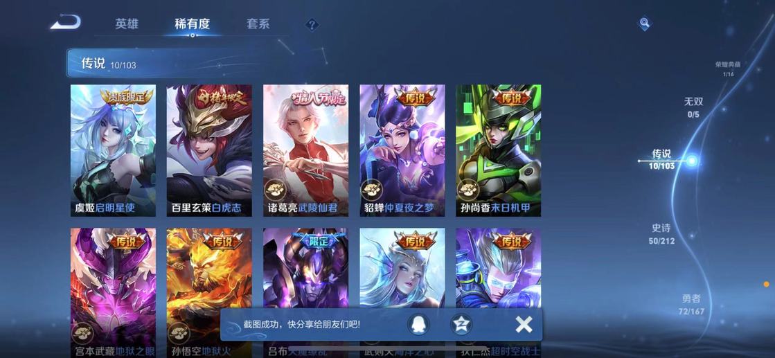 孫悟空-大聖娶親,裴擒虎-李小龍,花木蘭-瑞麟志,鎧-青龍志,王昭君-鳳凰于飛,甄姬-遊園驚夢,干將莫邪-冰霜戀舞曲,嫦娥-如夢令,狄仁傑-魔術師,趙雲-皇家上將,阿軻-迷蹤麗影,李元芳-銀河之約,莊周-雲端築夢師,嬴政-白晝王子,楊玉環-遇見飛天,百里守約-朱雀志,蘇烈-玄武志,關羽-冰鋒戰神,虞姬-霸王別姬,露娜-一生所愛,馬可波羅-逐夢之星