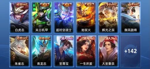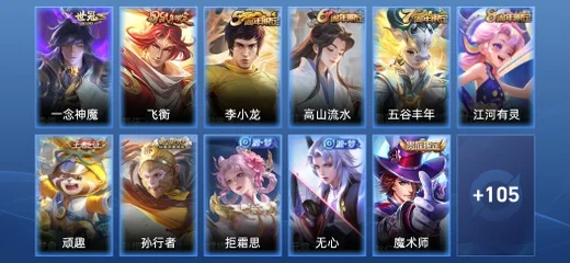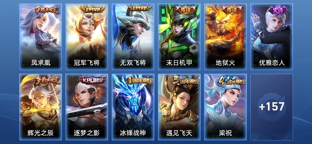蘭陵王-隱刃,李元芳-特種部隊,花木蘭-劍舞者,豬八戒-潮玩探月行,明世隱-虹雲星官,哪吒-三太子,李信-灼熱之刃,大喬-守護之力,裴擒虎-街頭旋風,牛魔-西部大鏢客,高漸離-金屬狂潮,呂布-野性能量,姜子牙-熾熱元素使,狄仁傑-錦衣衛,鏡-冰刃幻境,曹操-幽靈船長,亞瑟-死亡騎士,老夫子-功夫老勺,宮本武藏-永珍初新,孫悟空-西部大鏢客,雲中君-荷魯斯之眼,墨子-金屬風暴,瀾-孤獵,百里守約-特工魅影,程咬金-功夫廚神,趙雲-未來紀元,諸葛亮-星航指揮官,鬼谷子-阿摩司公爵,魯班大師-乓乓大師,露娜-緋紅之刃,韓信-街頭霸王,阿軻-致命風華,孫策-海之征途,花木蘭-水晶獵龍者,曜-歸虛夢演,墨子-龍騎士,孫臏-歸虛夢演,伽羅-花見巫女,阿軻-愛心護理,百里守約-絕影神槍,蘭陵王-暗隱獵獸者,典韋-黃金武士,盾山-圓桌騎士,孫尚香-水果甜心,曹操-死神來了,甄姬-花好人間,狄仁傑-鷹眼統帥,沈夢溪-鯊炮海盜貓,花木蘭-兔女郎,米萊狄-精準探案法,周瑜-海軍大將,劉備-漢昭烈帝,諸葛亮-掌控之力,劉禪-秘密基地,弈星-踏雪尋梅,李白-範海辛,阿軻-節奏熱浪,蘇烈-堅韌之力,扁鵲-化身博士,百里玄策-威尼斯狂歡,阿古朵-熊喵少女,雲纓-赤焰之纓,王昭君-精靈公主,妲己-少女阿狸,司馬懿-魘語軍師,白起-白色死神,后羿-精靈王,公孫離-花間舞,魯班大師-歸虛夢演,貂蟬-聖誕戀歌,嫦娥-露花倒影,馬超-倖存者,宮本武藏-霸王丸,達摩-大發明家,程咬金-無雙福將,上官婉兒-修竹墨客,項羽-科學大爆炸,金蟬-前塵,裴擒虎-梅西,張飛-五福同心,司空震-啟蟄,盤古-創世神祝,鬼谷子-幻樂之宴,蒙犽-歸虛夢演,安琪拉-心靈駭客,關羽-龍騰萬里,韓信-教廷特使,李白-千年之狐,劉備-紐約教父,露娜-哥特玫瑰,魯班七號-電玩小子,劉備-萬事如意,貂蟬-異域舞娘,哪吒-次元突破,馬可波羅-激情綠茵,李白-敏銳之力,妲己-魅力維加斯,張良-繽紛繪卷,雅典娜-戰爭女神,張良-古海尋蹤,元歌-午夜歌劇院,達摩-拳王,楊戩-埃及法老,孫尚香-沉穩之力,夏侯惇-乘風破浪,鍾馗-地府判官,宮本武藏-鬼劍武藏,羋月-紅桃皇后,瑤-森,成吉思汗-維京掠奪者,鍾無豔-海灘麗影,項羽-帝國元帥,狂鐵-特工戰影,大喬-伊勢巫女,鎧-龍域領主,呂布-聖誕狂歡,小喬-丁香結