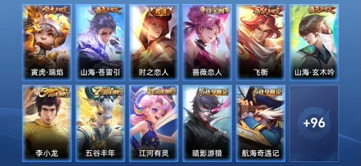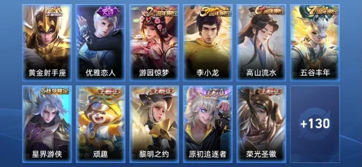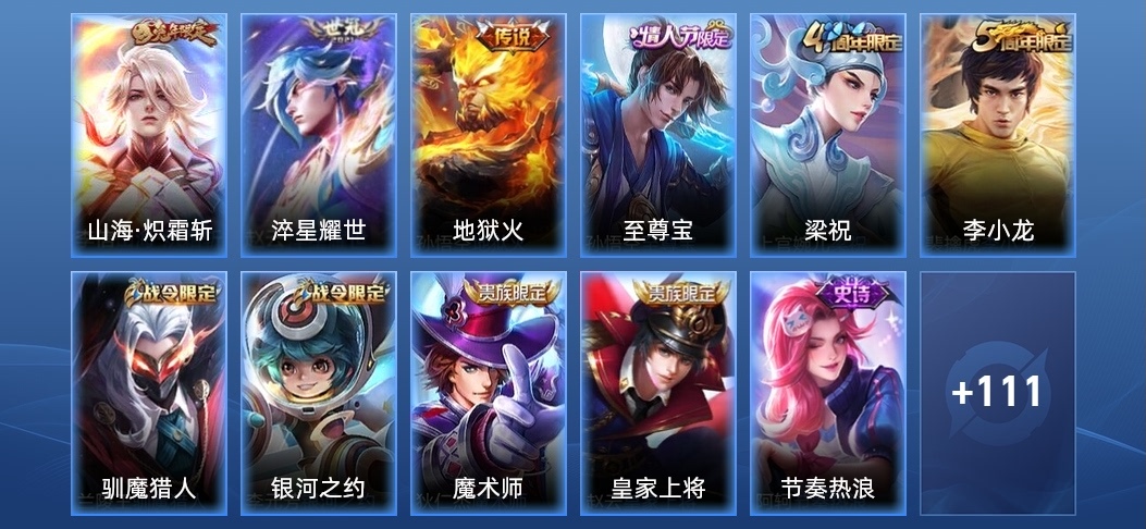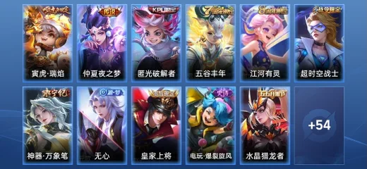 劉禪-喚靈魔甲,司馬懿-魘語軍師,白起-白色死神,后羿-精靈王,公孫離-花間舞,花木蘭-劍舞者,魯班大師-歸虛夢演,李元芳-特種部隊,豬八戒-潮玩探月行,明世隱-虹雲星官,嫦娥-露花倒影,哪吒-三太子,宮本武藏-霸王丸,關羽-天啟騎士,李信-灼熱之刃,孫臏-未來旅行,盾山-極冰防禦線,達摩-大發明家,裴擒虎-街頭旋風,呂布-野性能量,張飛-五福同心,豬八戒-年年有餘,姜子牙-熾熱元素使,鍾無豔-生化警戒,盤古-創世神祝,程咬金-星際陸戰隊,亞瑟-死亡騎士,蔡文姬-舞動綠茵,魯班七號-木偶奇遇記,老夫子-功夫老勺,宮本武藏-永珍初新,孫悟空-西部大鏢客,關羽-龍騰萬里,李白-千年之狐,韓信-教廷特使,墨子-金屬風暴,狂鐵-命運角鬥場,劉備-紐約教父,劉備-萬事如意,貂蟬-異域舞娘,魯班大師-乓乓大師,韓信-街頭霸王,哪吒-次元突破,馬可波羅-激情綠茵,孫策-海之征途,孫臏-歸虛夢演,伽羅-花見巫女,阿軻-愛心護理,百里守約-絕影神槍,達摩-拳王,典韋-黃金武士,盾山-圓桌騎士,孫尚香-沉穩之力,孫尚香-水果甜心,曹操-死神來了,鍾馗-地府判官,甄姬-花好人間,狄仁傑-鷹眼統帥,花木蘭-兔女郎,魯班七號-黑桃隊長,夏侯惇-戰爭騎士,鍾無豔-海灘麗影,劉備-漢昭烈帝,姜子牙-時尚教父,后羿-阿爾法小隊,諸葛亮-黃金分割率,黃忠-芝加哥教父,阿軻-節奏熱浪,鎧-龍域領主,呂布-聖誕狂歡,小喬-萬聖前夜,扁鵲-化身博士,魯班七號-福祿兄弟,蒙恬-蔚藍守將,趙雲-忍·炎影,百里玄策-威尼斯狂歡,阿古朵-熊喵少女,妲己-少女阿狸