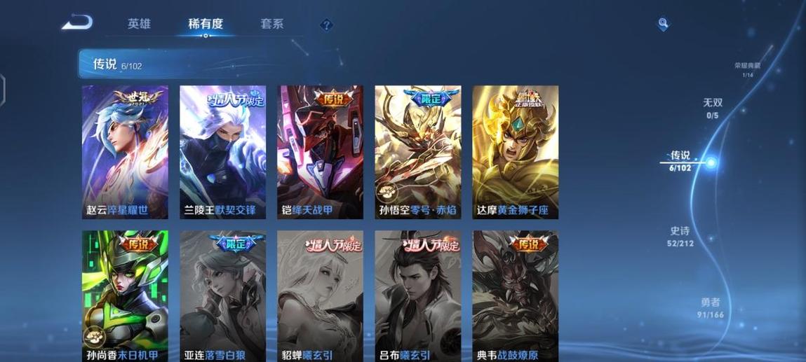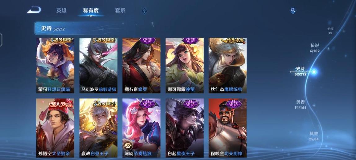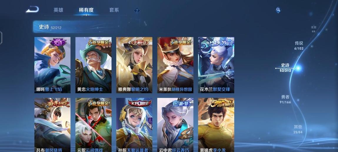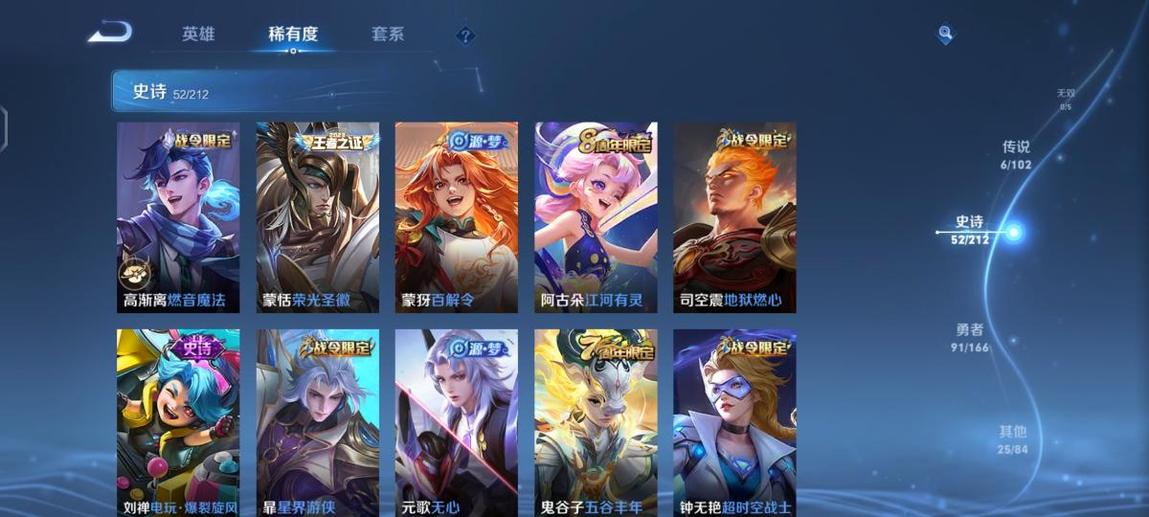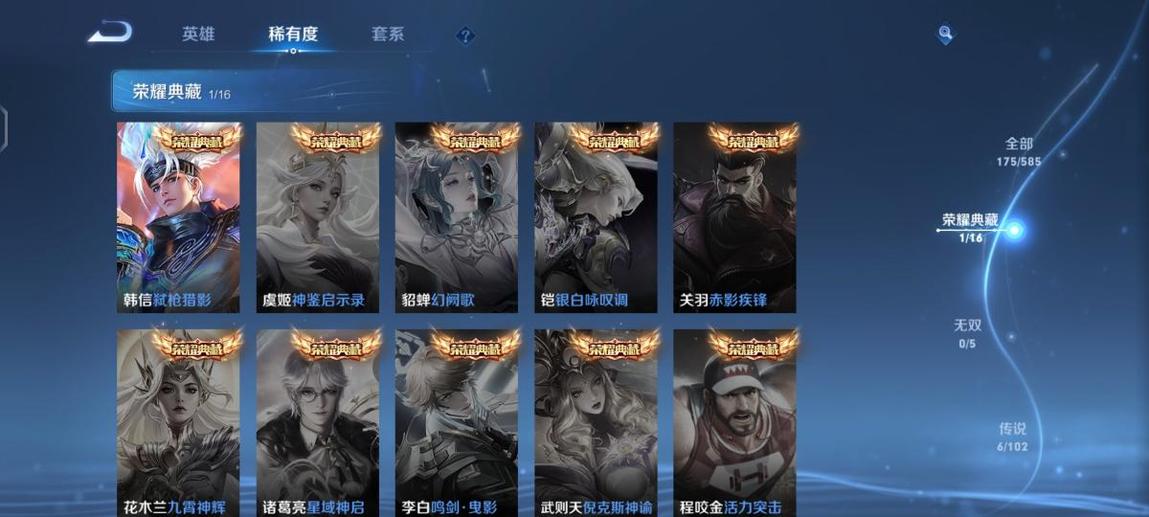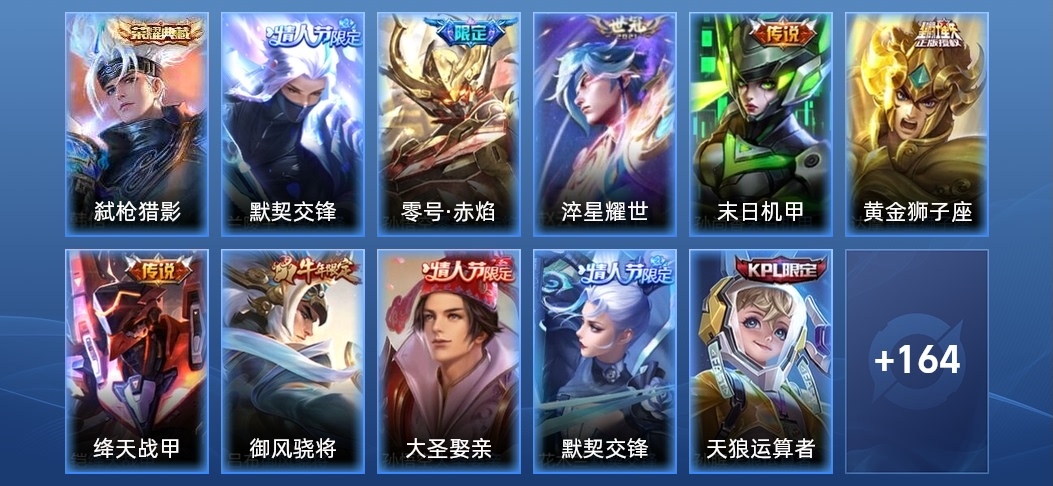 劉禪-電玩·爆裂旋風,蘭陵王-隱刃,豬八戒-潮玩探月行,明世隱-虹雲星官,王昭君-幻想奇妙夜,夢奇-美夢成真,關羽-天啟騎士,大喬-守護之力,裴擒虎-街頭旋風,牛魔-西部大鏢客,呂布-野性能量,姜子牙-熾熱元素使,狄仁傑-錦衣衛,曹操-超能戰警,李元芳-妄想特派,曹操-幽靈船長,亞瑟-死亡騎士,蔡文姬-舞動綠茵,老夫子-功夫老勺,宮本武藏-永珍初新,孫悟空-西部大鏢客,墨子-金屬風暴,瀾-孤獵,程咬金-功夫廚神,趙雲-未來紀元,娜可露露-晚螢,鬼谷子-阿摩司公爵,甄姬-冰雪圓舞曲,魯班大師-乓乓大師,韓信-街頭霸王,孫策-海之征途,曜-歸虛夢演,白起-星夜王子,哪吒-雪上飛焰,伽羅-花見巫女,百里守約-絕影神槍,蘭陵王-暗隱獵獸者,典韋-黃金武士,盾山-圓桌騎士,孫尚香-水果甜心,呂布-末日機甲,甄姬-花好人間,狄仁傑-鷹眼統帥,沈夢溪-鯊炮海盜貓,花木蘭-兔女郎,劉備-漢昭烈帝,姜子牙-時尚教父,諸葛亮-黃金分割率,劉禪-英喵野望,嬴政-搖滾巨星,劉禪-秘密基地,黃忠-芝加哥教父,李白-範海辛,阿軻-節奏熱浪,蘇烈-堅韌之力,李元芳-逐浪之夏,扁鵲-化身博士,露娜-瓷語鑑心,蘇烈-愛與和平,趙雲-忍·炎影,妲己-少女阿狸,司馬懿-魘語軍師,太乙真人-勁辣紅鍋,小喬-繽紛獨角獸,宮本武藏-霸王丸,達摩-大發明家,程咬金-無雙福將,張飛-五福同心,司空震-啟蟄,盤古-創世神祝,鬼谷子-幻樂之宴,安琪拉-心靈駭客,橘右京-修羅,牛魔-牛運亨通,劉禪-天才門將,李白-千年之狐,關羽-龍騰萬里,韓信-教廷特使,項羽-蒼穹之光,狂鐵-命運角鬥場,露娜-哥特玫瑰,張良-一千零一夜,楊戩-次元傲視,劉備-萬事如意,孫臏-天使之翼,王昭君-偶像歌手,貂蟬-異域舞娘,哪吒-次元突破,李白-敏銳之力,妲己-魅力維加斯,盤古-重灌意志,張良-繽紛繪卷,雅典娜-戰爭女神,張良-古海尋蹤,達摩-拳王,鍾無豔-聚星閃耀,莊周-鯉魚之夢,孫尚香-沉穩之力,夏侯惇-乘風破浪,鍾馗-地府判官,程咬金-愛與正義,宮本武藏-鬼劍武藏,羋月-紅桃皇后,海月-王牌新星,廉頗-無盡征程,鍾無豔-海灘麗影,鎧-龍域領主,小喬-丁香結,蒙恬-蔚藍守將,艾琳-流音漫舞
