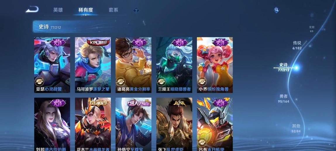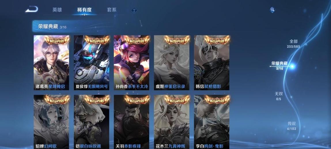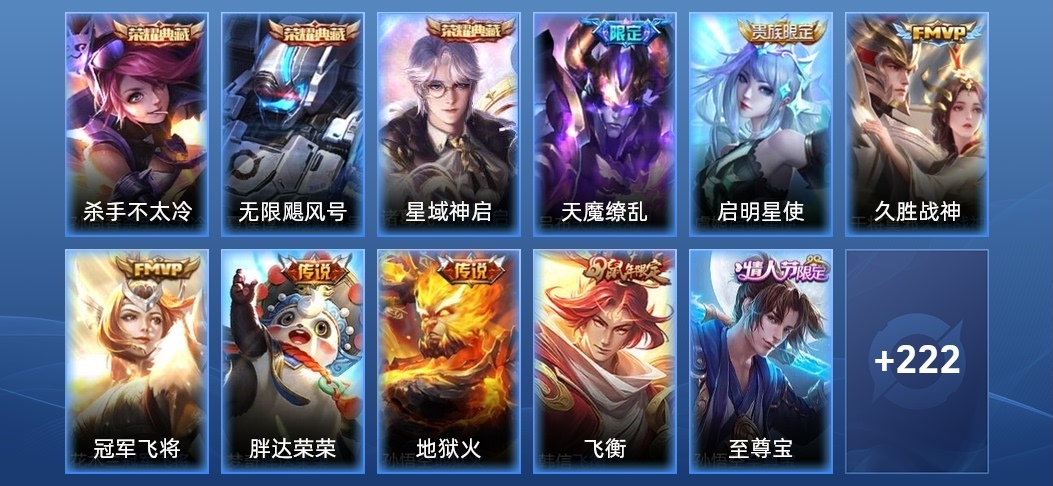 張飛-亂世虎臣,李元芳-特種部隊,豬八戒-潮玩探月行,明世隱-虹雲星官,劉邦-德古拉伯爵,關羽-天啟騎士,李信-灼熱之刃,楊玉環-霓裳曲,裴擒虎-街頭旋風,大喬-守護之力,海月-幻泉霧影,狄仁傑-錦衣衛,鏡-冰刃幻境,萊西奧-西部遊俠,老夫子-潮流仙人,戈婭-危途狂花,程咬金-星際陸戰隊,曹操-幽靈船長,亞瑟-死亡騎士,蔡文姬-舞動綠茵,老夫子-功夫老勺,亞瑟-心靈戰警,宮本武藏-永珍初新,劉邦-虎嘯劍宗,趙懷真-太極少年,楊戩-天秀·啟明,雲中君-荷魯斯之眼,墨子-金屬風暴,瀾-孤獵,百里守約-特工魅影,蒙犽-胡桃狂想曲,趙雲-未來紀元,娜可露露-晚螢,魯班大師-乓乓大師,扁鵲-救世之瞳,趙雲-白執事,花木蘭-水晶獵龍者,孫策-海之征途,曜-歸虛夢演,白起-星夜王子,伽羅-花見巫女,孫臏-歸虛夢演,阿軻-愛心護理,蘭陵王-暗隱獵獸者,典韋-黃金武士,盾山-圓桌騎士,不知火舞-魅語,孫尚香-水果甜心,呂布-末日機甲,甄姬-花好人間,狄仁傑-鷹眼統帥,沈夢溪-鯊炮海盜貓,米萊狄-精準探案法,劉備-漢昭烈帝,雅典娜-冰冠公主,姜子牙-時尚教父,諸葛亮-黃金分割率,劉禪-英喵野望,嬴政-搖滾巨星,劉禪-秘密基地,明世隱-占星師,黃忠-芝加哥教父,弈星-踏雪尋梅,李白-範海辛,蘇烈-堅韌之力,小喬-萬聖前夜,扁鵲-化身博士,露娜-瓷語鑑心,李元芳-逐浪之夏,蘇烈-愛與和平,牛魔-制霸全明星,魯班七號-福祿兄弟,百里玄策-威尼斯狂歡,西施-歸虛夢演,阿古朵-熊喵少女,王昭君-精靈公主,雲纓-赤焰之纓,妲己-少女阿狸,劉禪-喚靈魔甲,司馬懿-魘語軍師,白起-白色死神,太乙真人-勁辣紅鍋,公孫離-花間舞,魯班大師-歸虛夢演,鎧-曙光守護者,桑啟-畫中遊,貂蟬-聖誕戀歌,小喬-繽紛獨角獸,馬超-倖存者,宮本武藏-霸王丸,宮本武藏-未來紀元,廉頗-地獄巖魂,西施-詩語江南,孫臏-未來旅行,露娜-紫霞仙子,白起-樂園追獵者,達摩-大發明家,程咬金-無雙福將,上官婉兒-修竹墨客,金蟬-前塵,墨子-進擊墨子號,司空震-啟蟄,大喬-貓狗日記,盤古-創世神祝,鬼谷子-幻樂之宴,孫策-貓狗日記,蒙犽-歸虛夢演,姬小滿-零食大作戰,安琪拉-心靈駭客,橘右京-修羅,魯班七號-木偶奇遇記,虞姬-加勒比小姐,牛魔-牛運亨通,劉禪-天才門將,韓信-教廷特使,關羽-龍騰萬里,李白-千年之狐,馬可波羅-潮玩牛仔,莊周-奇妙博物學,蒙恬-秩序獵龍將,項羽-蒼穹之光,露娜-哥特玫瑰,魯班七號-電玩小子,張良-一千零一夜,楊戩-次元傲視,夏洛特-永晝,安琪拉-時之奇旅,劉備-萬事如意,孫臏-天使之翼,王昭君-偶像歌手,貂蟬-異域舞娘,哪吒-次元突破,馬可波羅-激情綠茵,公孫離-無限星賞官,妲己-魅力維加斯,盤古-重灌意志,張良-繽紛繪卷,雅典娜-戰爭女神,張良-古海尋蹤,達摩-拳王,元歌-午夜歌劇院,孫尚香-沉穩之力,程咬金-愛與正義,宮本武藏-鬼劍武藏,羋月-紅桃皇后,瑤-森,夏侯惇-戰爭騎士,成吉思汗-維京掠奪者,鍾無豔-海灘麗影,后羿-阿爾法小隊,狂鐵-特工戰影,典韋-鐵甲之心,大喬-伊勢巫女,安琪拉-玩偶對對碰,小喬-丁香結,鎧-龍域領主,妲己-女僕咖啡,蒙恬-蔚藍守將,東皇太一-東海龍王