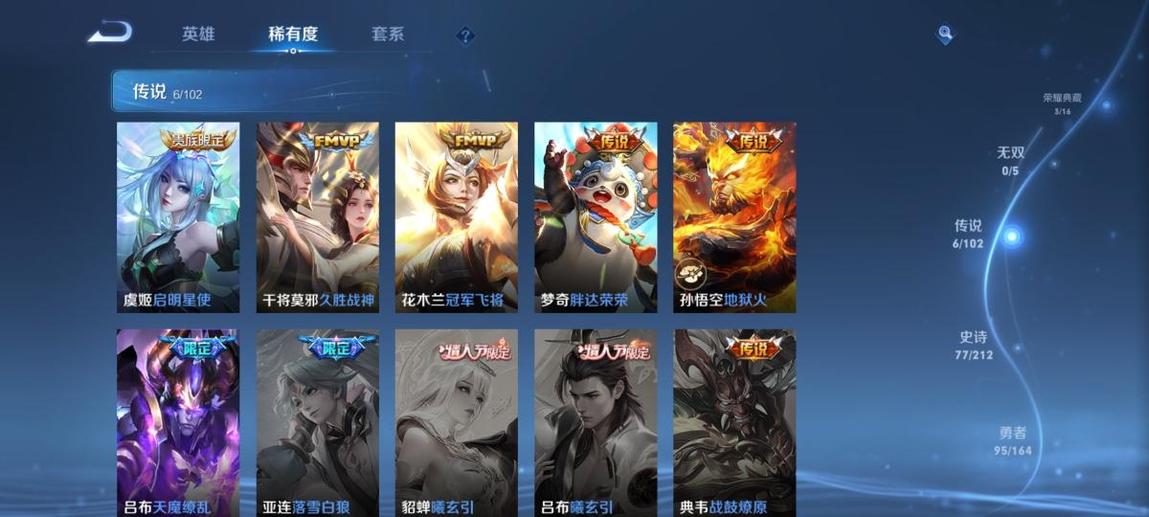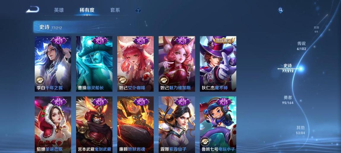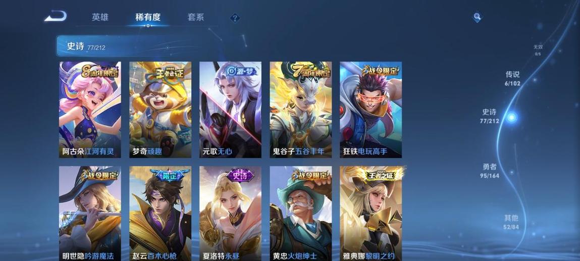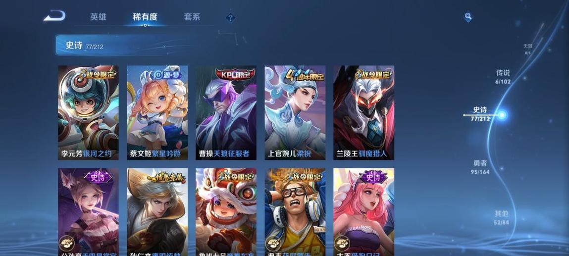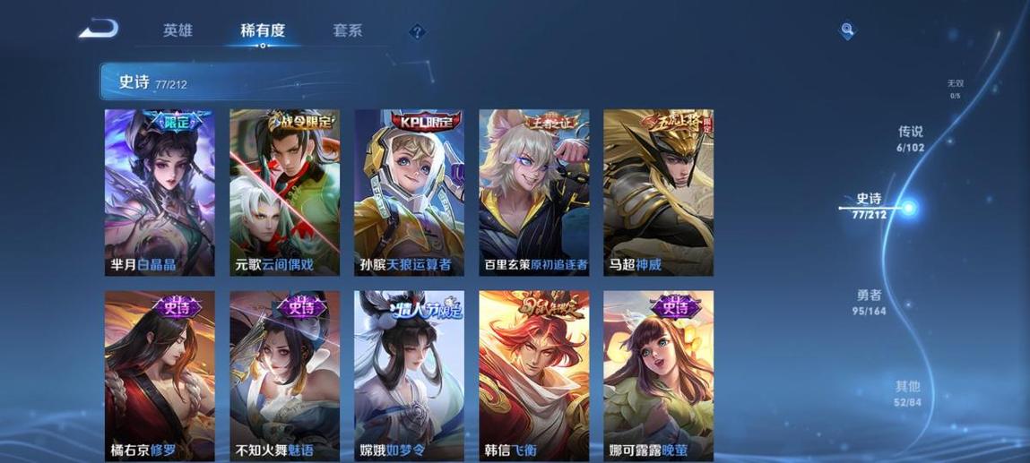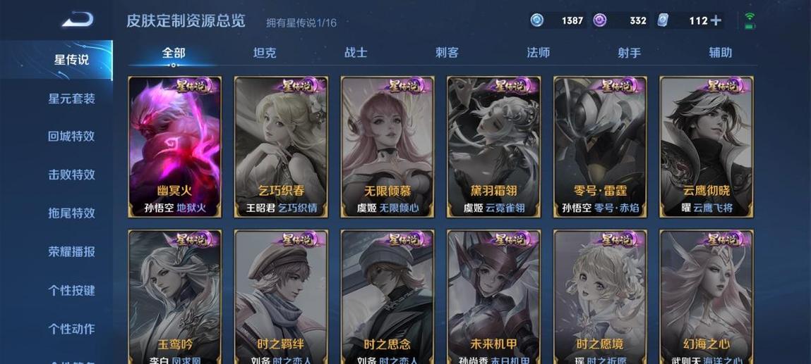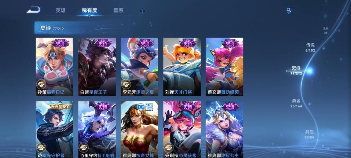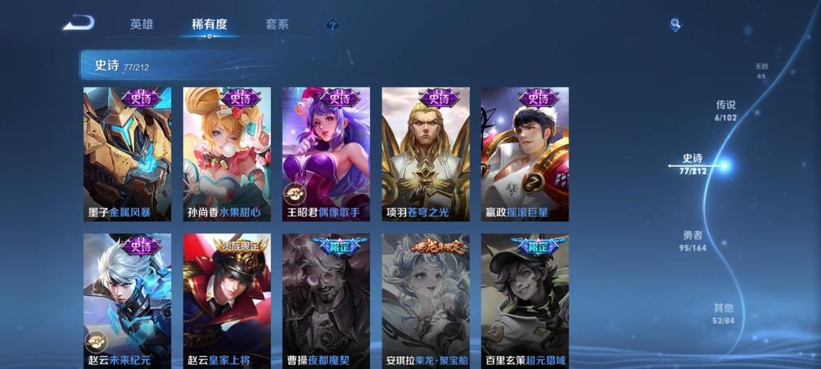典韋-藍色畫面警告,明世隱-吟遊魔法,韓信-飛衡,嫦娥-拒霜思,米萊狄-胡桃異想國,嫦娥-如夢令,趙雲-百木心槍,蘭陵王-馴魔獵人,狄仁傑-魔術師,百里玄策-原初追逐者,孫悟空-孫行者,孫悟空-至尊寶,干將莫邪-真愛魔法,豬八戒-豬悟能,馬可波羅-逐夢之星,鬼谷子-五穀豐年,狂鐵-電玩高手,羋月-白晶晶,元歌-雲間偶戲,夢奇-頑趣,馬超-神威,阿古朵-江河有靈,孫臏-天狼運算者,蔡文姬-繁星吟遊,上官婉兒-梁祝,趙雲-皇家上將,元歌-無心,曹操-天狼征服者,李元芳-銀河之約,雅典娜-神奇女俠,魯班七號-獅舞東方,黃忠-火炮紳士,老夫子-航海奇遇記,雅典娜-黎明之約,莊周-高山流水