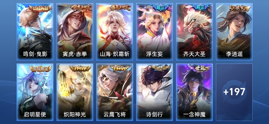 蘭陵王-隱刃,張飛-亂世虎臣,女媧-尼羅河女神,豬八戒-潮玩探月行,明世隱-虹雲星官,王昭君-幻想奇妙夜,劉邦-德古拉伯爵,關羽-天啟騎士,李信-灼熱之刃,裴擒虎-街頭旋風,大喬-守護之力,牛魔-西部大鏢客,海月-幻泉霧影,高漸離-金屬狂潮,姜子牙-熾熱元素使,狄仁傑-錦衣衛,鏡-冰刃幻境,老夫子-潮流仙人,戈婭-危途狂花,亞瑟-死亡騎士,老夫子-功夫老勺,亞瑟-心靈戰警,孫悟空-西部大鏢客,劉邦-虎嘯劍宗,趙懷真-太極少年,雲中君-荷魯斯之眼,墨子-金屬風暴,瀾-孤獵,亞連-破局者,趙雲-未來紀元,諸葛亮-星航指揮官,娜可露露-晚螢,鬼谷子-阿摩司公爵,甄姬-冰雪圓舞曲,魯班大師-乓乓大師,韓信-街頭霸王,孫策-海之征途,曜-歸虛夢演,白起-星夜王子,伽羅-花見巫女,阿軻-愛心護理,孫臏-歸虛夢演,劉禪-紳士熊喵,百里守約-絕影神槍,蘭陵王-暗隱獵獸者,典韋-黃金武士,盾山-圓桌騎士,不知火舞-魅語,孫尚香-水果甜心,甄姬-花好人間,劉邦-聖殿之光,狄仁傑-鷹眼統帥,花木蘭-兔女郎,沈夢溪-鯊炮海盜貓,米萊狄-精準探案法,劉備-漢昭烈帝,諸葛亮-掌控之力,姜子牙-時尚教父,諸葛亮-黃金分割率,劉禪-英喵野望,司馬懿-暗淵魔法,劉禪-秘密基地,李白-範海辛,弈星-踏雪尋梅,阿軻-節奏熱浪,蘇烈-堅韌之力,李元芳-逐浪之夏,扁鵲-化身博士,露娜-瓷語鑑心,瀾-賞金獵手,蘇烈-愛與和平,牛魔-制霸全明星,魯班七號-福祿兄弟,趙雲-忍·炎影,百里玄策-威尼斯狂歡,王昭君-精靈公主,雲纓-赤焰之纓,妲己-少女阿狸,司馬懿-魘語軍師,劉禪-喚靈魔甲,白起-白色死神,魯班大師-歸虛夢演,鎧-曙光守護者,桑啟-畫中遊,貂蟬-聖誕戀歌,嫦娥-露花倒影,馬超-倖存者,宮本武藏-霸王丸,露娜-紫霞仙子,孫臏-未來旅行,達摩-大發明家,程咬金-無雙福將,上官婉兒-修竹墨客,墨子-進擊墨子號,司空震-啟蟄,盤古-創世神祝,百里玄策-熱力迴旋,鬼谷子-幻樂之宴,孫策-貓狗日記,蒙犽-歸虛夢演,橘右京-修羅,關羽-龍騰萬里,李白-千年之狐,韓信-教廷特使,蒙恬-秩序獵龍將,狂鐵-命運角鬥場,劉備-紐約教父,張良-一千零一夜,夏洛特-永晝,劉備-萬事如意,貂蟬-異域舞娘,哪吒-次元突破,馬可波羅-激情綠茵,李白-敏銳之力,雅典娜-戰爭女神,張良-繽紛繪卷,張良-古海尋蹤,元歌-午夜歌劇院,楊戩-埃及法老,孫尚香-沉穩之力,夏侯惇-乘風破浪,鍾馗-地府判官,程咬金-愛與正義,宮本武藏-鬼劍武藏,羋月-紅桃皇后,成吉思汗-維京掠奪者,夏侯惇-戰爭騎士,鍾無豔-海灘麗影,項羽-帝國元帥,狂鐵-特工戰影,典韋-鐵甲之心,呂布-聖誕狂歡,鎧-龍域領主,小喬-丁香結,妲己-女僕咖啡,蒙恬-蔚藍守將,艾琳-流音漫舞,東皇太一-東海龍王