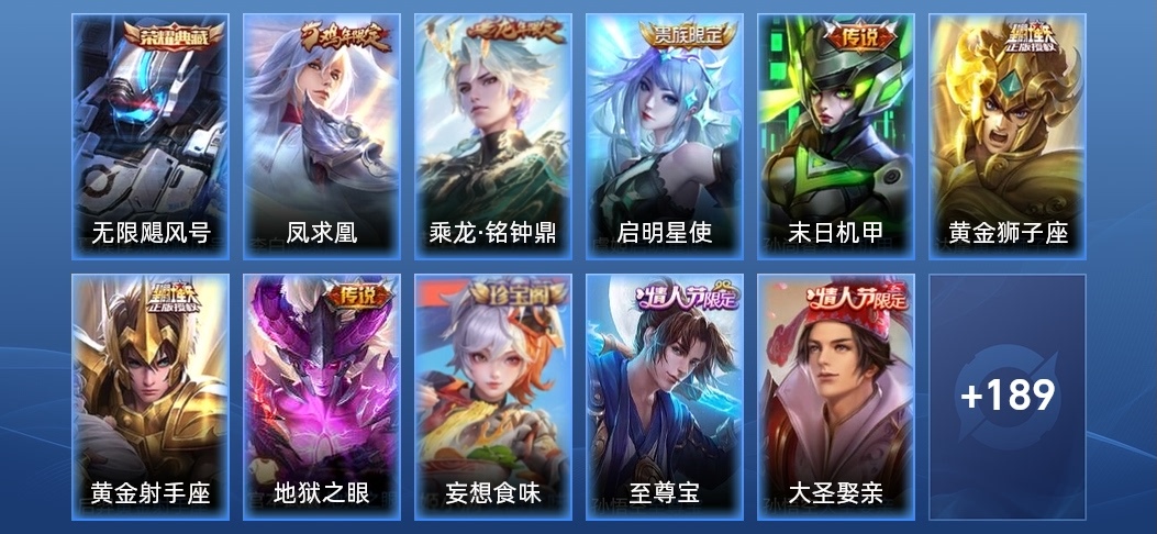 蘭陵王-隱刃,花木蘭-劍舞者,李元芳-特種部隊,豬八戒-潮玩探月行,明世隱-虹雲星官,夢奇-美夢成真,沈夢溪-棒球奇才,妲己-紫羅蘭之誓,關羽-天啟騎士,李信-灼熱之刃,大喬-守護之力,裴擒虎-街頭旋風,高漸離-金屬狂潮,呂布-野性能量,豬八戒-年年有餘,姜子牙-熾熱元素使,鏡-冰刃幻境,老夫子-潮流仙人,李元芳-妄想特派,曹操-幽靈船長,老夫子-功夫老勺,亞瑟-心靈戰警,宮本武藏-永珍初新,孫悟空-西部大鏢客,劉邦-虎嘯劍宗,安琪拉-如懿,墨子-金屬風暴,瀾-孤獵,百里守約-特工魅影,程咬金-功夫廚神,趙雲-未來紀元,諸葛亮-星航指揮官,鬼谷子-阿摩司公爵,甄姬-冰雪圓舞曲,魯班大師-乓乓大師,露娜-緋紅之刃,韓信-街頭霸王,阿軻-致命風華,趙雲-白執事,花木蘭-水晶獵龍者,韓信-白龍吟,孫策-海之征途,曜-歸虛夢演,孫臏-歸虛夢演,伽羅-花見巫女,劉禪-紳士熊喵,蘭陵王-暗隱獵獸者,百里守約-絕影神槍,典韋-黃金武士,盾山-圓桌騎士,孫尚香-水果甜心,甄姬-花好人間,狄仁傑-鷹眼統帥,花木蘭-兔女郎,沈夢溪-鯊炮海盜貓,劉備-漢昭烈帝,周瑜-海軍大將,雅典娜-冰冠公主,諸葛亮-黃金分割率,嬴政-搖滾巨星,劉禪-秘密基地,弈星-踏雪尋梅,黃忠-芝加哥教父,李白-範海辛,阿軻-節奏熱浪,蘇烈-堅韌之力,李元芳-逐浪之夏,扁鵲-化身博士,小喬-萬聖前夜,蘇烈-愛與和平,魯班七號-福祿兄弟,趙雲-忍·炎影,百里玄策-威尼斯狂歡,妲己-少女阿狸,雲纓-赤焰之纓,司馬懿-魘語軍師,后羿-精靈王,魯班大師-歸虛夢演,桑啟-畫中遊,貂蟬-聖誕戀歌,馬超-倖存者,宮本武藏-霸王丸,宮本武藏-未來紀元,廉頗-地獄巖魂,露娜-紫霞仙子,達摩-大發明家,程咬金-無雙福將,上官婉兒-修竹墨客,張飛-五福同心,墨子-進擊墨子號,司空震-啟蟄,盤古-創世神祝,鬼谷子-幻樂之宴,蒙犽-歸虛夢演,沈夢溪-月團寄思,魯班七號-木偶奇遇記,虞姬-加勒比小姐,李白-千年之狐,韓信-教廷特使,關羽-龍騰萬里,馬可波羅-潮玩牛仔,項羽-蒼穹之光,狂鐵-命運角鬥場,劉備-紐約教父,劉備-萬事如意,干將莫邪-第七人偶,王昭君-偶像歌手,蔡文姬-薔薇王座,哪吒-次元突破,馬可波羅-激情綠茵,李白-敏銳之力,暃-碧珀緋影,雅典娜-戰爭女神,張良-古海尋蹤,達摩-拳王,元歌-午夜歌劇院,楊戩-埃及法老,孫尚香-沉穩之力,鍾馗-地府判官,成吉思汗-維京掠奪者,夏侯惇-戰爭騎士,鍾無豔-海灘麗影,狂鐵-特工戰影,典韋-鐵甲之心,安琪拉-玩偶對對碰,呂布-聖誕狂歡,小喬-丁香結,鎧-龍域領主,妲己-女僕咖啡,太乙真人-圓桌騎士,東皇太一-東海龍王